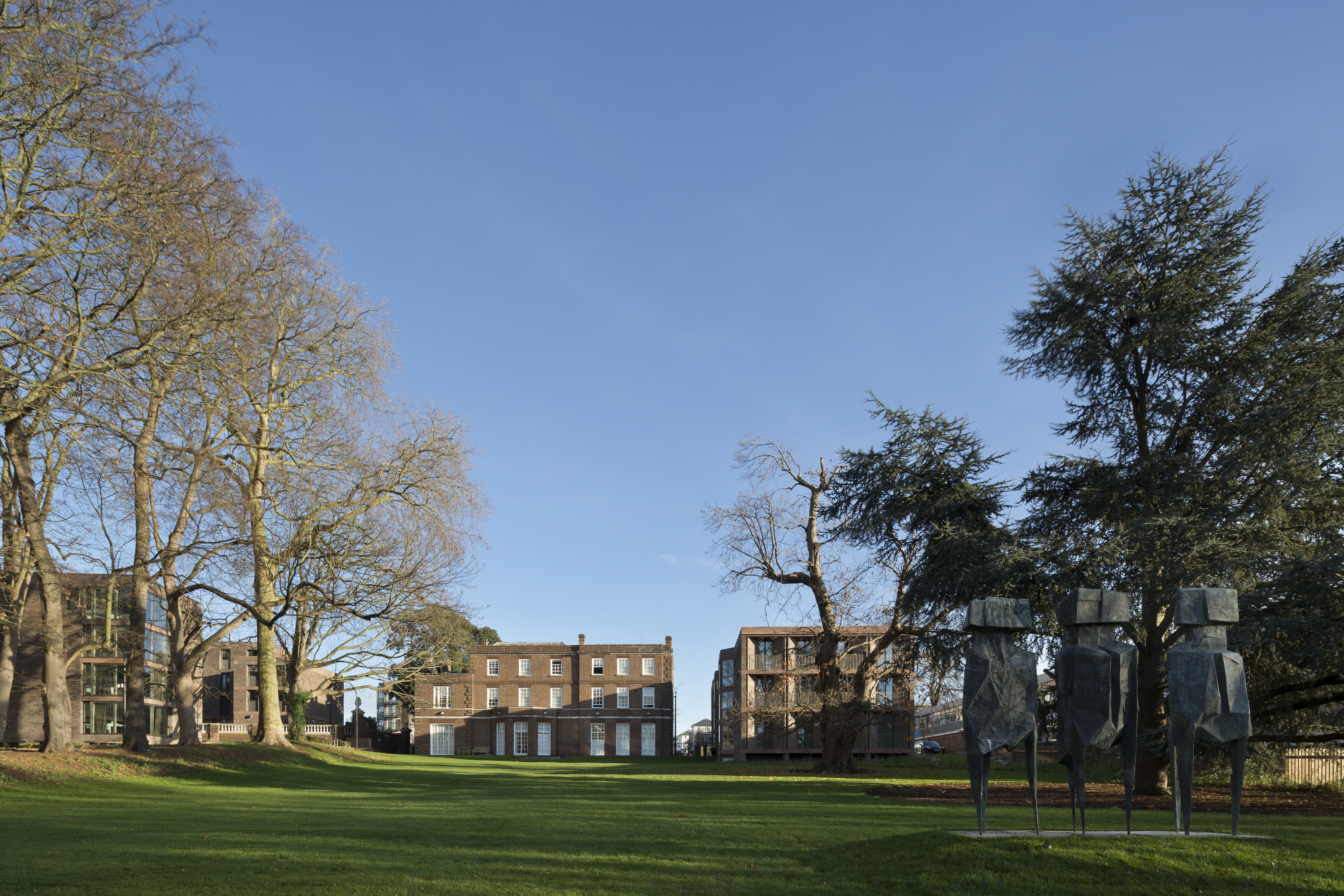 Downshire House's garden elevation and South Court seen from west. Lynn Chadwick's The Watchers has been reinstated in the grounds