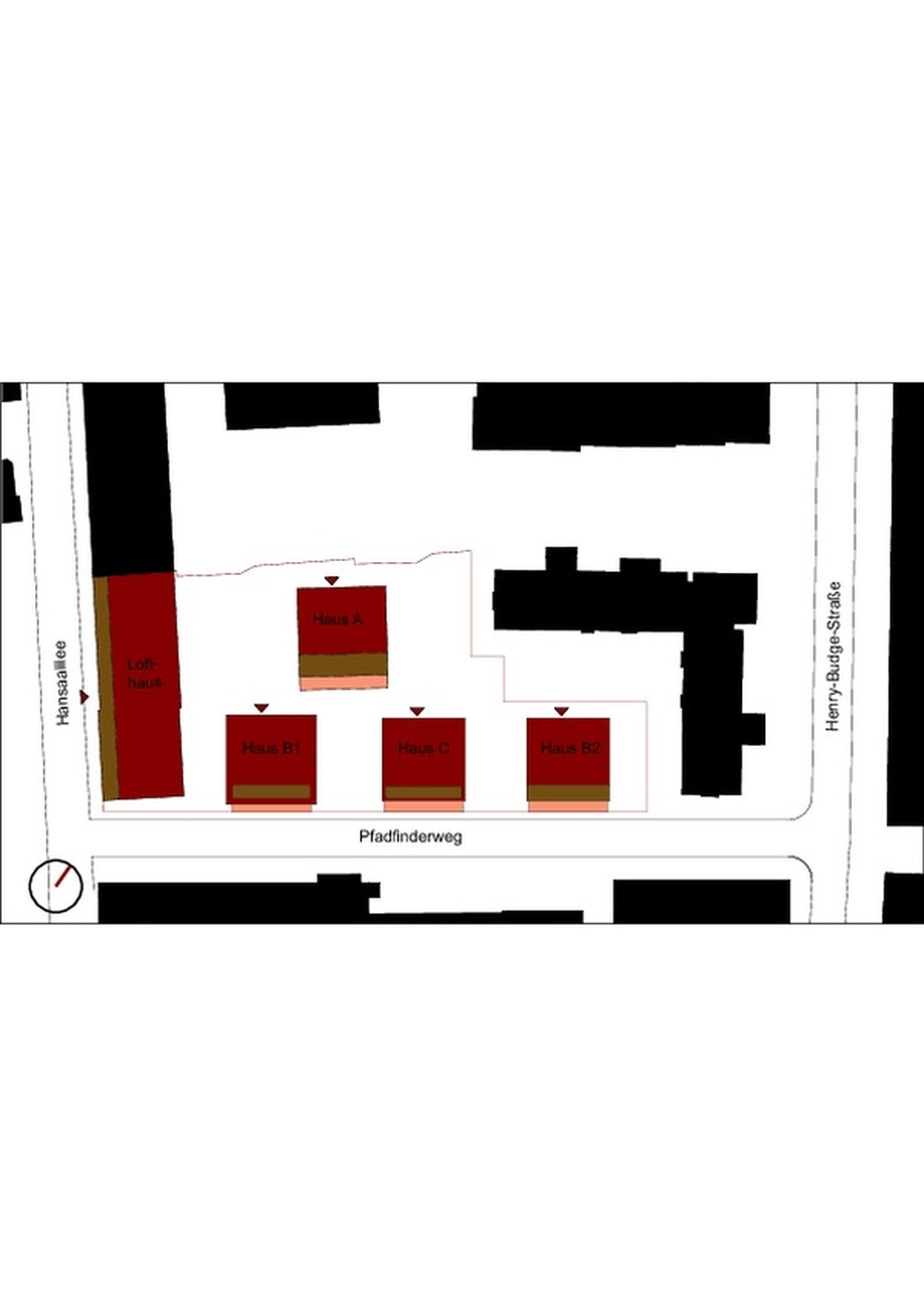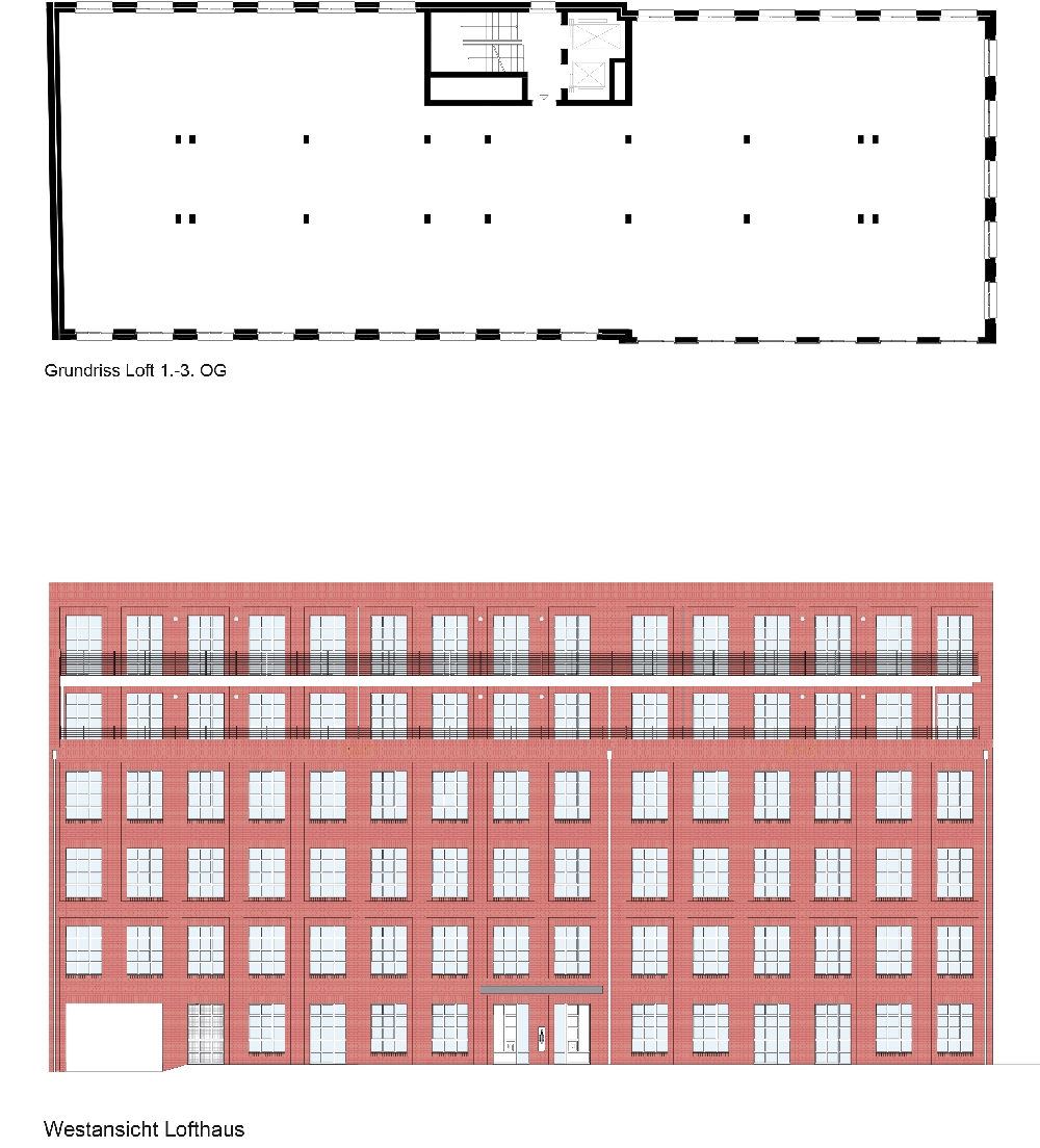 Hansahöfe | Grundriss, Westansicht Lofthaus