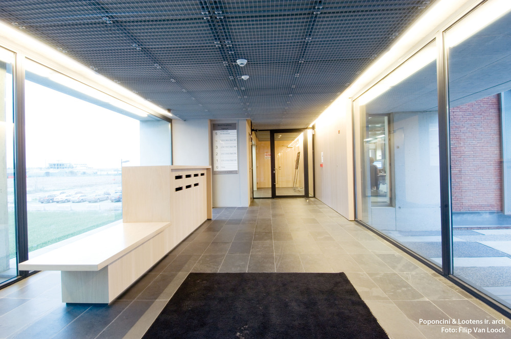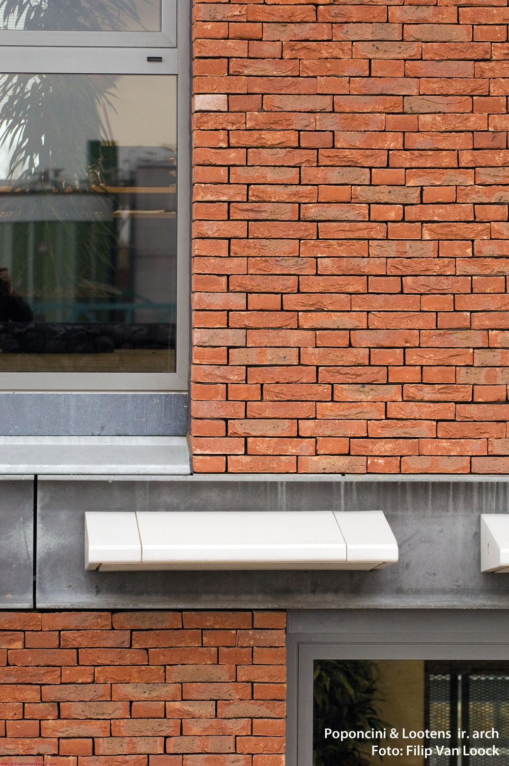 The whole team consists actually of 55 architects and engineer architects, one interior architect, two draftsmen and two administrative employees. For more complex programmes, external advisors are added to the team, such as engineers, landscape architects, artists, project- managers, etc. There is a great variety in programmes the office is dealing with: individual and collective housing, social housing, interior design, educational buildings, banks, offices, industrial projects and urban planning; new buildings as well as renovation, private and public buildings. This big diversity is a well- planned strategy and probably one of the main characteristics of the firm: gaining knowledge in one field helps to understand others, the architect as a generator of concepts, aided by specialists. Whereas programmes vary, the design method, remains the same, independent from scale: trying to embed specific programmes into a specific site, with respect of user’s aims, the built and non-built environment, the costs, sustainability, …. Most buildings designed by Poponcini & Lootens, have a different morphology, as they are designed for a specific programme, in a specific place, and both elements differ in every project. As a result, the Architecture follows a logic whereby construction, form and programme go hand in hand, with respect for the environment.