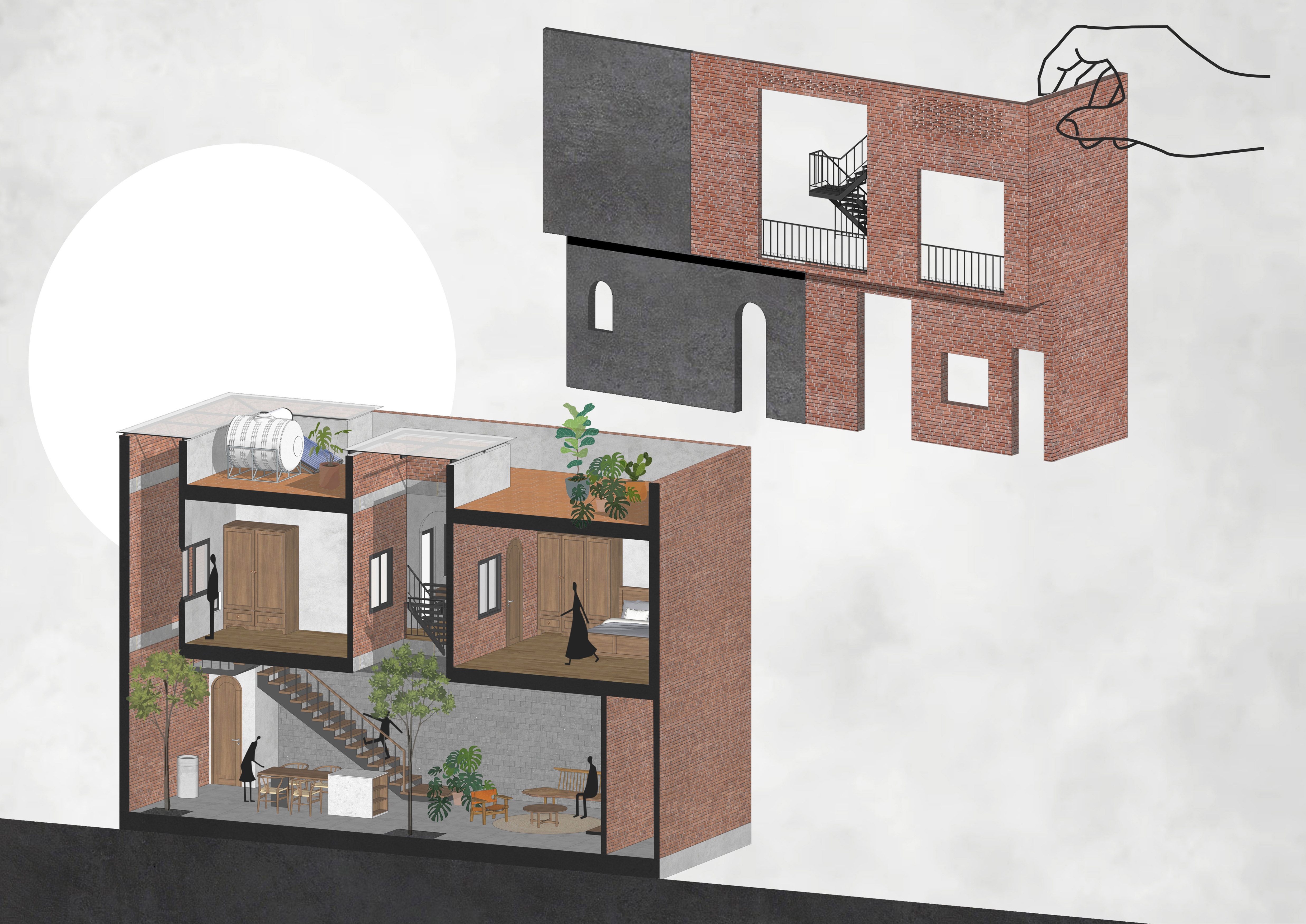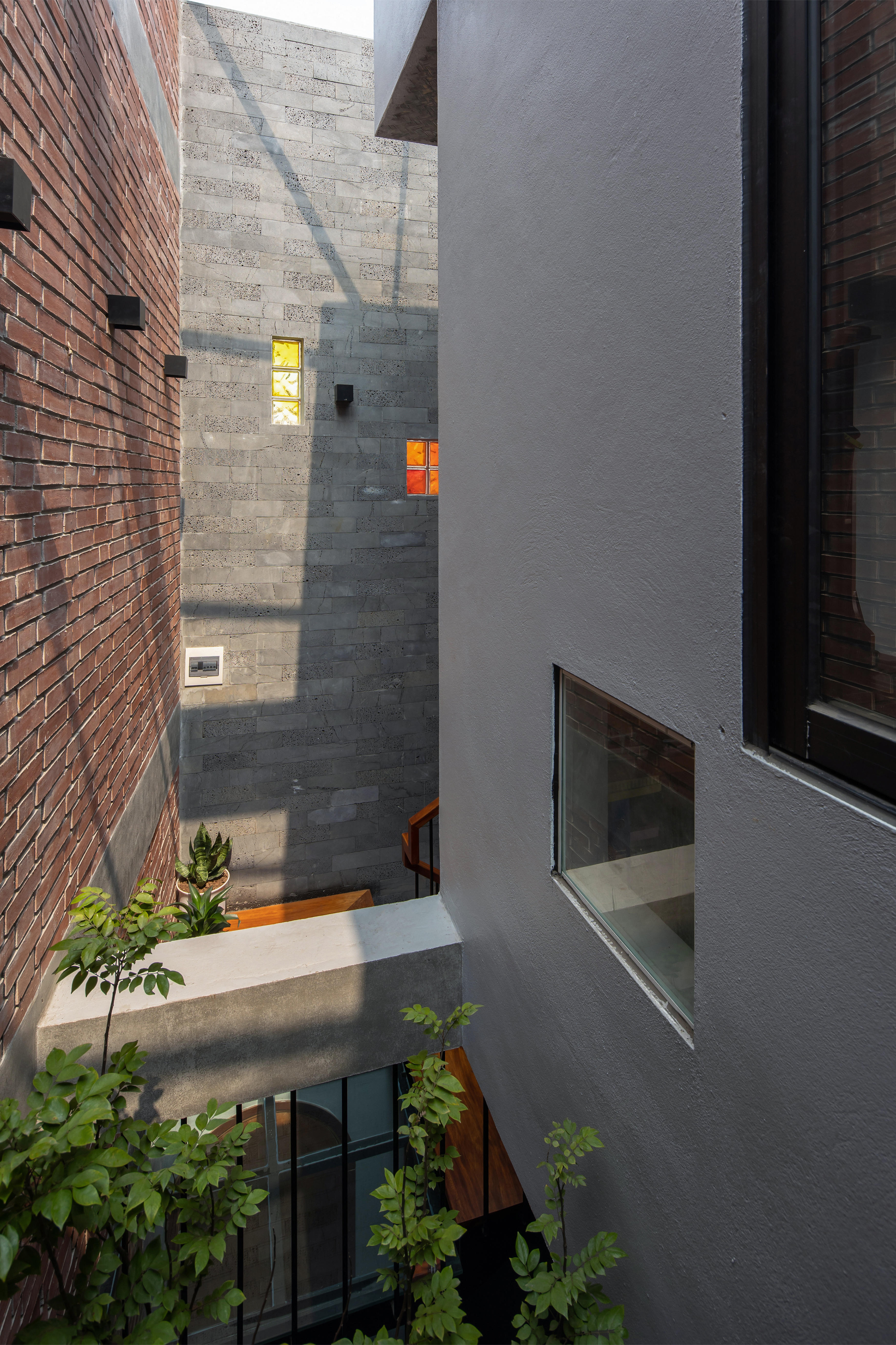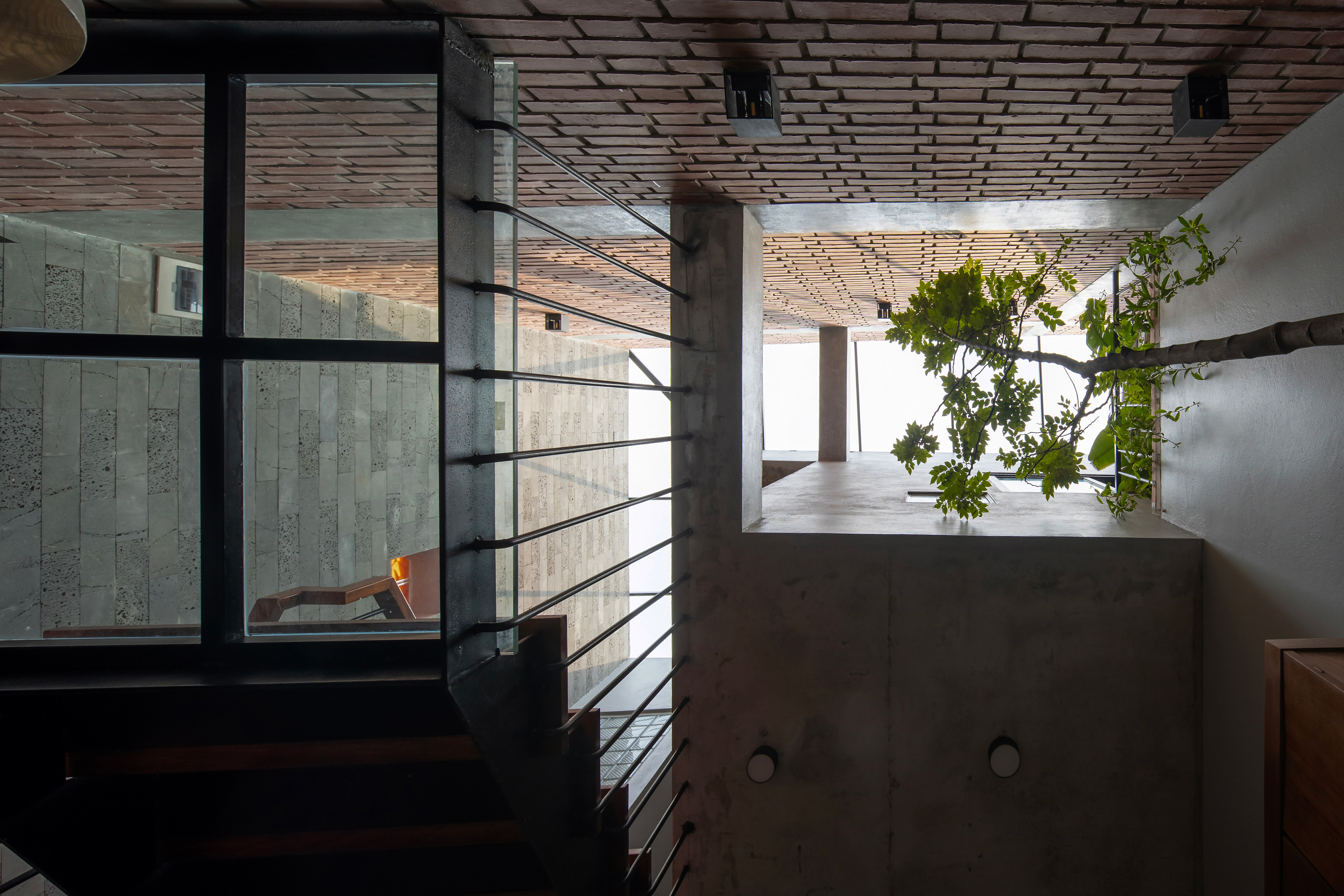 The architects would like to bring solutions for tube houses: saving electrical energy (lights, fans, air condition...) and limiting the impact to the environment. We use locally available raw materials and do handmade which cost savings to bring a sustainable project. Therefore, bare brick, bare concrete, grinding stone, natural oak combined with iron stairs are the main materials used for the project with the desire to create rusticity and have a connection to nature.