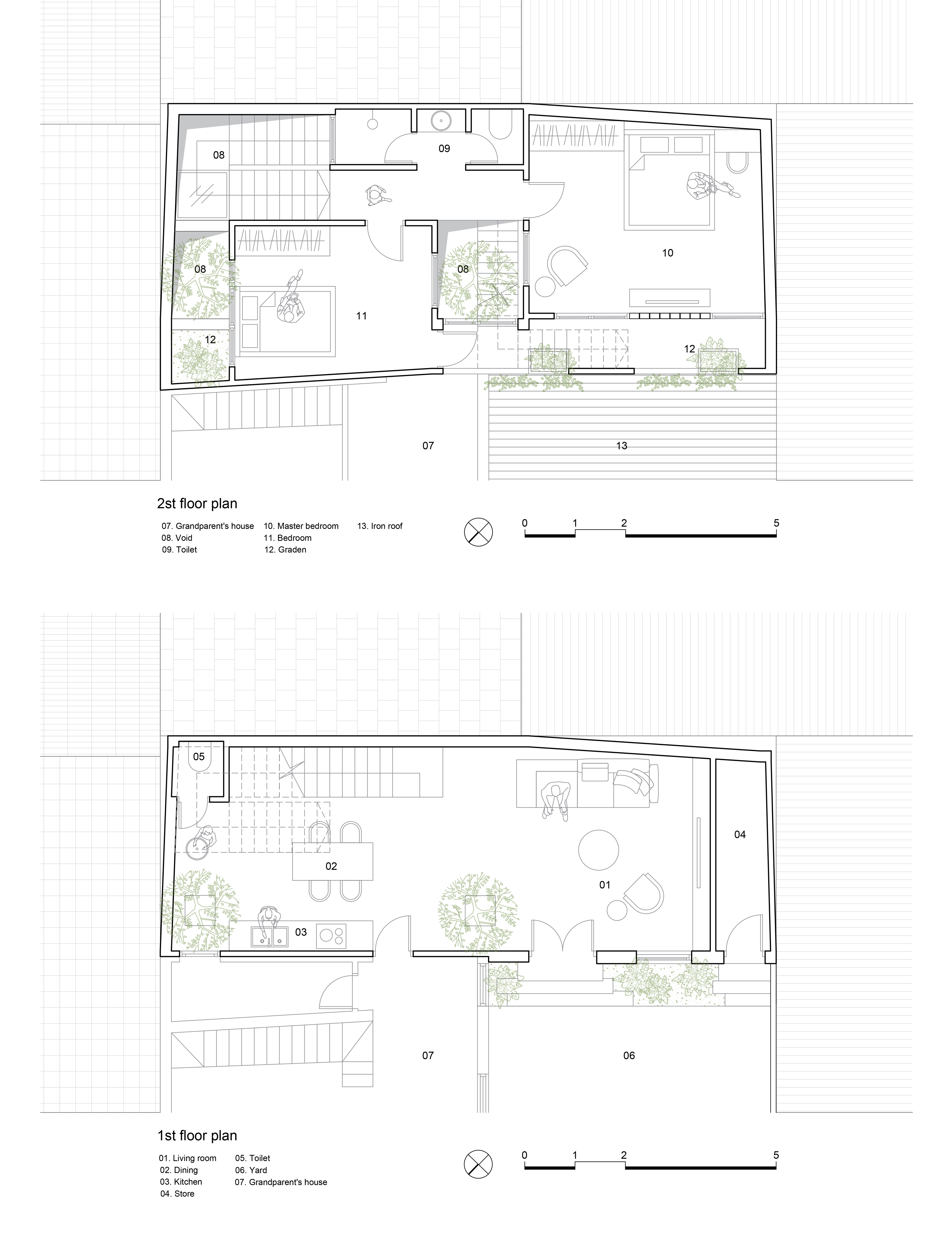 Small and narrow tube houses are very popular in Hanoi capital in particular and in the other Vietnam urban areas in general. This house has the same features with only one small façade, shortage of light and in frequent dampness. The architects from the Tung Nguyen Architects Office have come up with a solution to design more atriums to get maximum light and wind and increase the open space that is always dry for the house. The green trees are arranged alternately in the atriums to regulate the cool air as well as limit the direct sunlight.