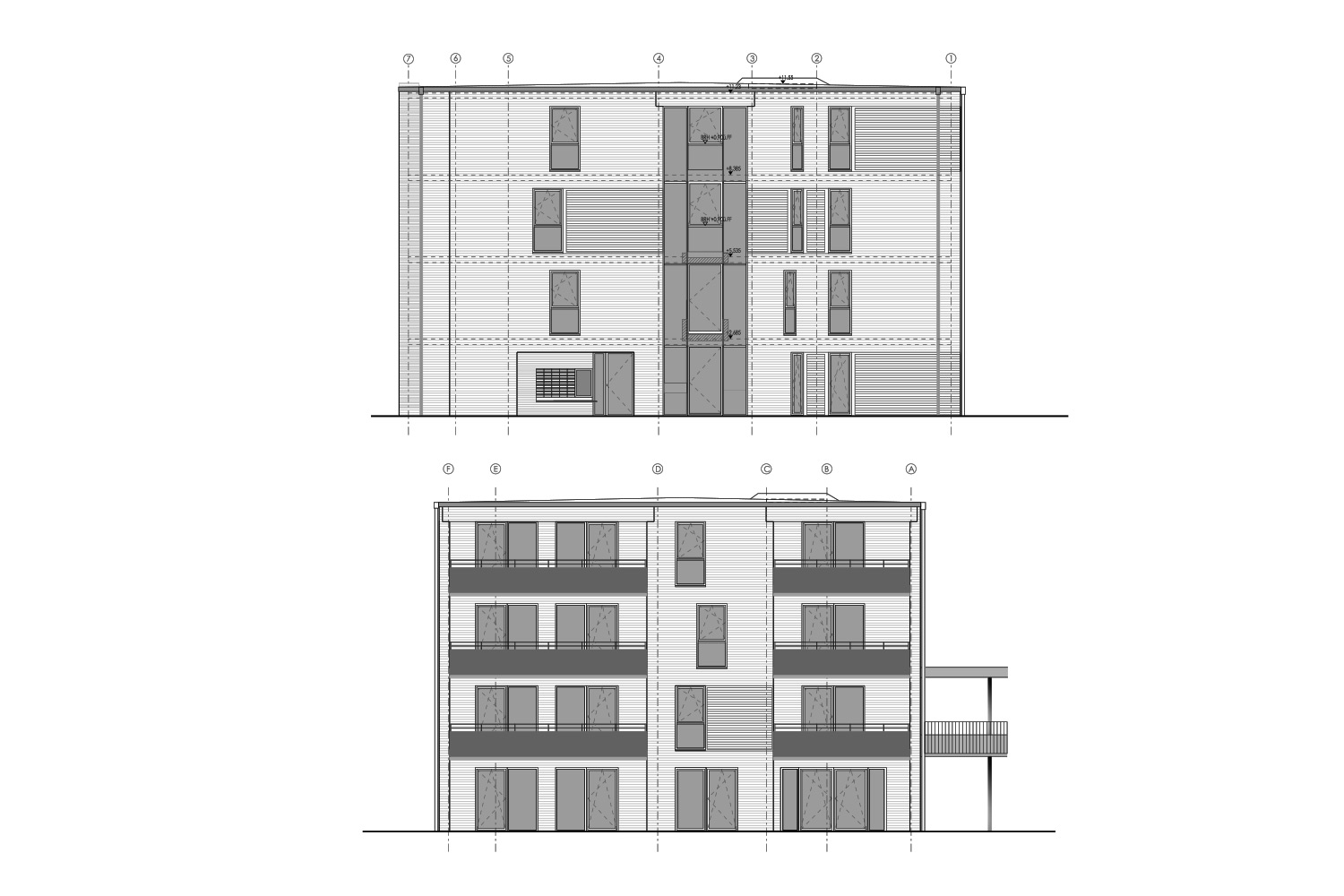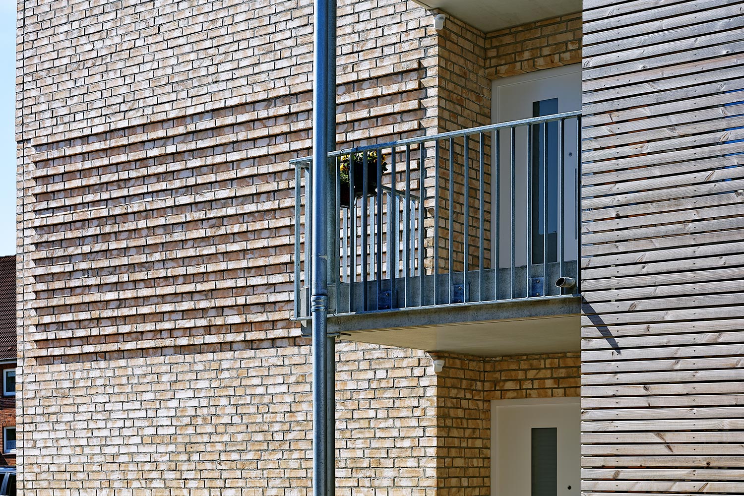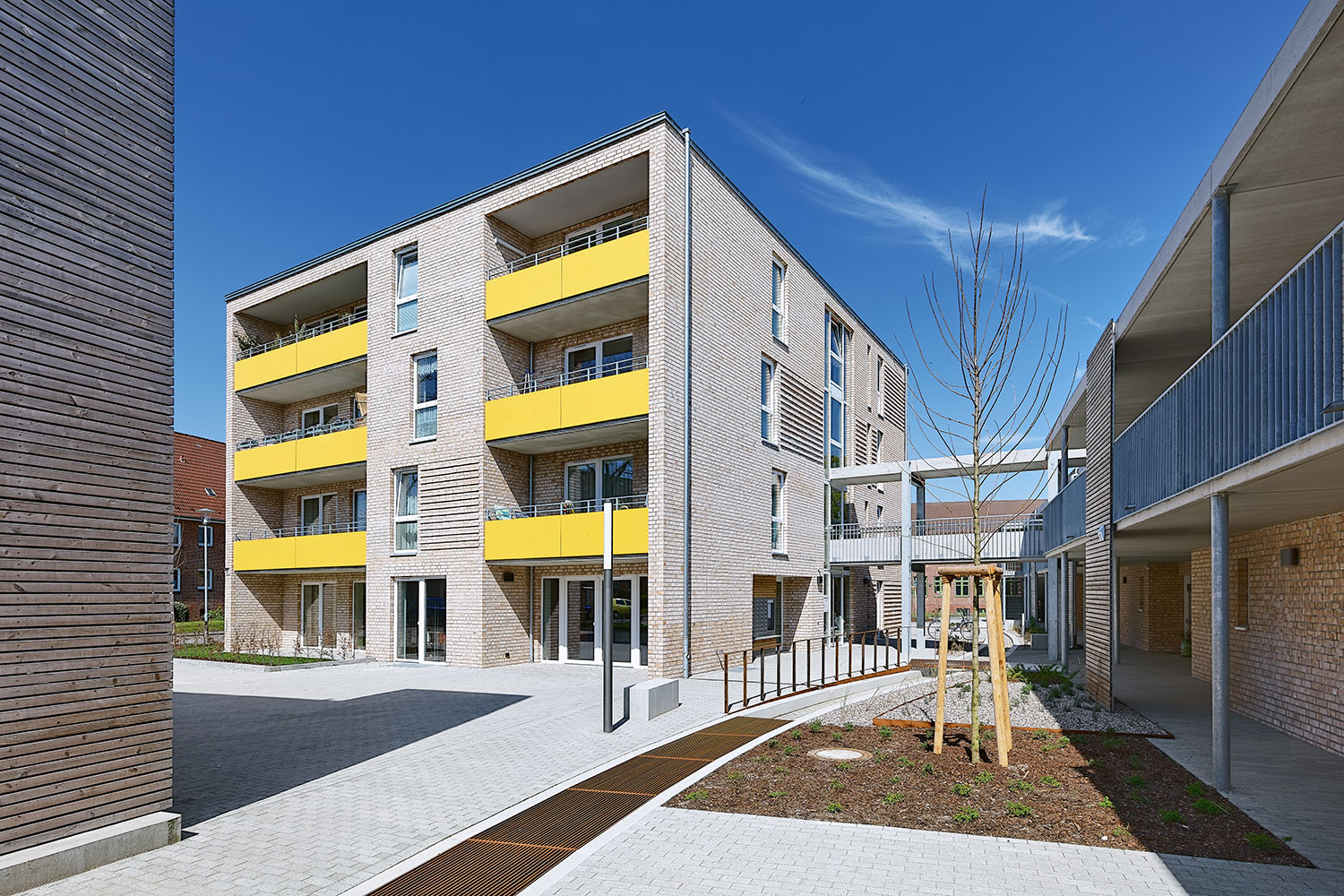 Die Wohnanlage mit ihren Laubengängen und den belebten Innenhof sollte für die Bewohner eine hohe Aufenthaltsqualität erhalten. Dadurch war ein warmes Material für die Fassade gesetzt. Die Wahl fiel auf einen hellgelben Wasserstrichziegel in Normalformat, der im wilden Verband verarbeitet und mit einer grauen Fuge geschlossen wurde. Die Fassaden wurden in Einzelflächen mit verspringenden Steinschichten aufgelockert. Weitere gliedernde und gestaltende Elemente sind die holzbekleideten Treppenhäuser und Zwischenbauten.