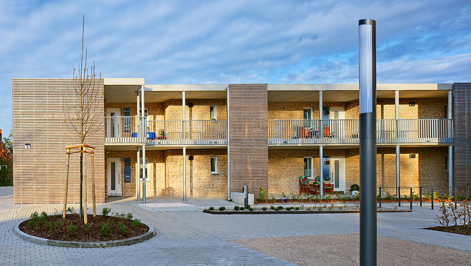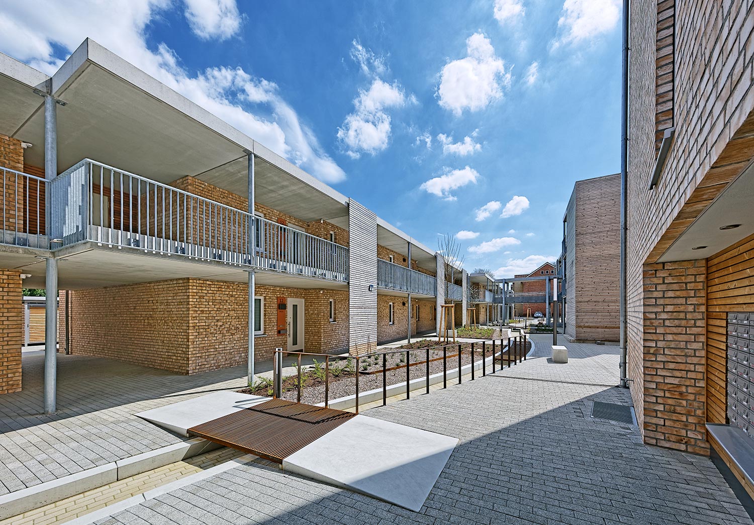 Im Zuge einer Nachverdichtung wurde in einer vorhandenen Siedlungsstruktur in zentraler Lage in Büdelsdorf Wohnraum geschaffen, der im Wesentlichen für ein älteres Klientel bestimmt ist. Um dieser Altersgruppe adäquate und bezahlbare Wohnungen zu bieten, wurden zwei bestehende Gebäude mit 20 Wohneinheiten aus den 1950er-Jahren abgerissen. Dort entstanden insgesamt fünf Gebäude mit 43 Wohneinheiten.