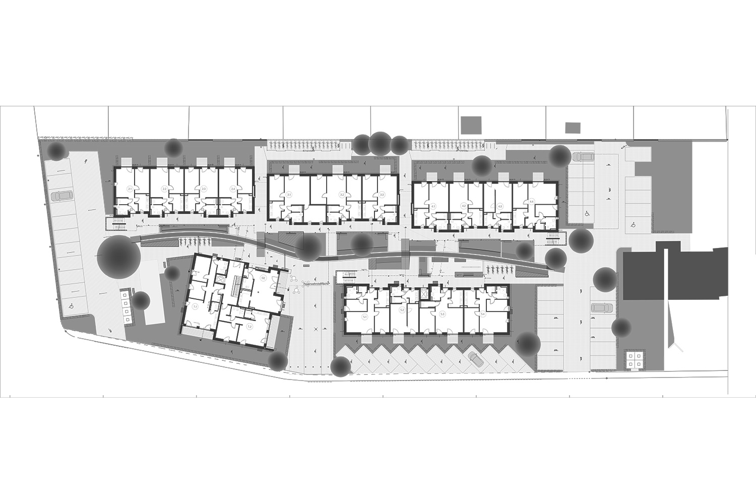 Zwei Brücken verbinden die Laubengänge, gliedern den Freiraum in seiner Länge und verbinden die zwei Gebäudezeilen zu einer Einheit. Über die Laubengänge sind alle Wohnungen barrierefrei erreichbar, obgleich die Anlage nur über zwei Aufzüge verfügt. Ein Gemeinschaftsraum, ein Nachbarschaftscafé, eine Gästewohnung sowie gemeinschaftliche Waschräume im Keller ergänzen das Raumangebot.