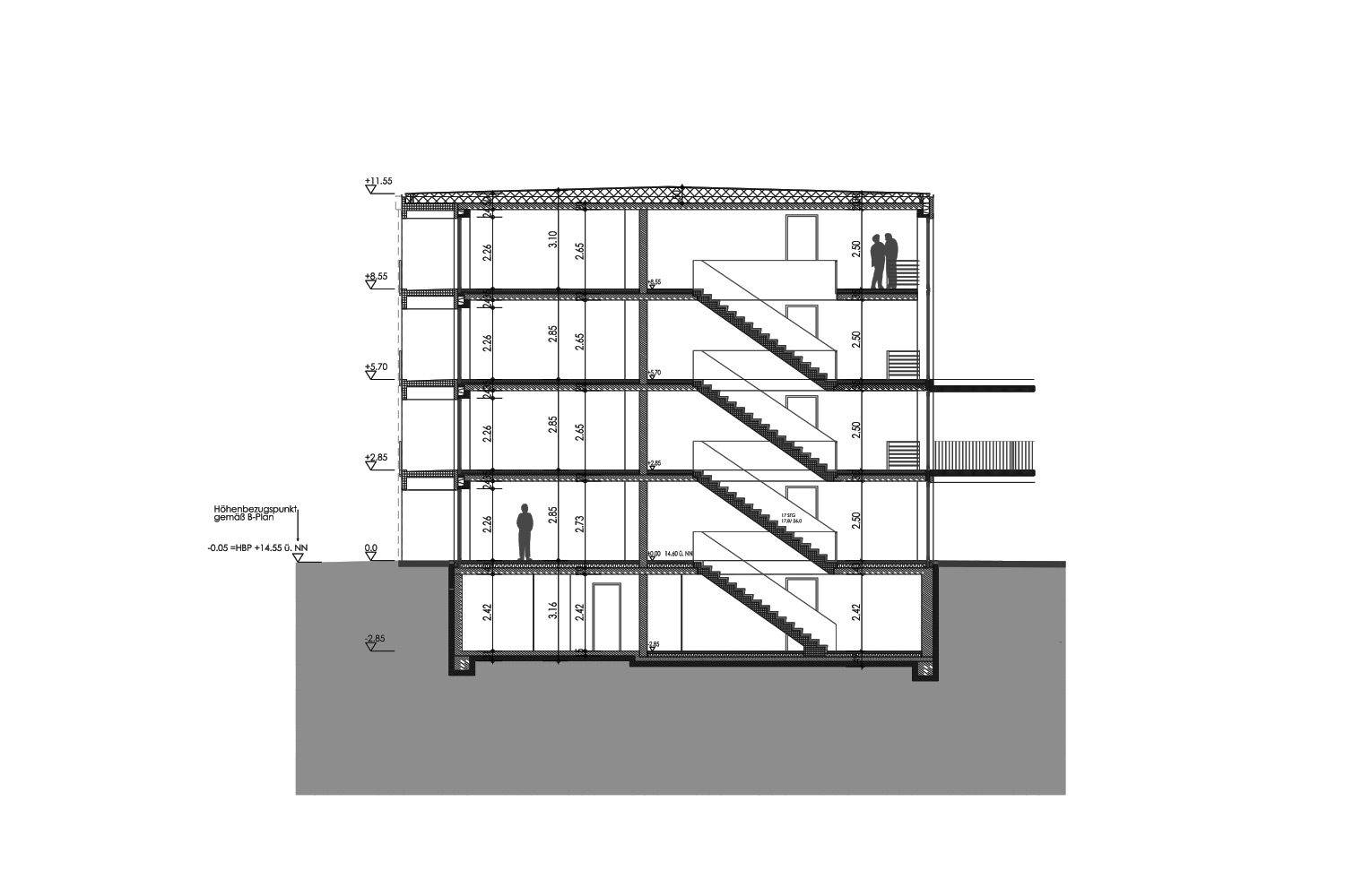Die neuen Gebäude reihen sich mit einer differenzierten Höhenentwicklung in die heterogene angrenzende Bebauung ein, die von viergeschossigen Mehrfamilienhäusern bis zu kleinteilig zerstreuten Einfamilienhäusern ein breites Spektrum von Wohnformen aufzeigt. Die Neubauten orientieren sich an einem neuen langgestreckten Innenhof. Prägendes Element ist hier eine künstliche Wasserlinie, die sich in der gesamten Länge durch den Hof zieht. Weitere Themenbereiche sind Hochbeete, Kräutergärten und eine Uferzone aus Schilfgras, die für ein angenehmes Mikroklima und eine zusätzliche Belebung des Innenhofes sorgen.