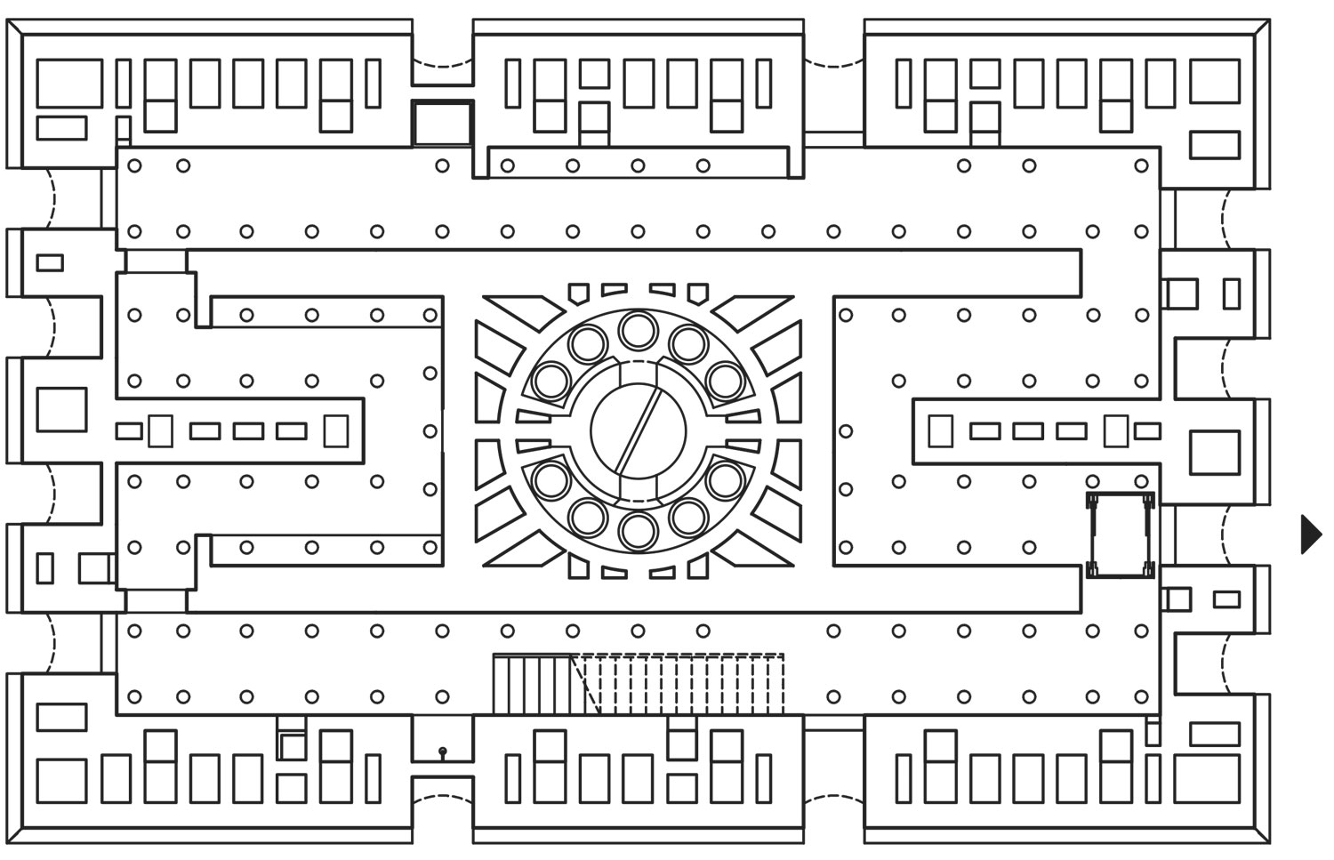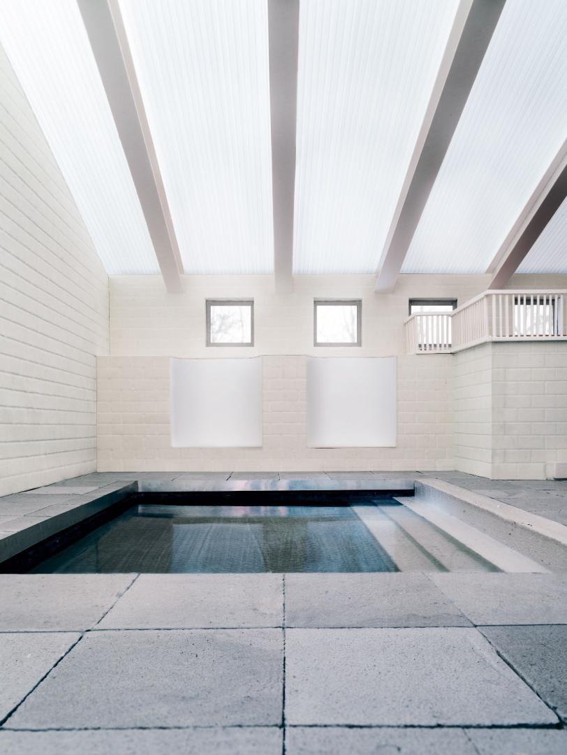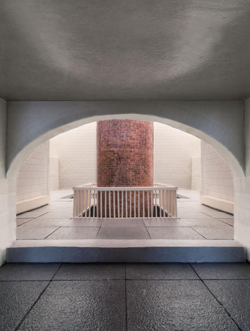 Über diesen Aufstieg (oder den Aufzug) gelangt man zur Rezeption, den Umkleiden und den Duschen. Ein Schwellenraum entschleunigt das Ankommen im Bad. Der Schornstein bleibt als Rückgrat im Innenraum erhalten, führt den Besucherstrom auf natürliche Weise zum Wasser im großen Becken und dient geschossweise der räumlichen Verortung. Mit dem Abstieg im Gebäude steigt die Temperatur der Räume, je näher man dem Ofen kommt. Vom zunehmend höhligen Kuppelbau aus können Nutzungen wie das Solebad oder das Dampfbad angesteuert werden. Monolithische Betonbänke ermöglichen neben der Bewegung im Wasser immer wieder das Verweilen am Schornstein.