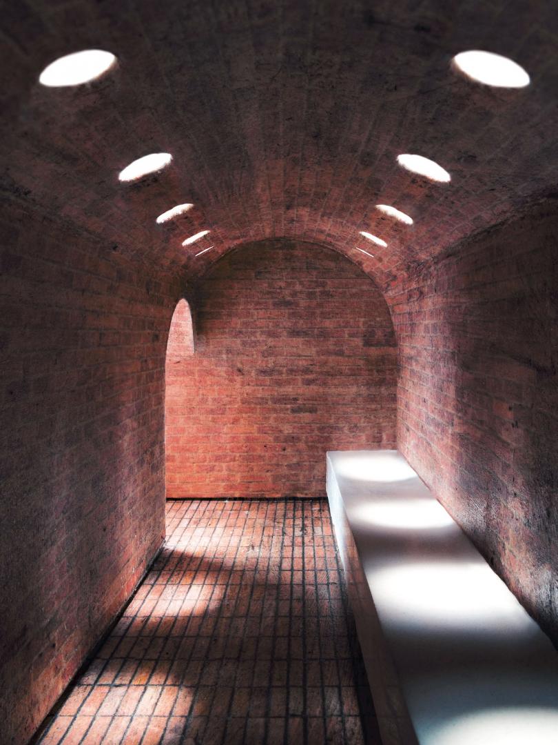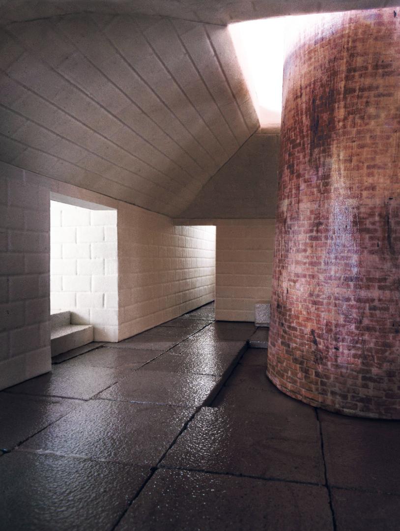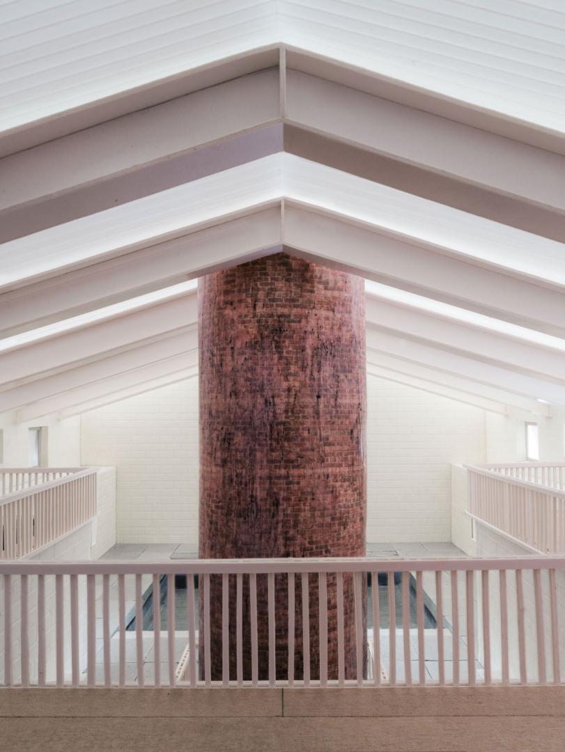 Dementsprechend wurde die Aufstockung bewusst nicht mit Steinen im Reichsformat weitergebaut. Stattdessen fördert die Anwendung verwandter Materialien die Wahrnehmung der räumlichen Fassung der ehemaligen Produktionsstätte: Gewellte und glasierte Backsteinriemchen kleiden die „Bademaschine“ ein, nehmen die Vertikalität des Schornsteins mit auf und verleihen dem Bau seine Leichtigkeit. Im Inneren fungiert das Einsteinmauerwerk aus Kalksandsteinblöcken als Wärmespeicher und fasst das Raumkontinuum. Die Haptikdiskrepanz verfugt Alt und Neu und verdeutlicht die Lesbarkeit des Entwurfsprinzips.