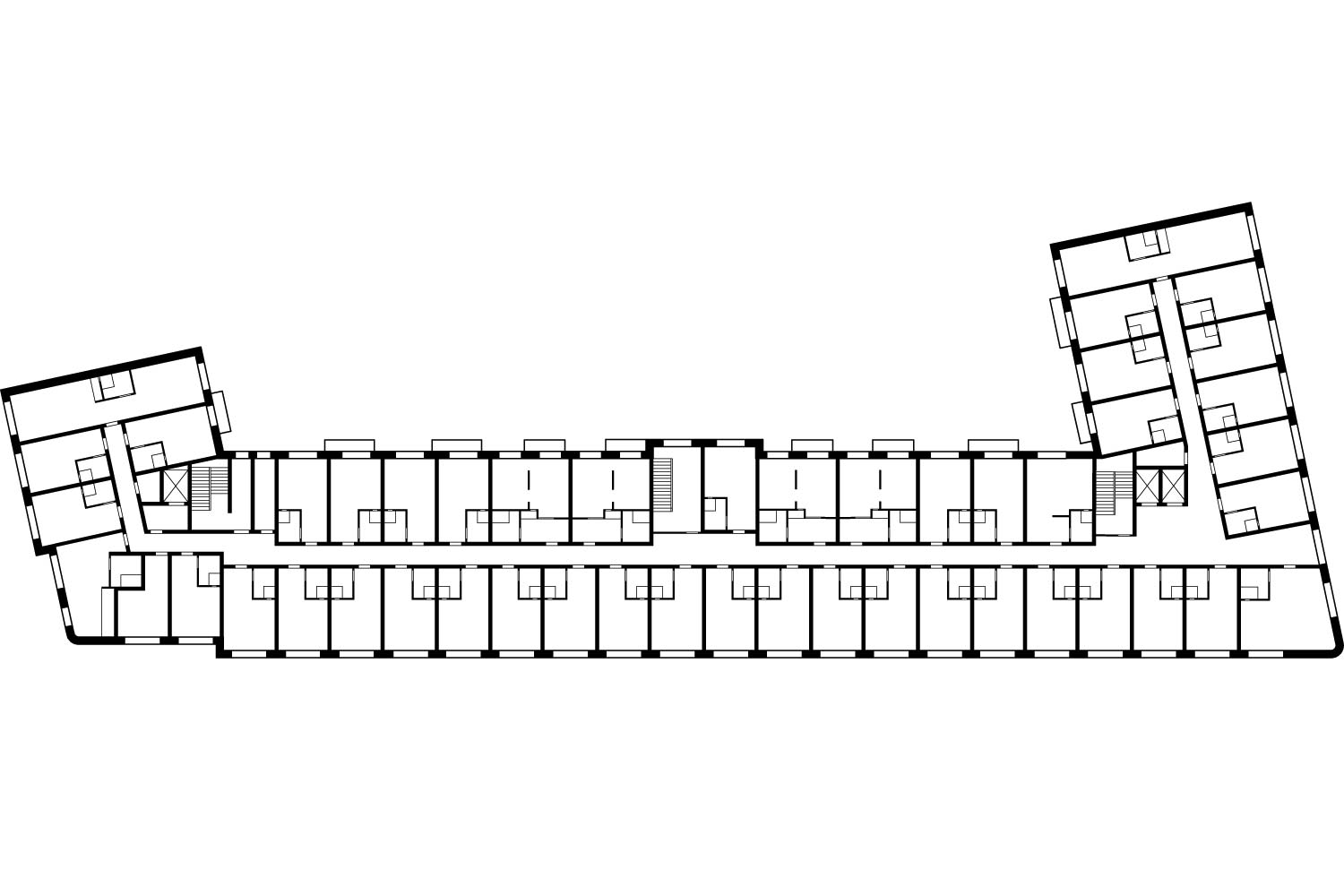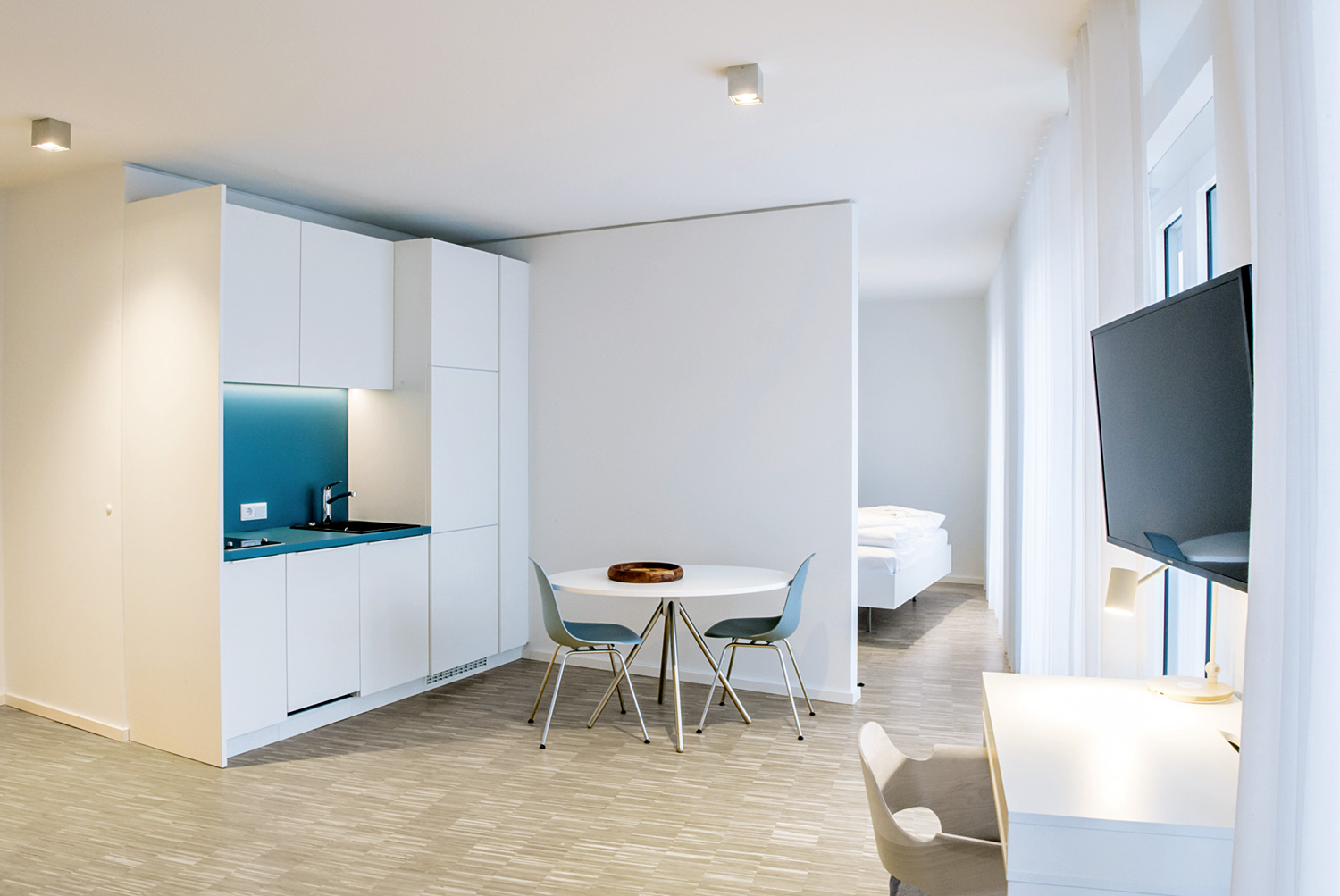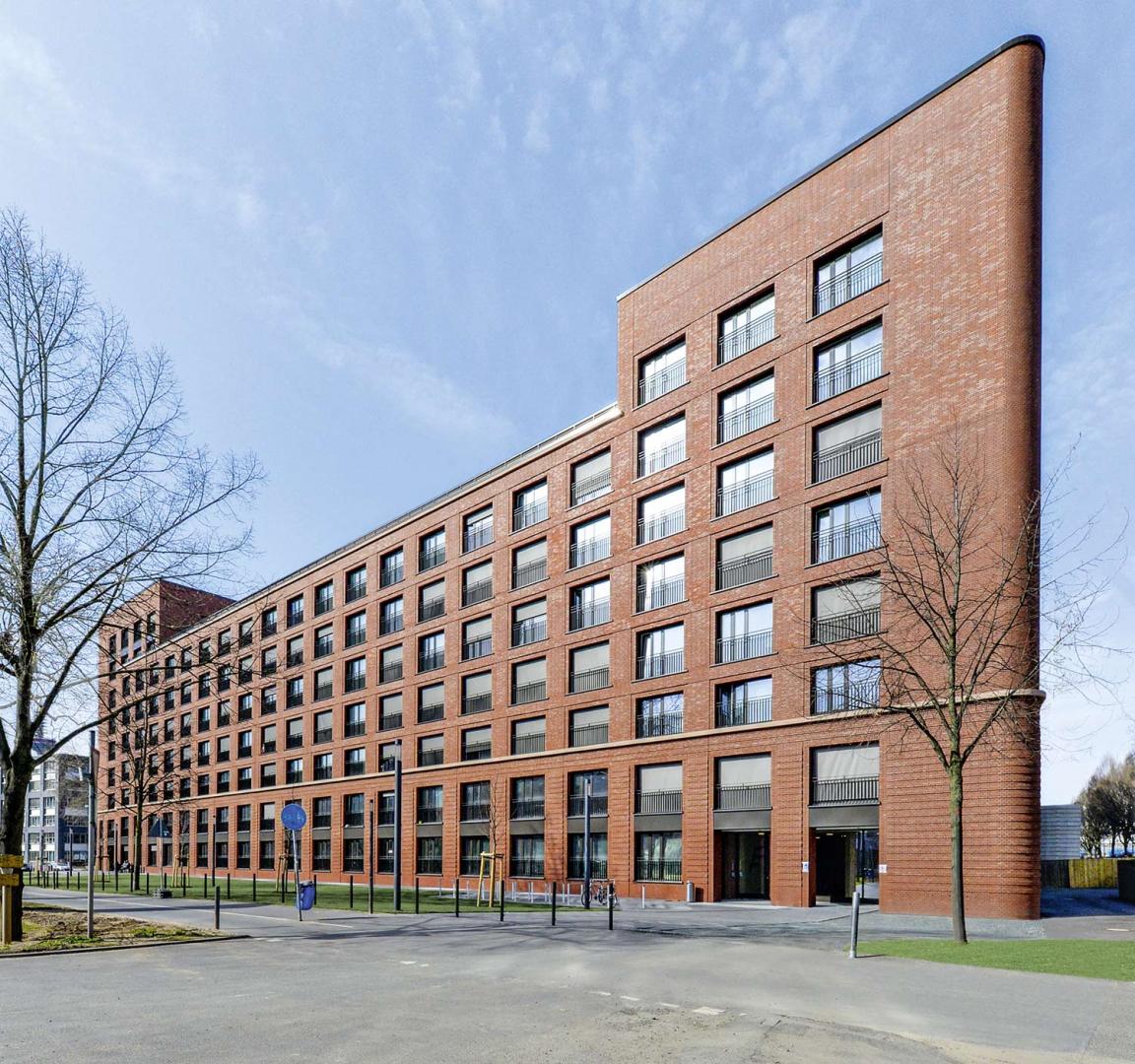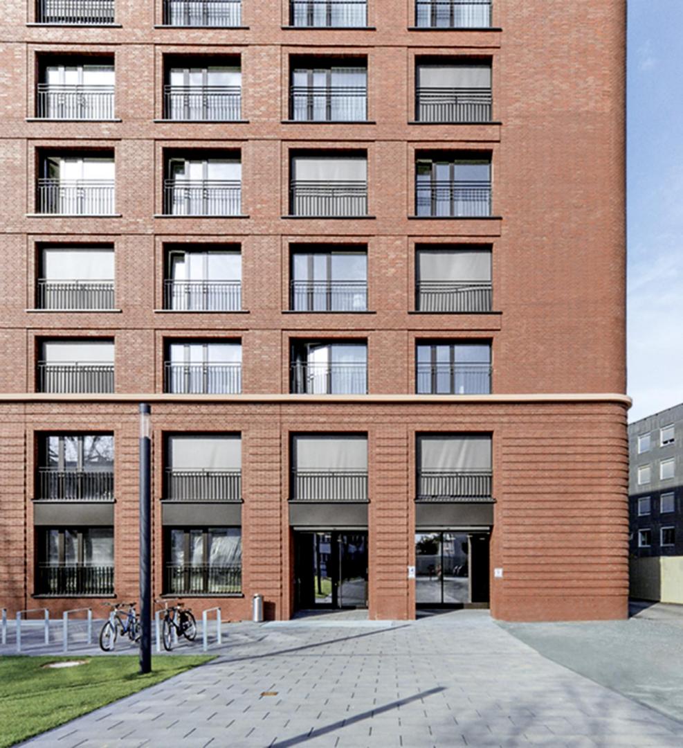 Mit seiner neutralen Rasterstruktur nimmt das Appartementhaus die Formensprache seiner Umgebung auf. Die Backsteinfassade erinnert auch an die Architektur der Neuen Sachlichkeit.