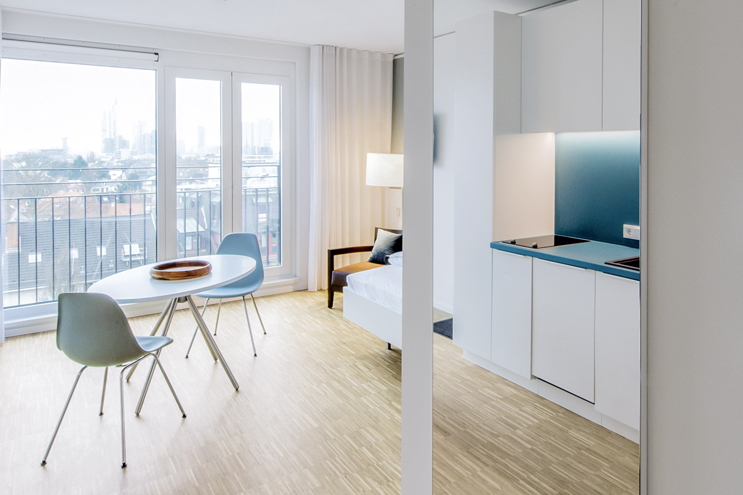 Das Gebäude für Studierende und Berufstätige steht an der vierspurigen Adickesallee zwischen dem Polizeipräsidium und dem Neubau der Frankfurt School of Finance and Management. Städtebaulich markiert der sogenannte Alleenring an dieser Stelle den Übergang von der historischen Blockrandbebauung zu einer offeneren Bebauung. Der Neubau ersetzt eines der letzten verbliebenen baulichen Relikte aus der Nachkriegszeit, als Frankfurt kurzzeitig als Hauptstadt der Bundesrepublik im Gespräch war – das ehemalige Landwirtschaftsministerium. Anstelle der ehemals offenen Bebauung entsteht nun ein städtischer Blockrand mit einer eindeutigen Raumkante zum Alleenring. Die Großform des Hauses bezieht sich auf das westlich gelegene Polizeipräsidium und die östlich anschließende Frankfurt School of Finance and Management. Mit der Übernahme der großmaßstäblichen Dimensionen seiner Nachbarbauten wird auch deren Typologie – eine robuste, neutrale Rasterstruktur – fortgeführt.