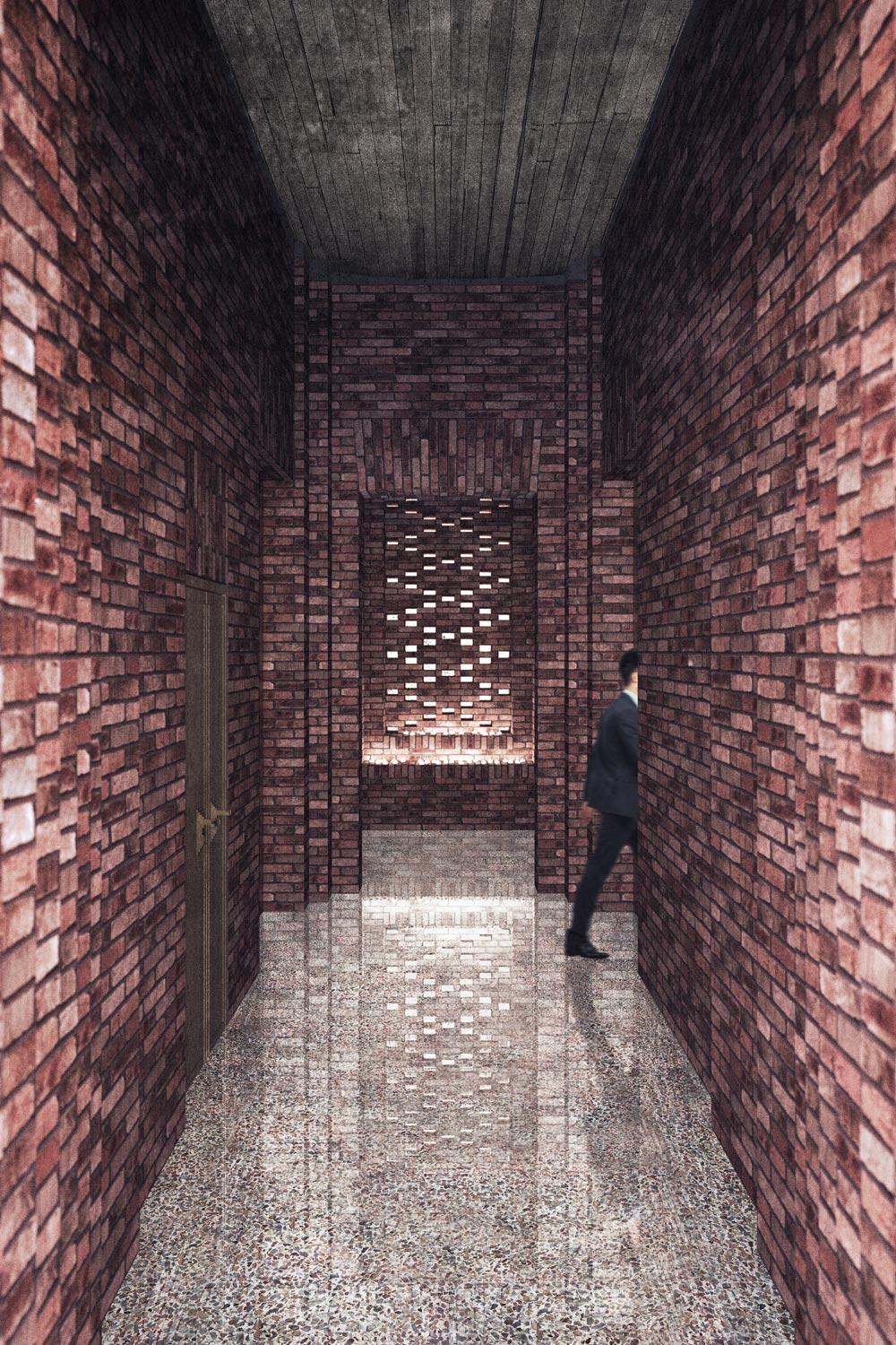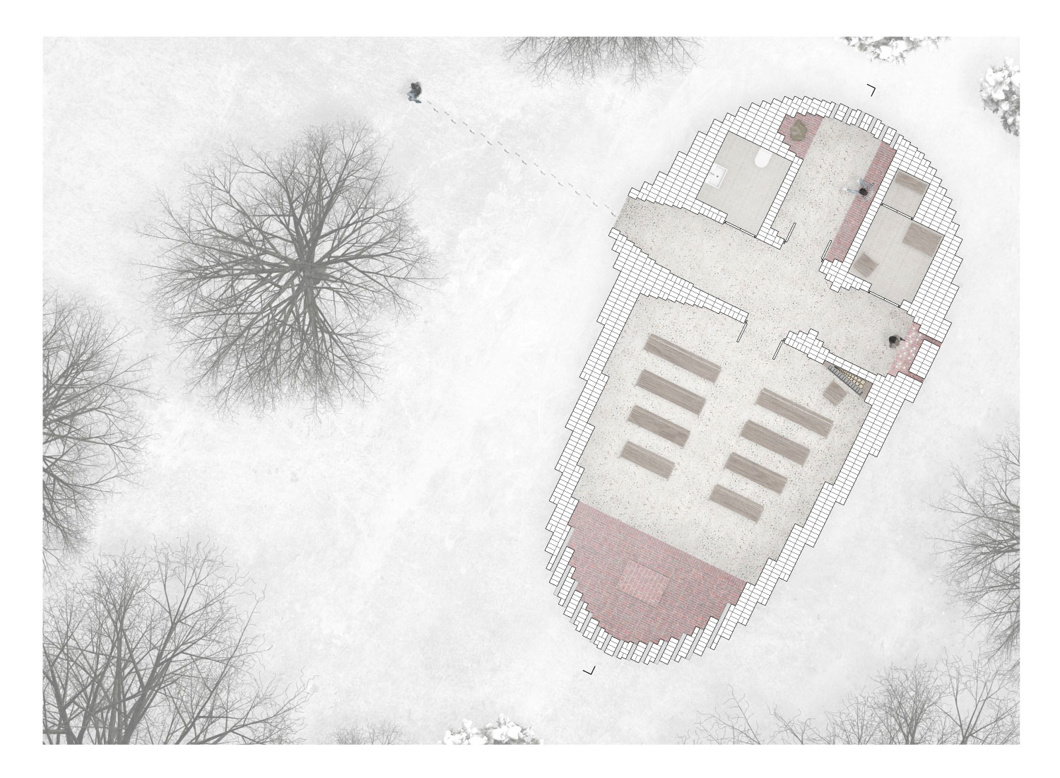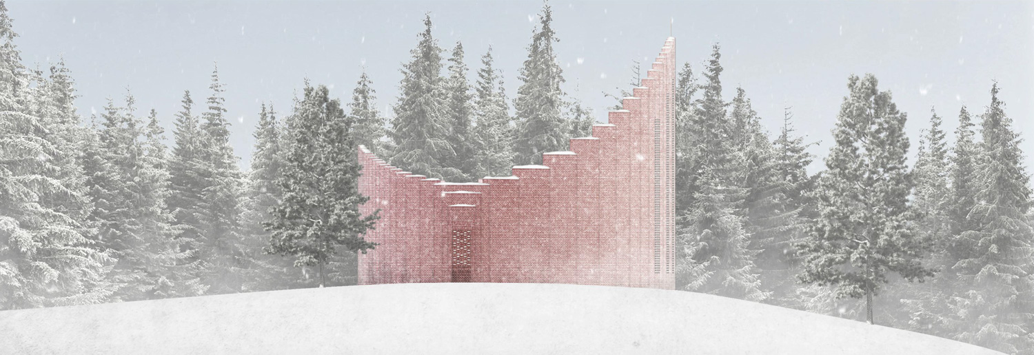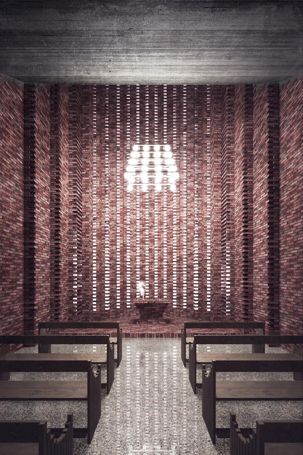 In Zeiten von leeren Dorfkirchen und vollen Autobahnen bleibt das Bedürfnis nach Ruhe und Spiritualität, die nach einer baulichen Lösung sucht. Die massiv aus Backsteinen erbaute Kapelle nahe der A6 bei Kaiserslautern bietet ein introvertiertes Refugium für Reisende. Statt Ausblicken nach Außen entsteht im Inneren ein intensives Lichtspiel durch in das Mauerwerk eingeflochtene Glasbausteine und perforierte Wandflächen, die die Fügungspotentiale des Backsteins und dessen Ornamentik zelebrieren.
