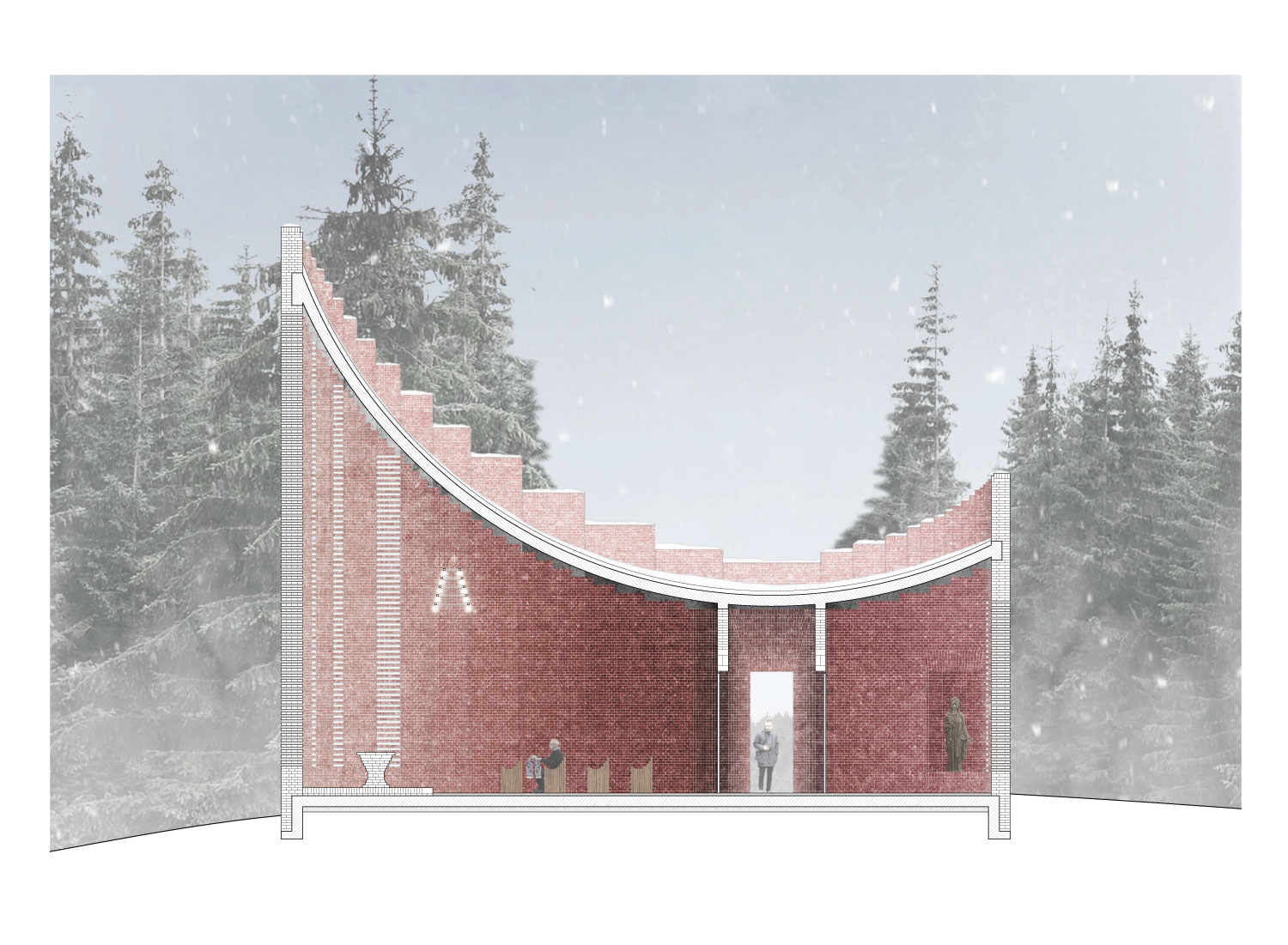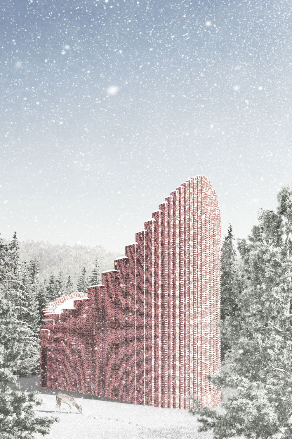 Um das durch die ringsum laufende Straße bestimmte Grundstück als Gesamtanlage zu verstehen, orientiert sich die ovale Form der Kapelle am Straßenverlauf und positioniert sich an der höchsten Stelle des Geländes, wodurch das Gebäude zum einen als sinnbildliche Krone des Ortes inszeniert wird, zum anderen die Sichtbarkeit von der Autobahn gewährleistet ist. Da die Kirche ein Fundament unserer Gesellschaft ist, verlangt diese Bauaufgabe nach einem massiven Material, aus dem seit jeher Gotteshäuser gebaut wurden und das zudem in seiner Farbigkeit dem rot-braunen Sandsteinboden des Pfälzer Waldes gleicht: Ziegelstein. Um die ovale Form des Bauwerks und den orthogonalen Charakter des Baustoffes in Einklang zu bringen, wird sich der Form der Kapelle materialgerecht durch das Rück- und Vorspringen der massiven Wände angenähert, wodurch ein expressives Äußeres entsteht, dessen Massivität und Geschlossenheit ein starkes Solitär in einer unwirklichen Infrasturkturumgebung schafft.