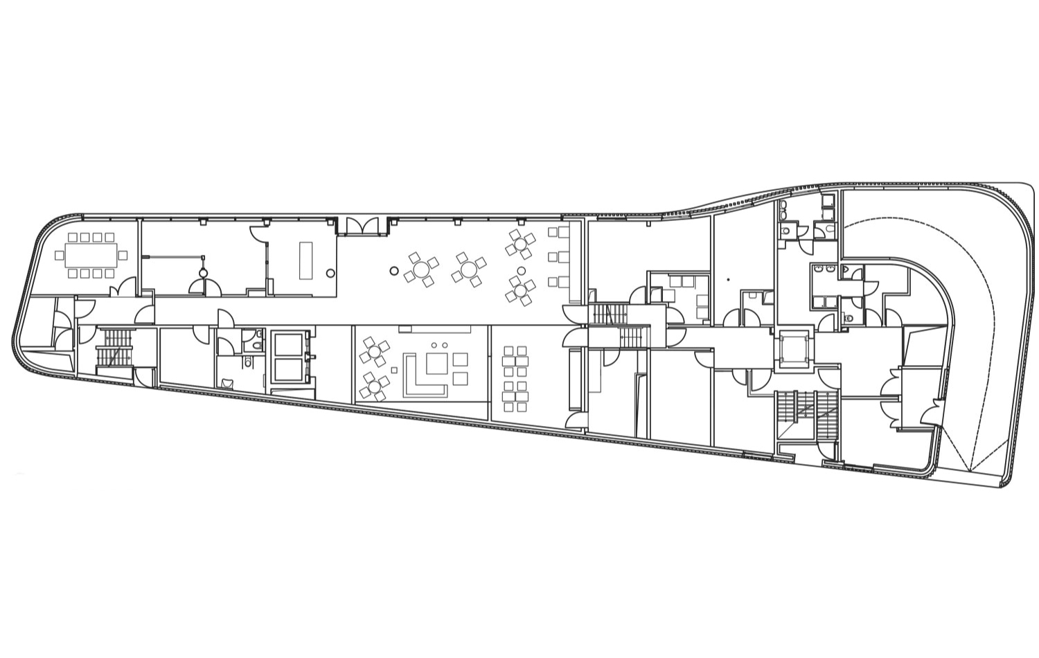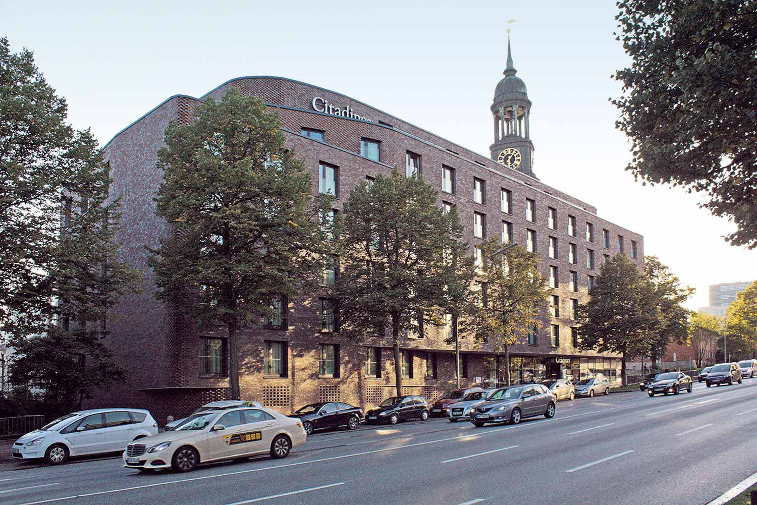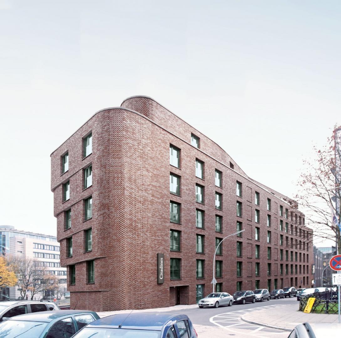 Die Klinkerfassade wird zugunsten einer Glasfassade zurückgenommen und öffnet sich zum städtischen Raum. Aus dem geometrischen Prinzip der Verschiebung von Geschossen entwickelt sich ebenso die Logik der Staffelgeschosse – und damit auch eine attraktive fünfte Fassade. Die dem Michel zugewandte Ecke zeigt eine minimale Verschiebung der einzelnen Geschosse, so dass der Baukörper an dieser stadträumlich prominenten Situation mit zurückhaltenden Mitteln akzentuiert wird. In der Wahrnehmung entsteht eine subtile Veränderung von Licht, Schatten und Blickbeziehungen.