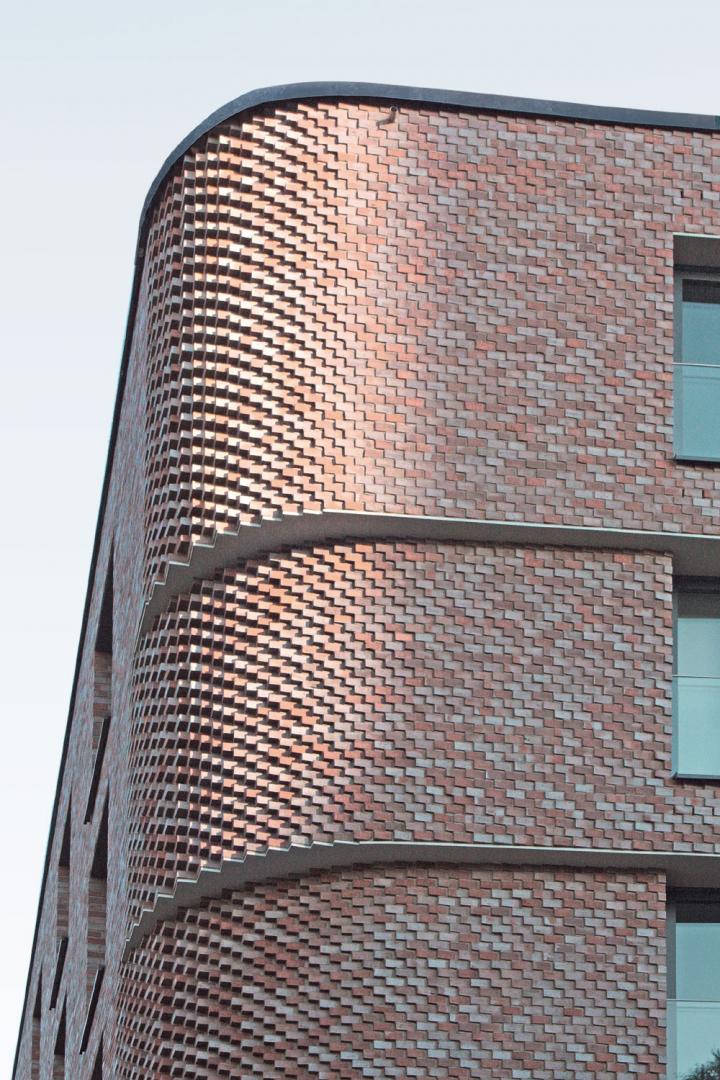 Staffelgeschosse, weiche Konturen und geschosshohe Bänder bilden beim Boarding Haus am Michel einen plastischen Baukörper heraus. Hell glasierte Backsteine lockern die Fassade weiter auf.