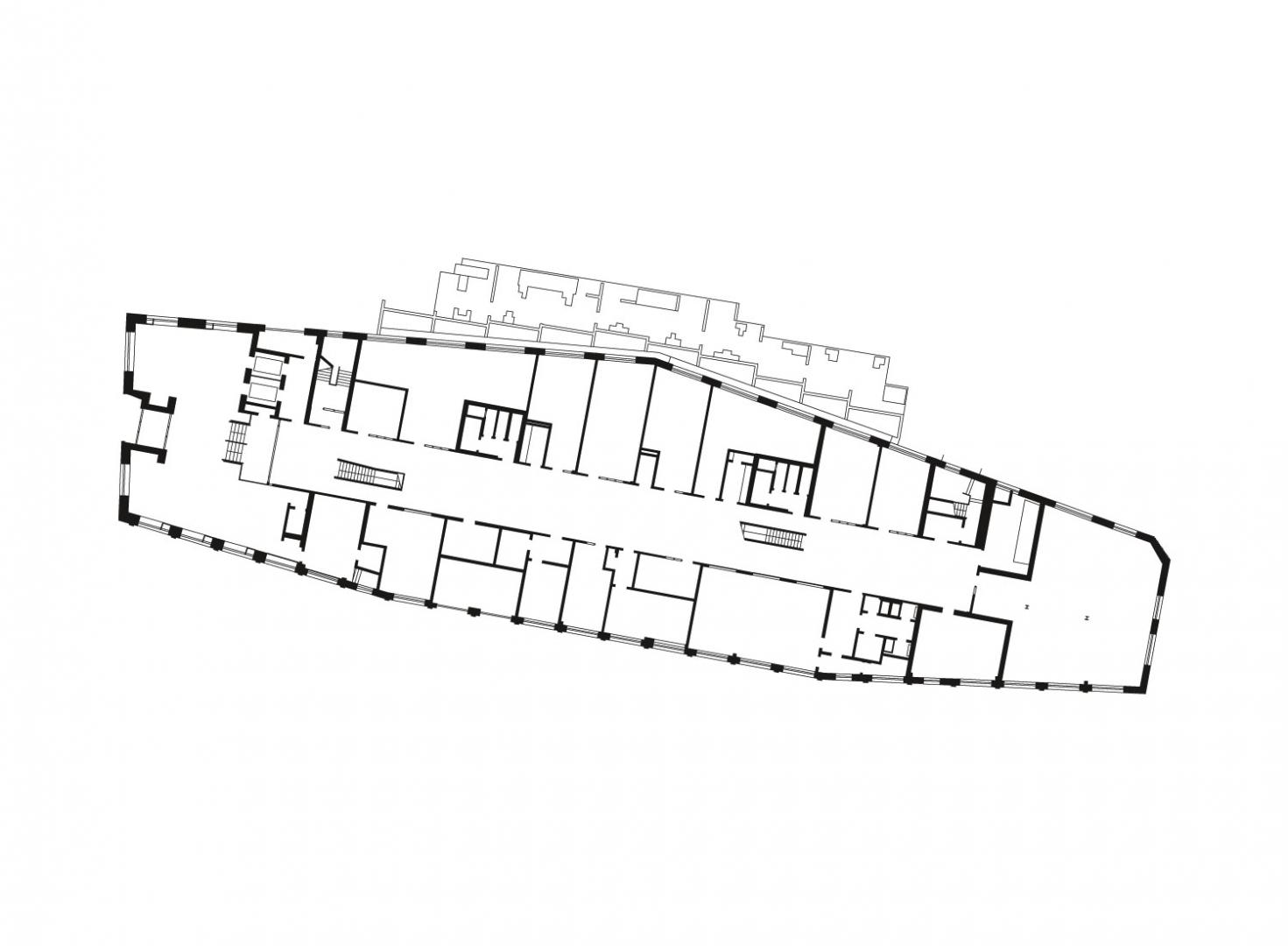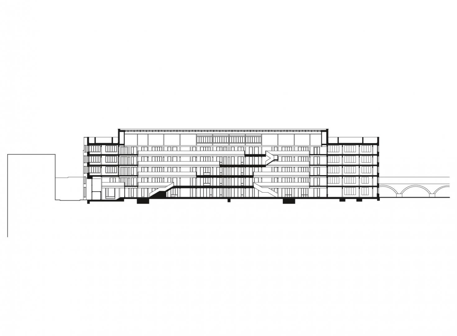 Mit einer Länge von 90 Metern und einer Höhe von 6 Stockwerken ist es ein großes Gebäude für das kleinteilig strukturierte Umfeld. Die Gebäudemasse passt sich jedoch dem komplexen städtischen Kontext an, indem sie sich zu beiden Enden hin verjüngt und mit Facettierungen die sichtbare Länge unterbricht. Ausgehend von dem Viadukt werden aus vier sukzessive sechs Stockwerke und entlang der Nazrul Street aus den sechs wieder drei Stockwerke. Die Backstein-Pfeiler spiegeln den Rhythmus der engen Parzellen auf dieser „zufälligen“ Straße wider. Während die langen Fassaden rhythmisch und repetitiv sind, fallen die kurzen Enden figurativ und ein wenig verspielt aus. Die nördliche Eingangsfassade bestimmt ein Staffelgiebel wie der eines großen hanseatischen Hauses; die südliche Fassade mutet wie ein stürzendes Reihenhaus an, das unten rechts und oben links erodiert ist. Was außer Backstein könnte diesen Elementen, die das Gebäude an seinem Standort verankern, sowohl Kraft als auch Subtilität verleihen?