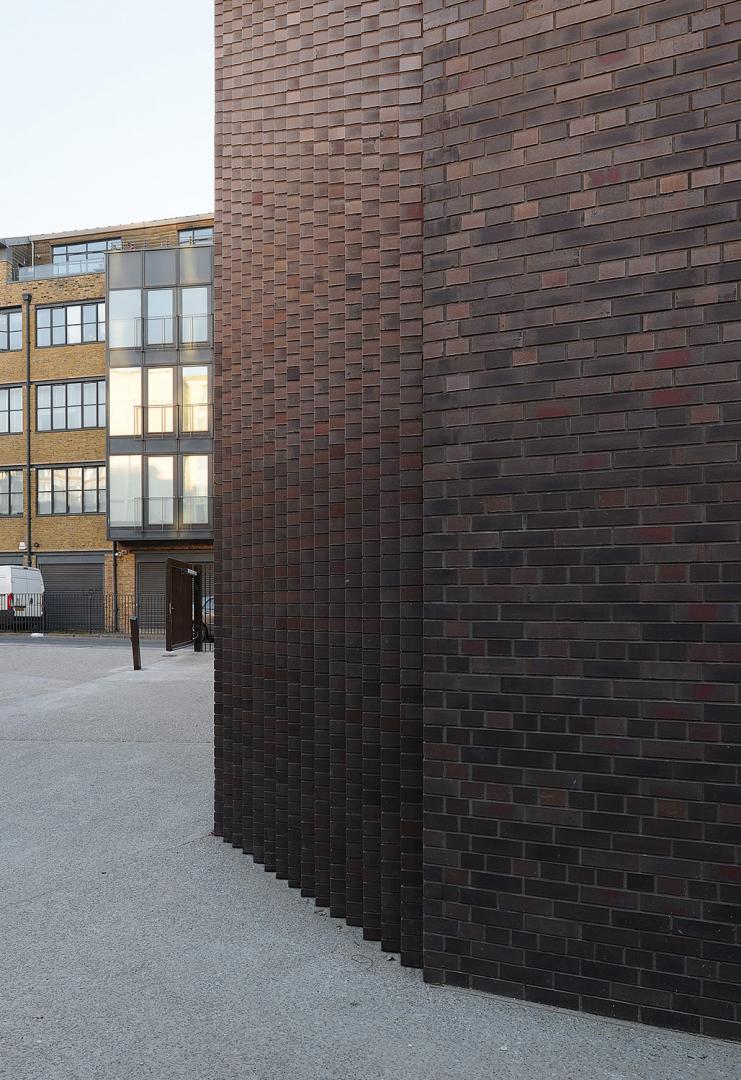 Eine halbe Million Backsteine wurden von Hand verlegt; diese bedächtige Handwerksarbeit wurde durch die schnelle, trockene und wetterfeste Bauweise ermöglicht. Die Außenwand aus 215 mm dicken Ziegelsteinen ist selbsttragend und im Mauerwerksverband „English Garden Wall“ (mit Binderschicht in jeder vierten Lage) verlegt. In der Seitenstraße sind die Zwickel unter den Fenstern im Muster eines „Korbgeflechts“ strukturiert; in der Eingangsfassade werden alle Öffnungen mit hohen Ziegelblöcken eingerahmt; die Schriftzüge sind mit einem auffälligen, orange glasierten Backstein realisiert. Trotz der komplexen Geometrien und der Verbandkonstruktion arbeiteten die Architekten mit nur sieben Sonderformen. Durch die enge Zusammenarbeit zwischen Ziegelei und Architekt wurden geringe, dem Maßstab gerechte Kundenanpassungen an den Backsteinen vorgenommen. Der braunviolette Backstein verleiht diesem Gebäude eine ungewöhnliche Dynamik, die sowohl auf die Eigenschaften des Tons als auch auf den sich ständig verändernden Londoner Lichteinfall zurückzuführen ist: Das Aussehen variiert von kalt bis warm, von erdig bis glasig über den Tag und das Jahr hinweg.