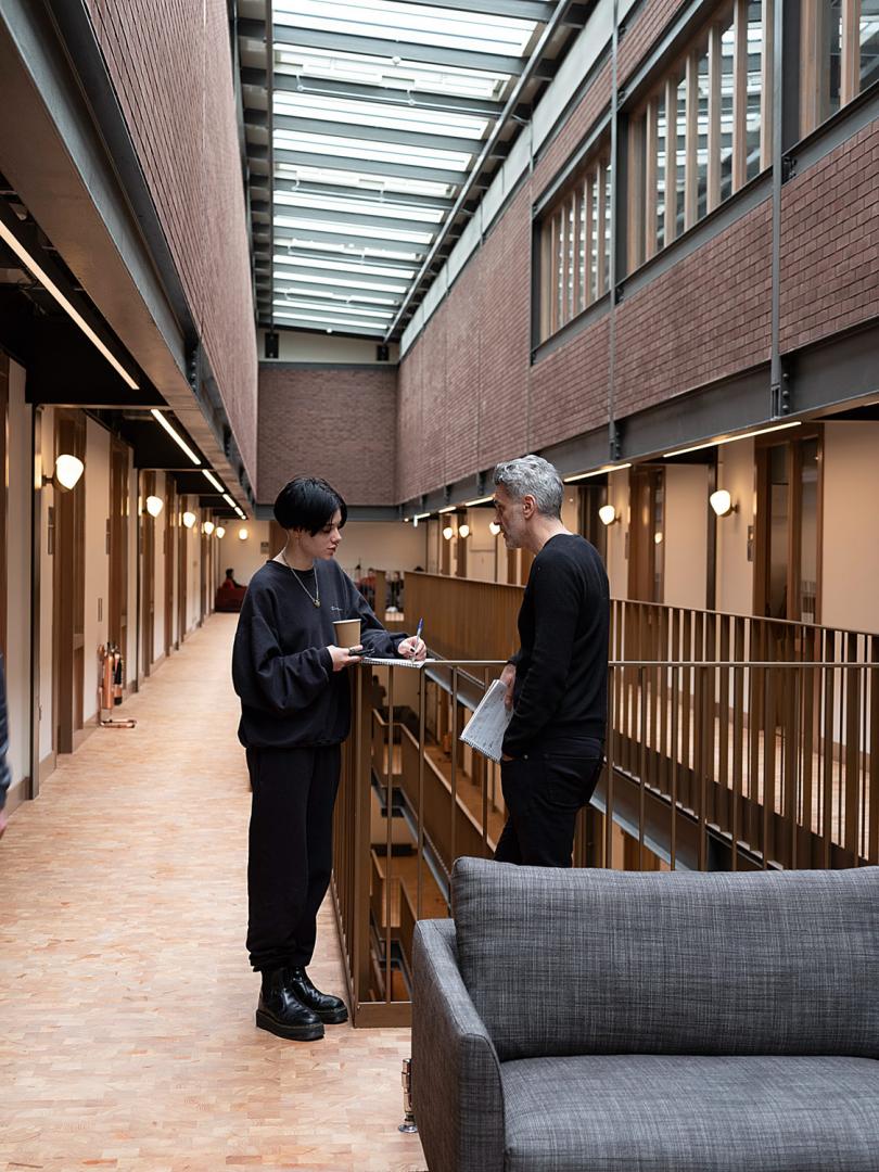 Innerhalb der selbsttragenden Ziegelschale ist das Gebäude ein Stahlskelett. Die Studios befinden sich auf beiden Seiten eines langen, schlanken Lichthofs, der über Laufgänge an seinen Rändern zugänglich ist. Eine Reihe von terrassenförmig angelegten Brücken bieten gemeinsame Räume für Begegnung, Essen, Arbeit und Entspannung. Der Lichthof ist geprägt von Stahlträgern, Holzböden, Holzfenstern und -türen – und ganz oben ist der Lichtschacht mit demselben braun-violetten Backstein ausgekleidet, der den Gemeinschaftsbereichen eine warme Außenatmosphäre verleiht. Backsteine sind Teil der Seele dieses Gebäudes: hart und erdig im Ursprung, aber auch von warmer Ausstrahlung – so wie die Londoner.