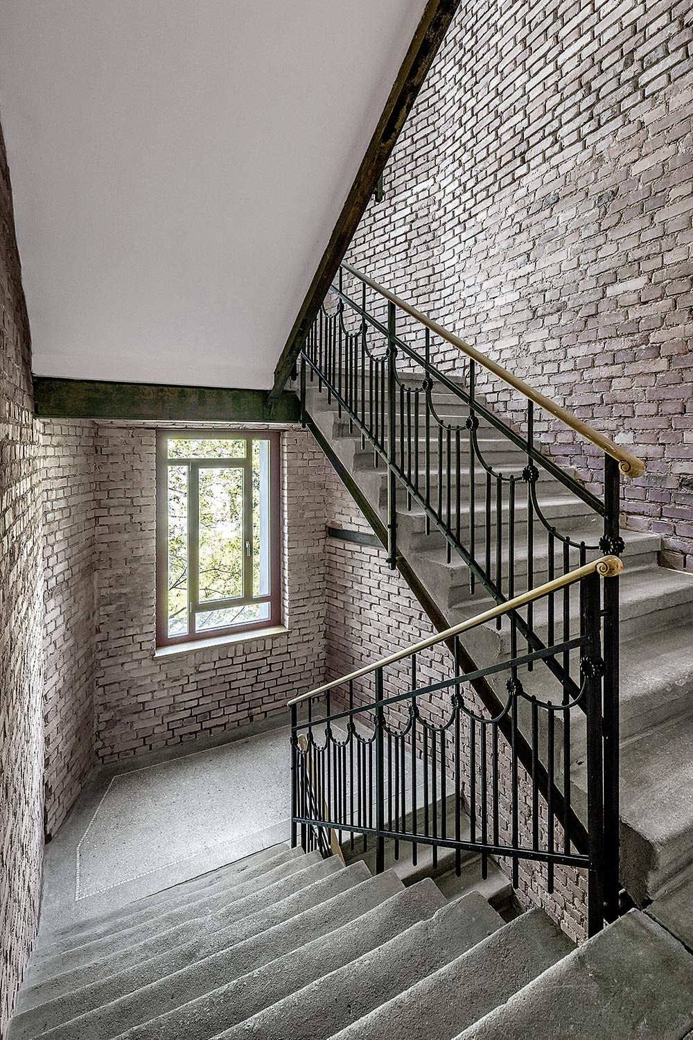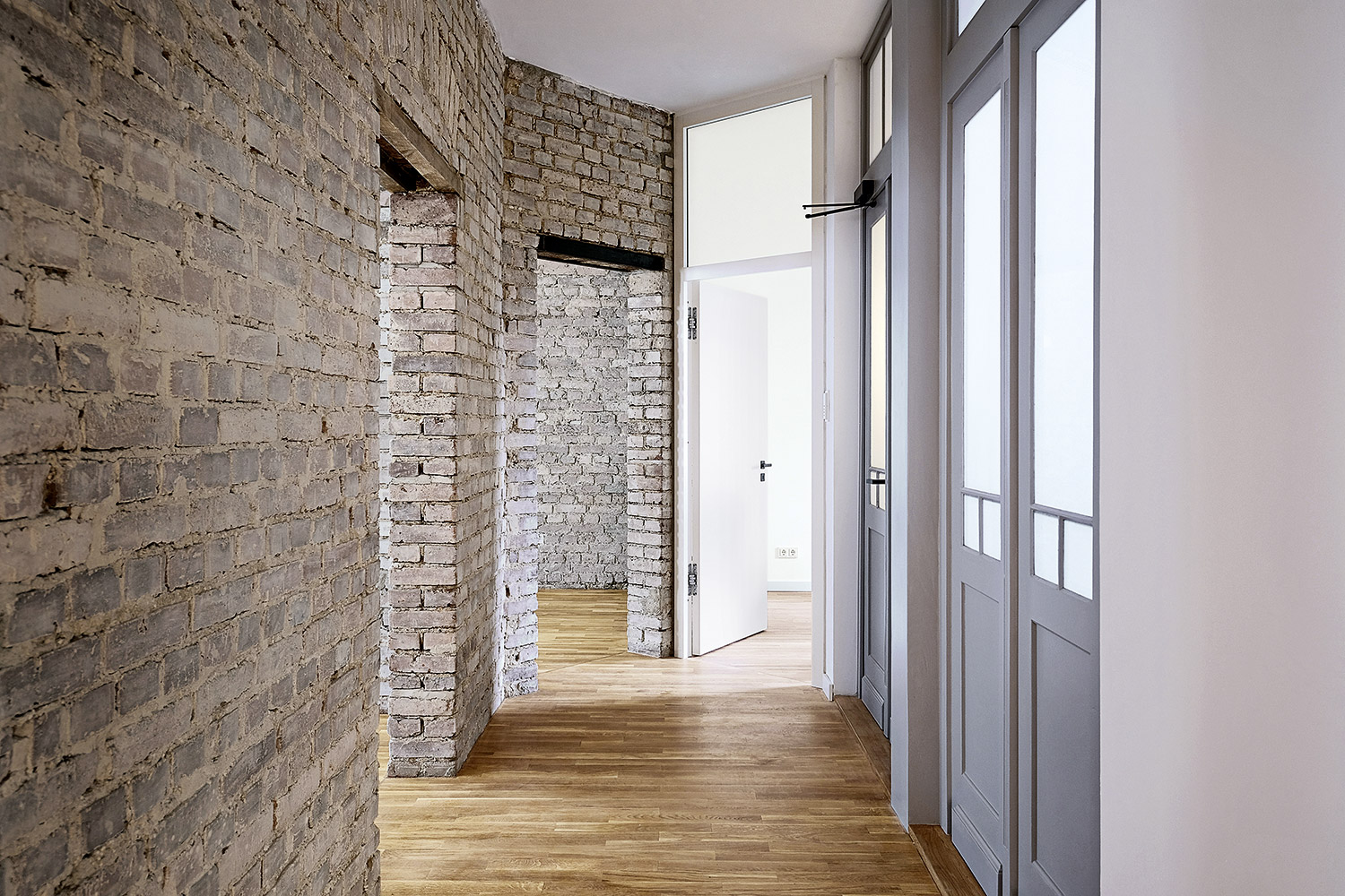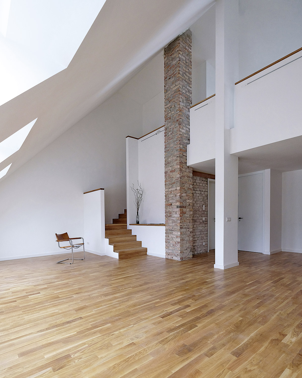 Im Kontrast zu den minimalistischen neuen Elementen wurden die Ziegelwände des Treppenhauses sowie Wände ausgewählter Bereiche in den Wohnungen behutsam vom Putz befreit, mit recycelten Originalziegeln ergänzt und hell lasiert. Dasselbe Prinzip bestimmt auch das Erscheinungsbild der Fassade: Akkurate Faschen verstecken die Fensterrahmen und fassen die schmalen Fensterflügel. Sie stehen im Kontrast zur ruppigen Ziegelfassade mit all ihren Unregelmäßigkeiten und den sichtbar belassenen Blessuren des zurückliegenden Jahrhunderts. Das Dach wurde komplett abgetragen und unter Wiederverwendung von Abbruchziegeln neu aufgebaut. Durch Aufklappen der hofseitigen Dachseite wurde zusätzlicher Wohnraum geschaffen, der sich auf eine großzügige Dachterrasse mit Schiebetüranlage orientiert.