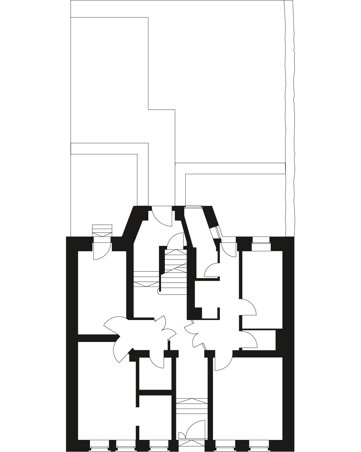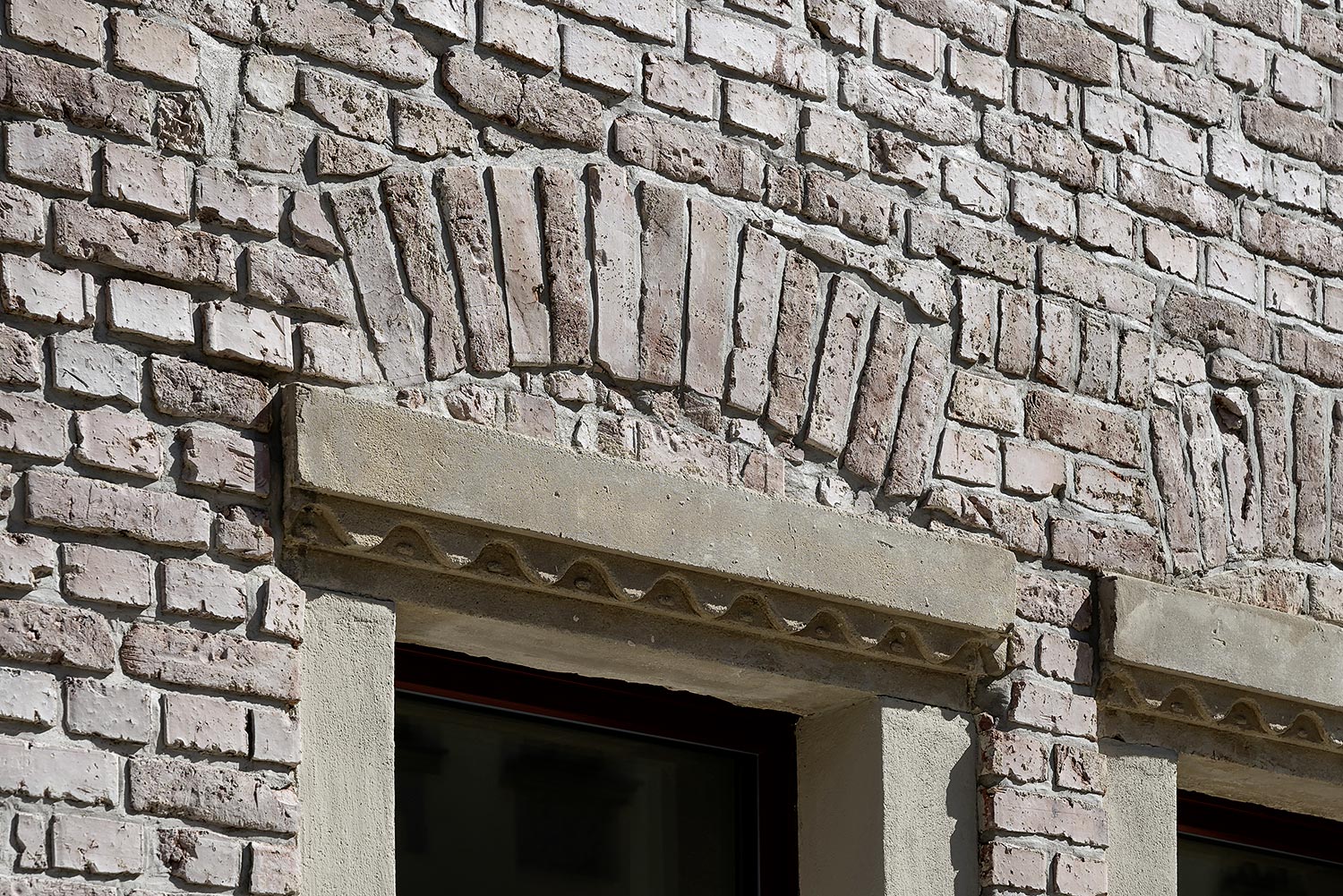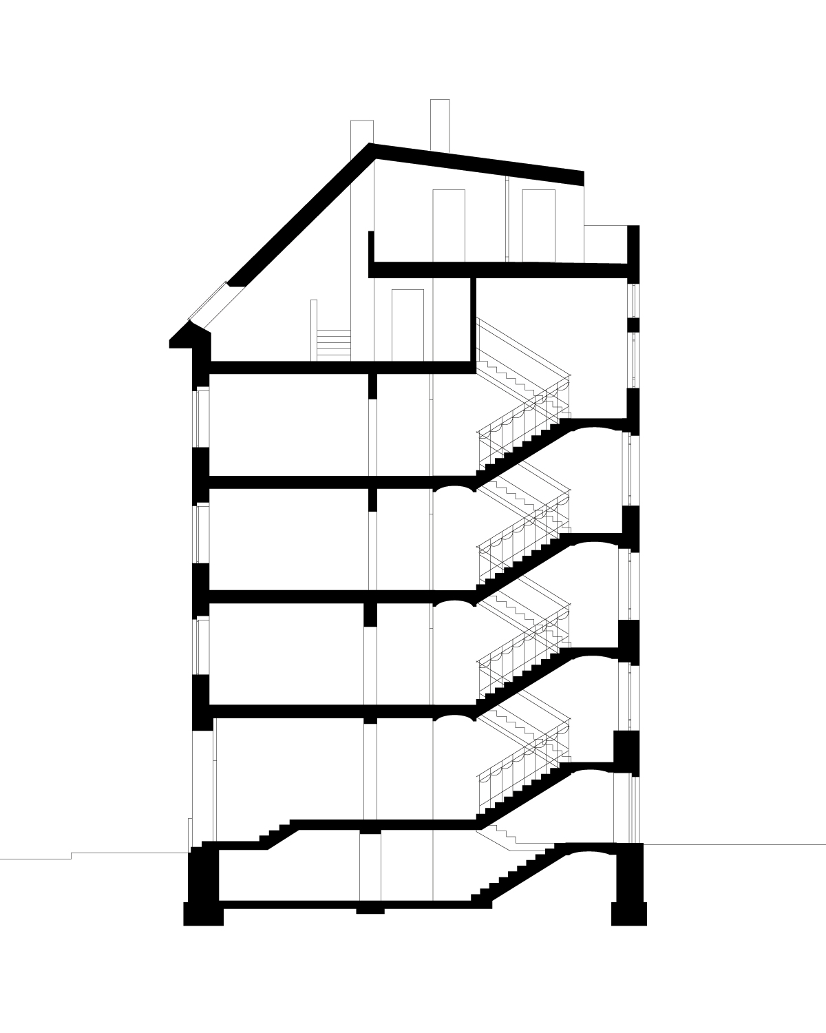 Im Kontrast zu den minimalistischen neuen Elementen wurden die Ziegelwände des Treppenhauses sowie Wände ausgewählter Bereiche in den Wohnungen behutsam vom Putz befreit, mit recycelten Originalziegeln ergänzt und hell lasiert. Dasselbe Prinzip bestimmt auch das Erscheinungsbild der Fassade: Akkurate Faschen verstecken die Fensterrahmen und fassen die schmalen Fensterflügel. Sie stehen im Kontrast zur ruppigen Ziegelfassade mit all ihren Unregelmäßigkeiten und den sichtbar belassenen Blessuren des zurückliegenden Jahrhunderts. Das Dach wurde komplett abgetragen und unter Wiederverwendung von Abbruchziegeln neu aufgebaut. Durch Aufklappen der hofseitigen Dachseite wurde zusätzlicher Wohnraum geschaffen, der sich auf eine großzügige Dachterrasse mit Schiebetüranlage orientiert.