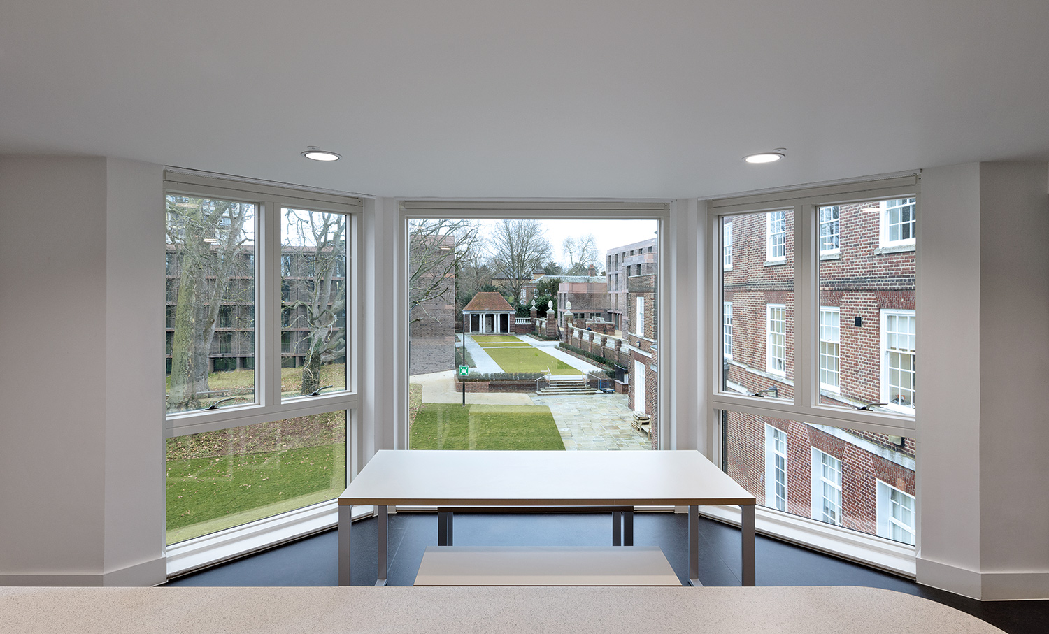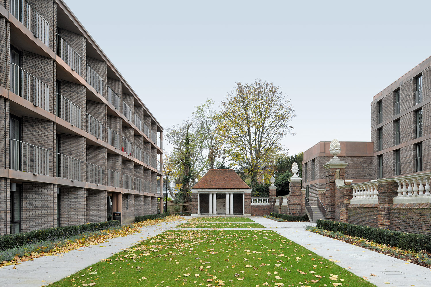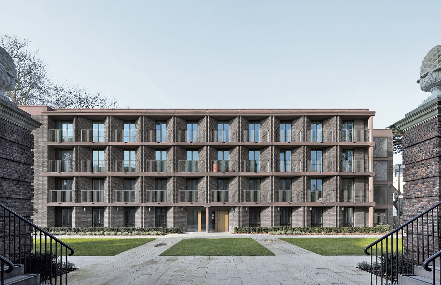 Zwischen den angrenzenden georgianischen und brutalistischen Gebäuden gibt es viele Gemeinsamkeiten. Im Erscheinungsbild des tragendes Backsteinmauerwerks und der Betonrahmen wird ihr Konstruktionsprinzip sichtbar. In den Innenräumen ist Platz für Balkone entstanden, die einen Übergang zwischen öffentlichem Gartenbereich und privatem Raum bilden.