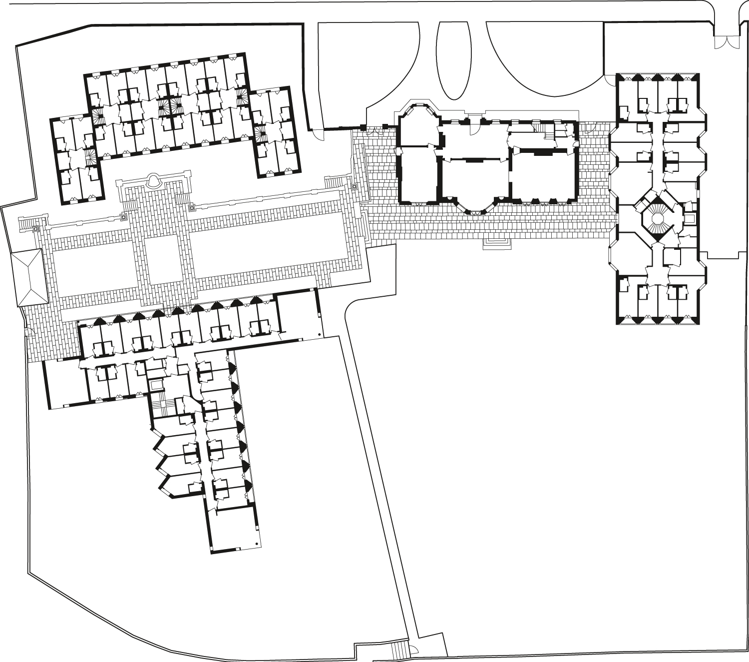 Die zunächst im Treppenaufgang eingesetzte oktogonale Geometrie zieht sich wie ein roter Faden durch die Gebäude und taucht bei den Erkerfenstern, Balkonen und gelegentlich auch bei den Stützpfeilern auf.