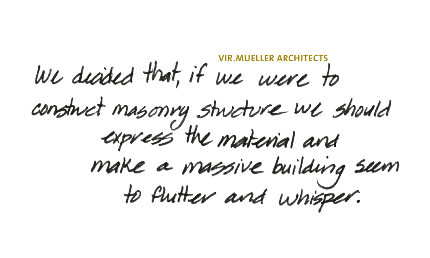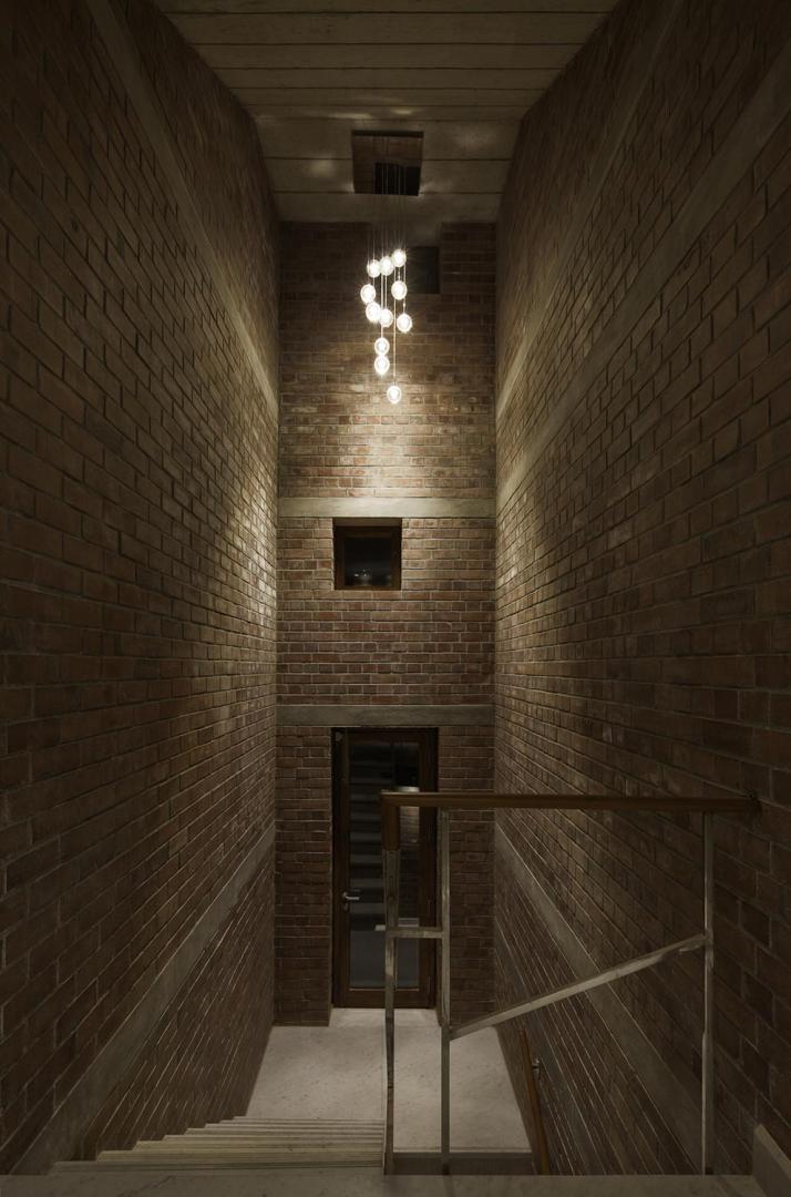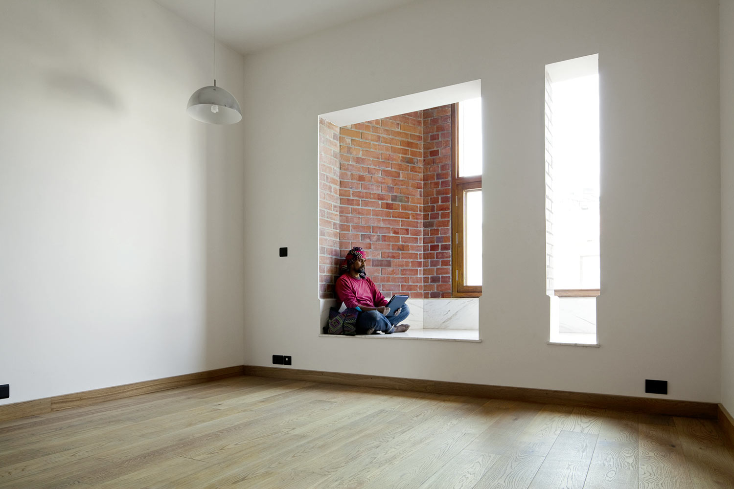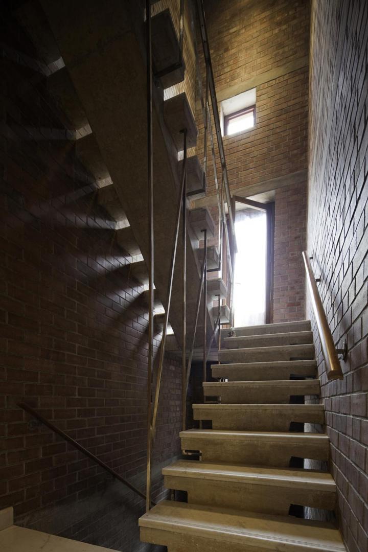 Die Masse der Backsteine kommt sowohl in der Stärke der Wände als auch in der Oberflächenstruktur zur Geltung. Das Haus bleibt kühl und erhält gleichzeitig eine gediegene, erdige Nuance. Auf der Westseite des Gebäudes verwandeln sich die Backsteine des Sonnenschutzes gleichzeitig in einen wogenden, luftigen Schleier. Alle Türen und Fenster wurden von den Schreinern direkt auf der Baustelle von Hand aus Teakholz gefertigt. Die spiegelblank polierten Steinböden reflektieren das Licht in den Innenräumen und erzeugen so einen leuchtenden Kontrapunkt zum Mauerwerk. Die Architektur gibt sich einem Spiel kinetischer Energie hin und lässt flüchtige Einblicke in das Treiben auf der Straße wie auch die Aktivitäten im Innern zu.