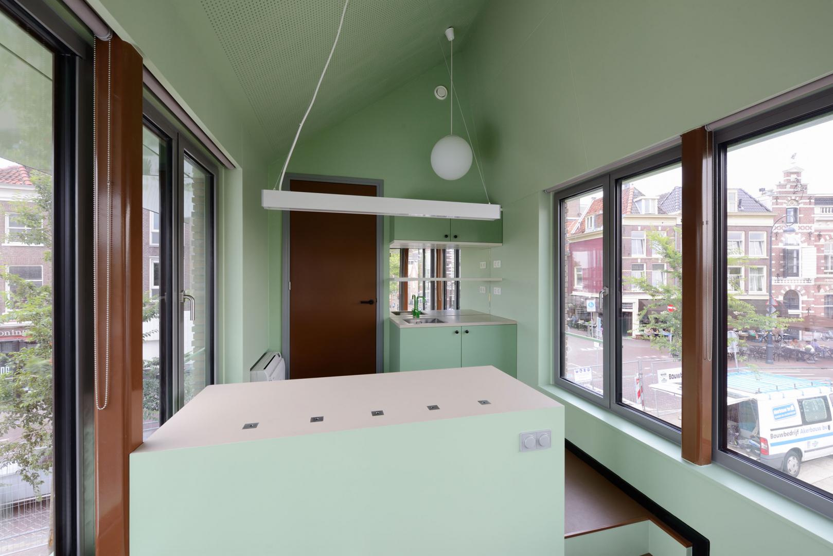 Die Milchbrücke von 1886 mitten in der Altstadt von Haarlem überspannt die Spaarne. Das bestehende Brückenwärterhaus war eine Box aus Stahl mit Paneelen aus dem Jahr 1960. Nach einem Brand im Keller schrieb die Gemeinde einen Wettbewerb aus für den Entwurf eines neuen städtischen Wahrzeichens an dieser Stelle. Das „Melkhuisje“ stellt eine Variation des archetypischen Hauses dar. Die Form wird durch die äußeren Umstände beeinflusst. Ein großzügiger Dachüberstand dient dem Sonnenschutz, den größten Teil des Erdgeschosses nimmt der Transformatorenraum in Anspruch.