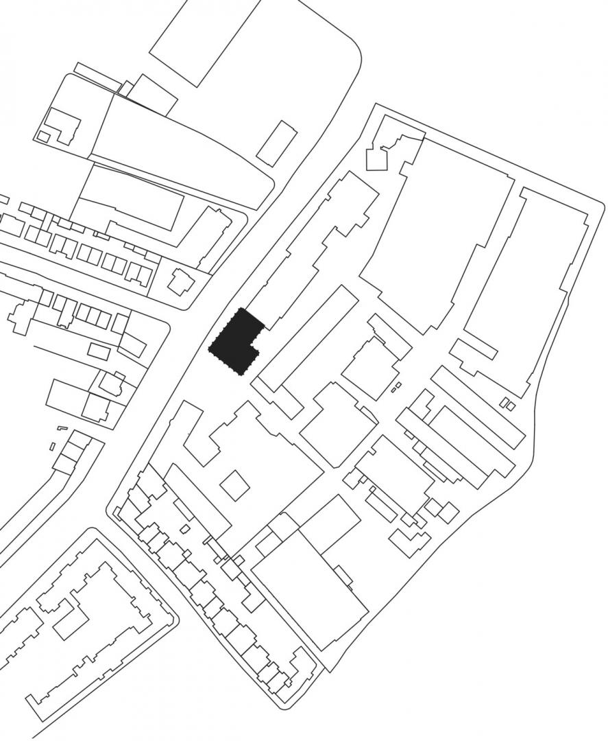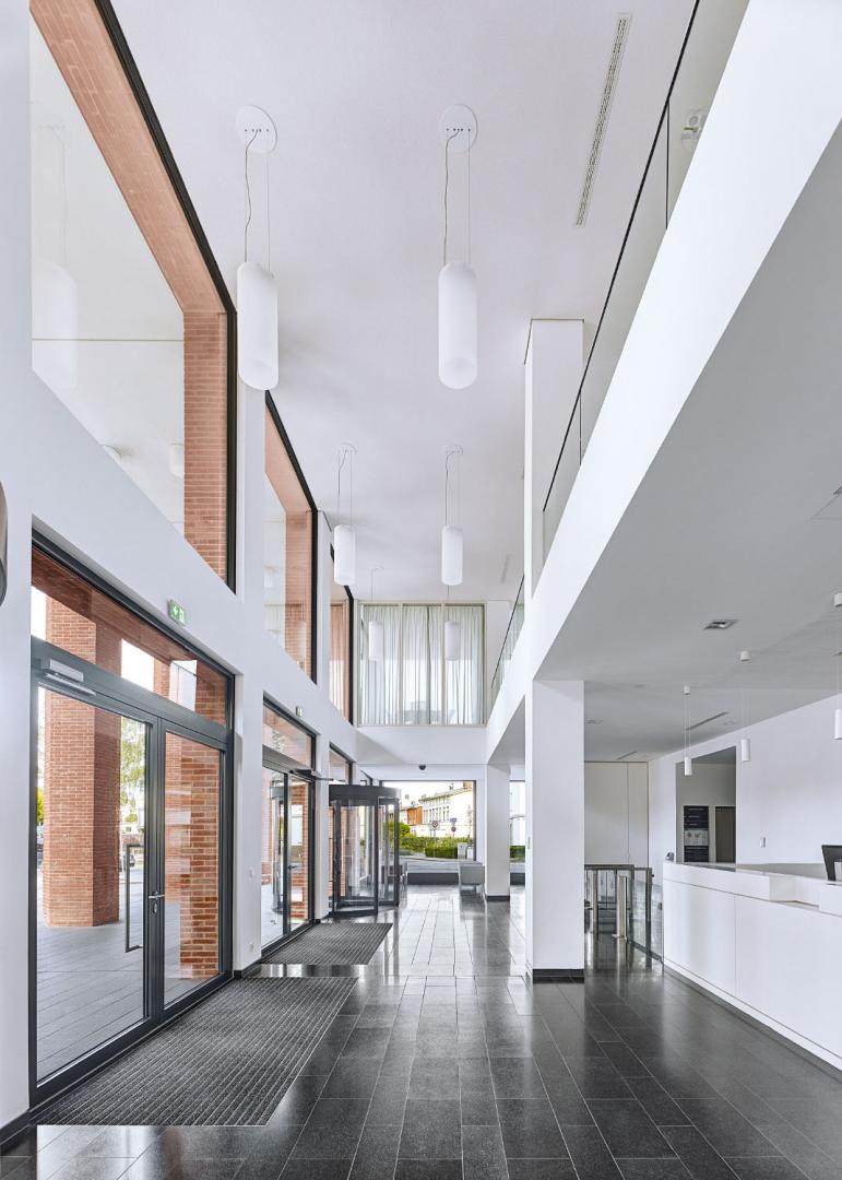Mit dem neuen Empfangsgebäude erhält die Zugangssituation zum Hauptsitz des Unternehmens Dräger in Lübeck ein neues Gesicht. An der Stelle des Werktors, das noch zu Beginn des 20. Jahrhunderts das Unternehmen vom öffentlichen Raum der Stadt trennte, definiert das Gebäude einen dreiseitig gefassten, zur Straße hin geöffneten Platz. Der öffentliche Platzraum will die Verbindung des Unternehmens mit der Stadt Lübeck unterstreichen und gibt zugleich den Blick auf das zentrale Unternehmens-Ensemble im Inneren frei. Neben dem neuen Empfangsgebäude umschließen zwei weitere Gebäude aus unterschiedlichen Epochen der Werksgeschichte den Platz. Diese kleine Unternehmensgeschichte in Form eines städtebaulichen Panoramas wird durch die leichte Verdrehung des Empfangsgebäudes zum gegenüberliegenden Haus raffiniert eröffnet.