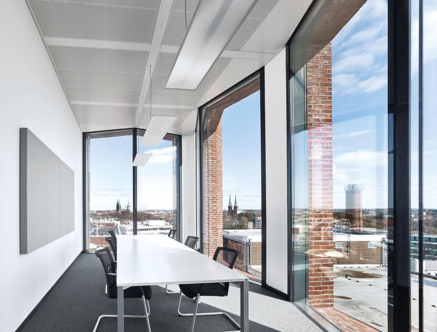 Die zweischalige Fassade mit komplett geschlossenem Zwischenraum ermöglicht eine vollständig kontrollierte Lüftung und reduziert den Energieverbrauch auf ein Minimum. Der Zwischenraum wird mechanisch gelüftet, wodurch keine Kondensation stattfindet und auch der Reinigungsaufwand minimiert wird. Für die Fassade wurden Wasserstrichziegel verwendet, die ihr einen rauen, handwerklichen Charakter verleihen. Insbesondere durch die Kombination aus sehr großen, abstrakten Glasscheiben und den handwerklich bearbeiteten Backsteinen stellt das Gebäude eine Beziehung zwischen der langen Tradition der Firma Dräger einerseits und ihrer Zukunftsgewandtheit andererseits her. Es ist ein modernes Gebäude entstanden, dessen Architektur zugleich das Traditionsbewusstsein des Unternehmens und der Stadt spiegelt. Der Neubau umfasst auf acht Stockwerken insgesamt 3.150 Quadratmeter Nutzfläche und bietet Platz für bis zu 200 Arbeitsplätze.