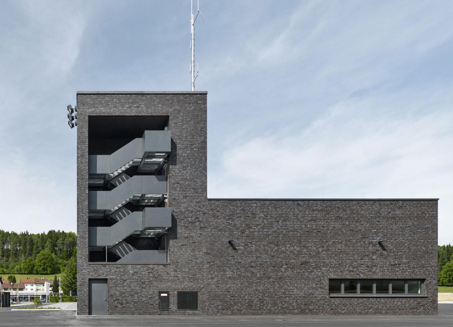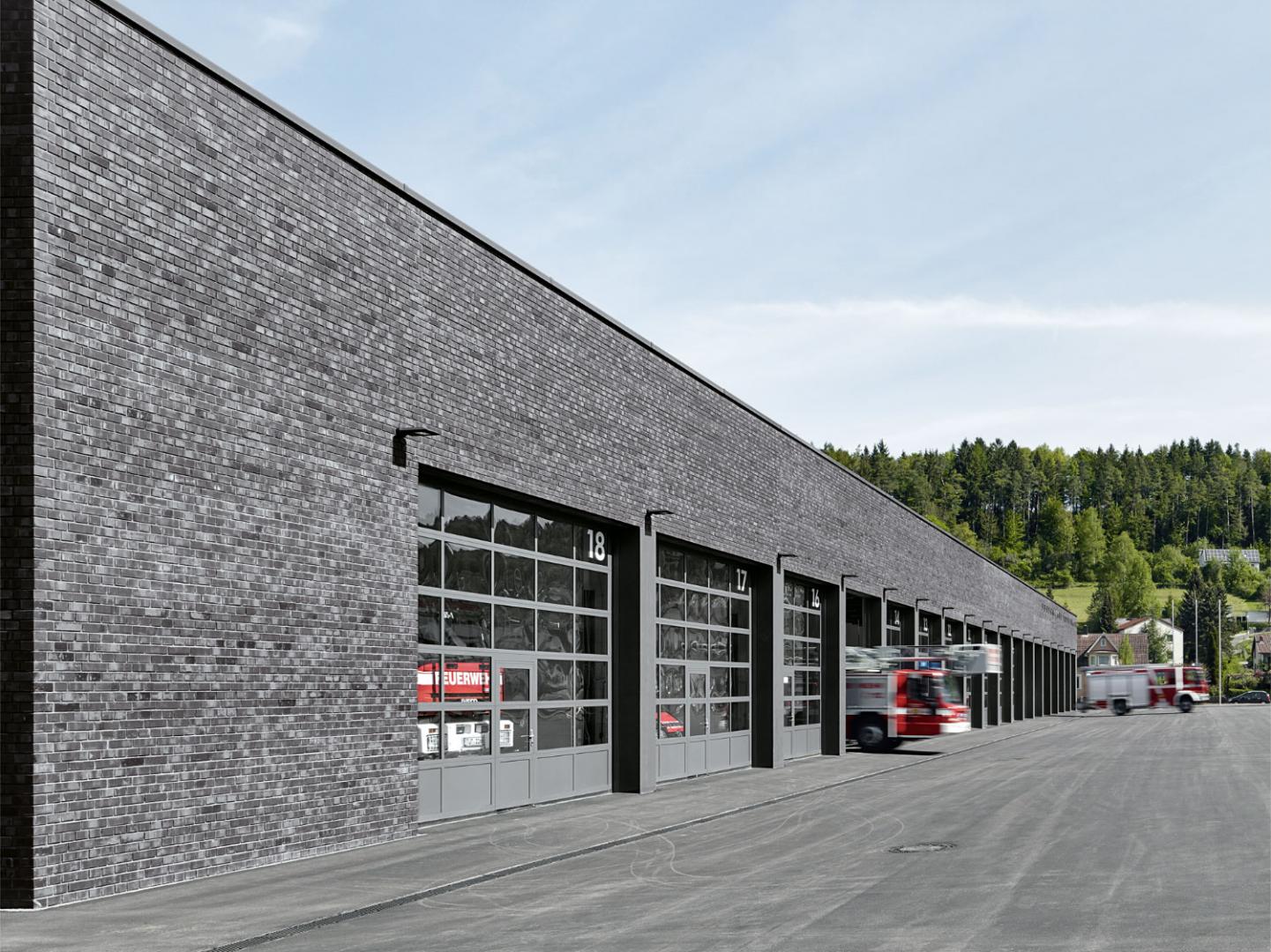 Das Haus ist mit soliden, wertbeständigen Materialien gebaut und besitzt eine dauerhafte Fassade aus hart gebranntem Backstein. Der Stein ist nicht rot, sondern in einem farblich changierenden, anthrazitgrauen Farbspektrum gehalten, um ein architektonisches Passepartout für die roten, in Reihe stehenden Einsatzfahrzeuge zu bilden. Die homogene Gestaltung verschafft dem lagernden Gebäude eine angemessene Präsenz im Stadtraum und strahlt eine zurückhaltende Eleganz aus. Das Gebäude wird als ganzheitlich gemauertes Volumen aufgefasst, das mit einem im Kreuzverband gemauerten Backstein einheitlich materialisiert wird. Neben der gestalterischen Qualität waren auch Aspekte der Langlebigkeit und der Alterungsfähigkeit für die Materialwahl maßgeblich. Der ruhige Charakter des Gebäudes wird durch große zusammenhängende Klinkerflächen gestärkt, in die große Fassadenöffnungen volumetrisch eingeschnitten werden.