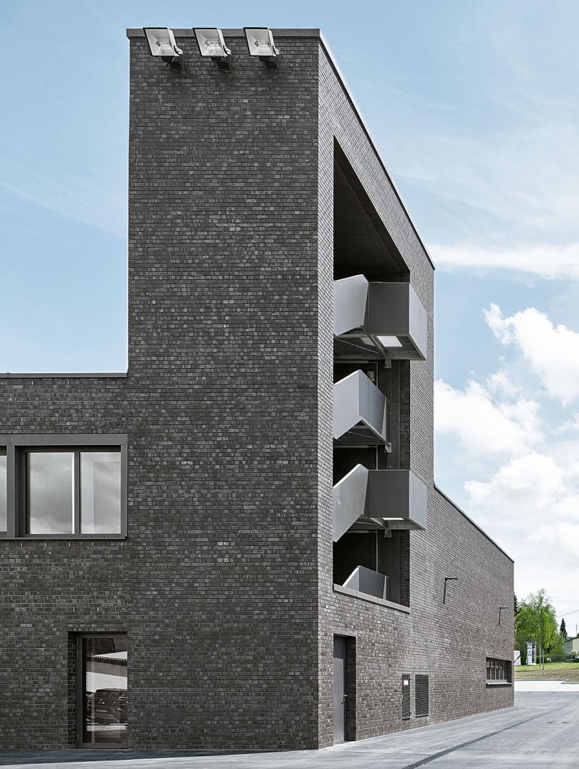 Zusammenhängende Backsteinflächen betonen den ruhigen Charakter des Feuerwehrgebäudes, Fassadenöffnungen mit Stahl- und Glaselementen die räumliche Tiefenstaffelung.