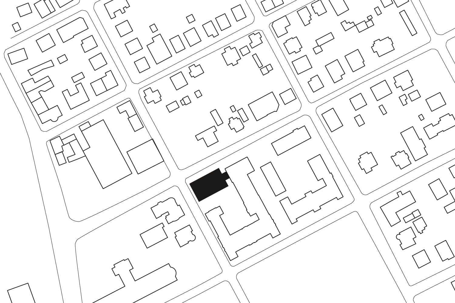 Der Baukörper versteht sich als ergänzender Baustein in der bestehenden Stadtstruktur, er fügt sich daher hinsichtlich seines Volumens, der Höhenentwicklung, Dachform, Farbigkeit und Materialität selbstbewusst, aber sensibel in die Nachbarschaft ein. Er fungiert zudem als Komplettierung des Gesamtensembles für das Finanzamt, das aus sehr individuellen, teilweise denkmalgeschützten Gebäuden besteht, die aus unterschiedlichen Zeiten von 1900 bis 2000 stammen. Der Übergang zum Bestand erfolgt durch einen Zwischenbau, der sich durch seine geometrische Ausbildung und abweichende Materialität zurücknimmt.