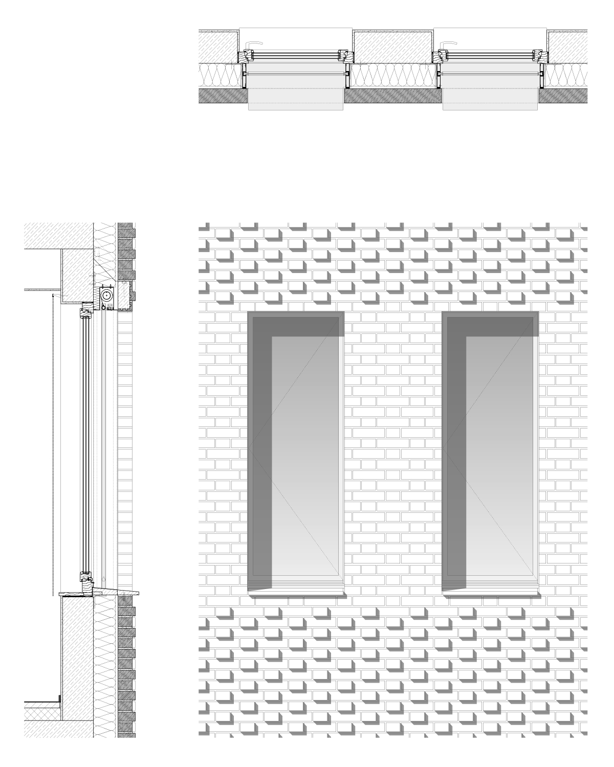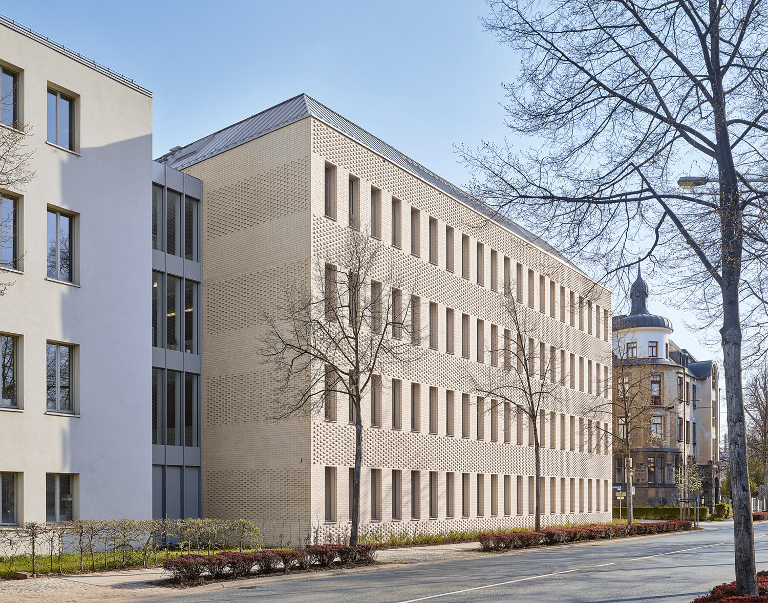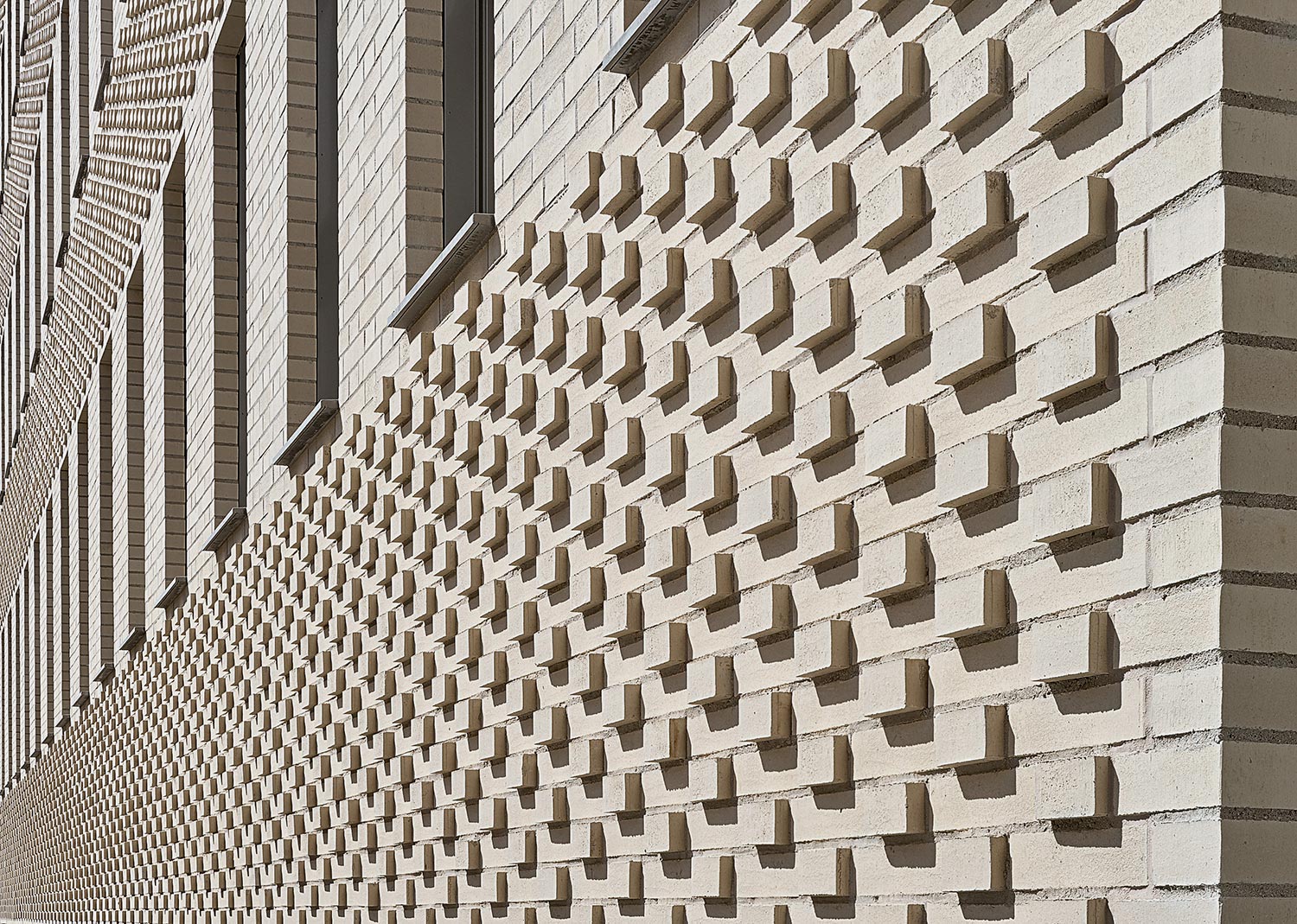 Der Ziegelverband ist im flämischen Verband ausgeführt. Die Läufersteine des Verbandes bleiben in allen Bereichen immer gleich. Die Binder werden in den Brüstungsbereichen etwas herausgezogen, während sie in Höhe der Fenster an den Stirnseiten leicht nach innen gesetzt werden. Die reliefierte Ausführung wurde im Detail mit Verbandsvertretern der Ziegelindustrie konzipiert. In einem Fassadenmuster wurden insbesondere die geplanten Reliefs und die Aspekte der Maßhaltigkeit, der Farbigkeit, Fugenausbildung und Fugenfärbung präzise bewertet.
