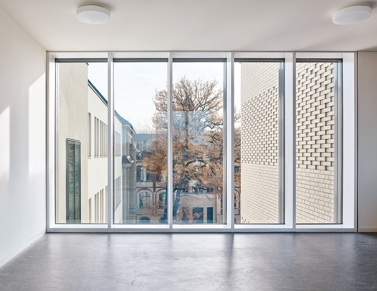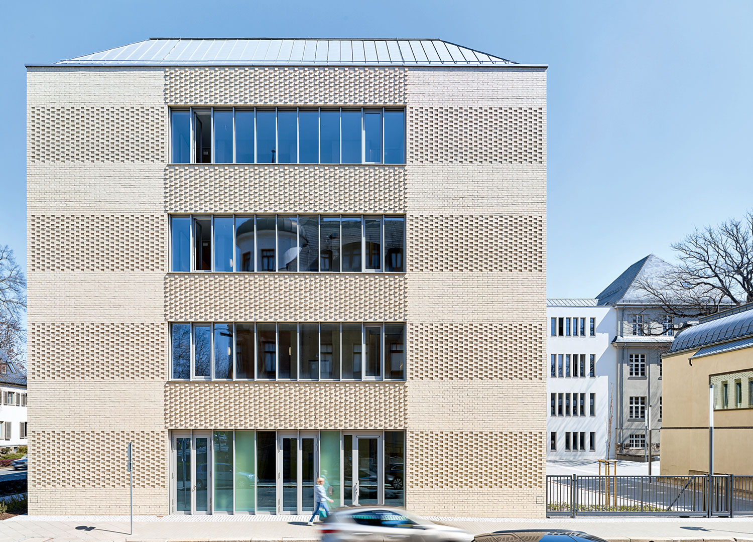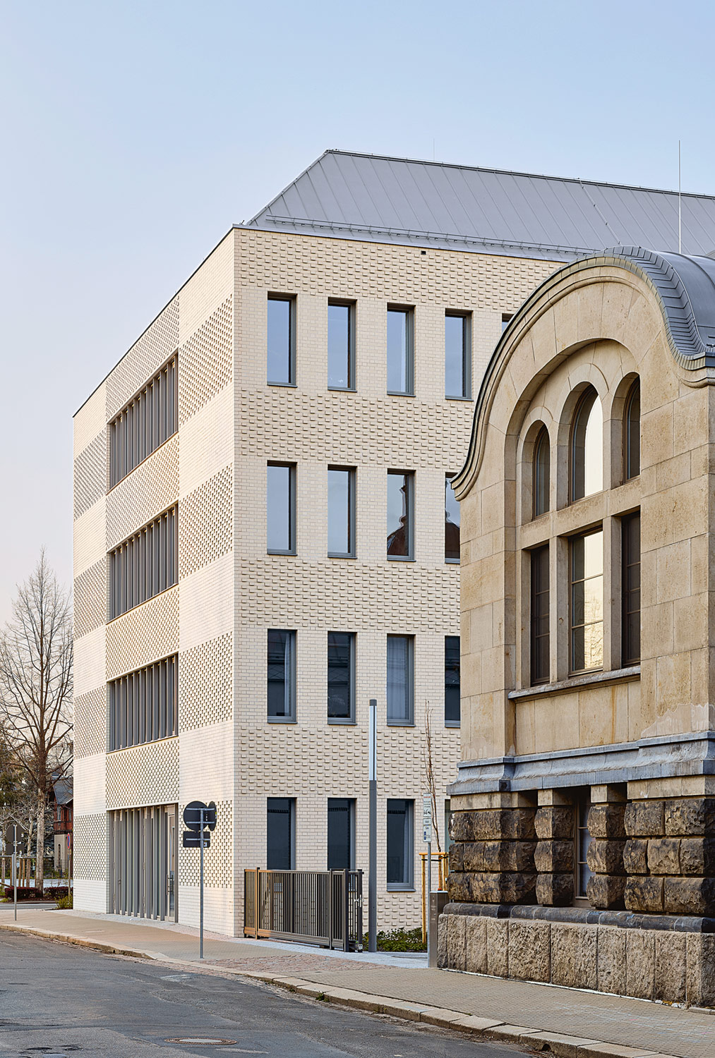 Die Fassaden werden geprägt von der streng funktional gereihten Anordnung stehender Öffnungen und der fein detaillierten Ziegelverkleidung aus hellockerfarbenen Steinen. Durch die Ziegelfassade wird das örtlich stark verbreitete Baumaterial aufgenommen und gleichzeitig eigenständig interpretiert. Die Anordnung der fein differenzierten Ziegeltexturen in Bändern, die an den Gebäudecken in der Höhenlage verspringen, sorgt für ein flächiges und abstraktes Erscheinungsbild des Gebäudes. So wird mit zeitgenössischen Mitteln auf den großen Detailreichtum der historischen Nachbarfassaden Bezug genommen.