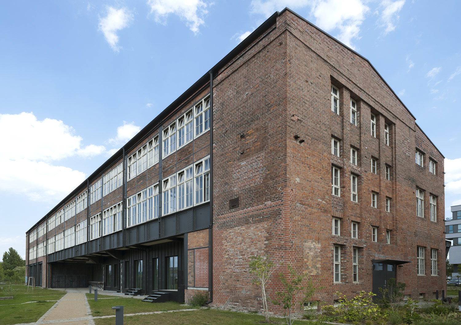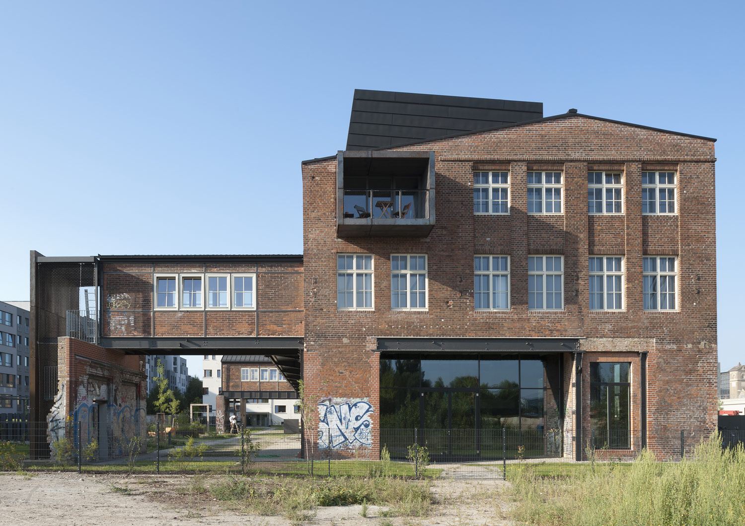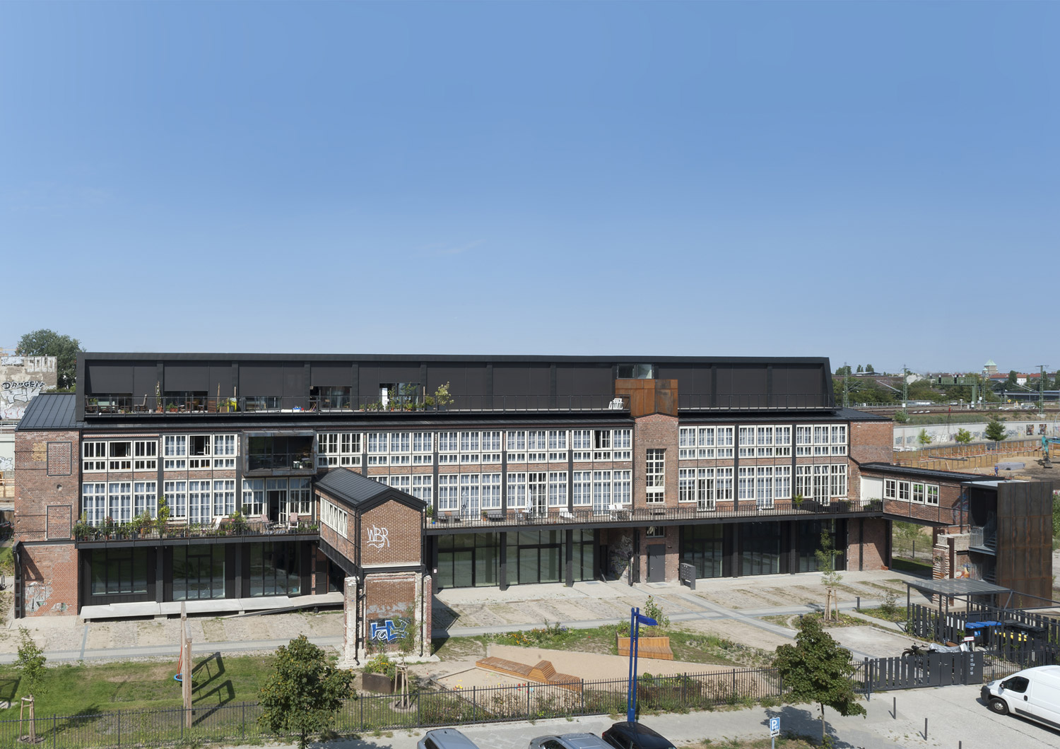 Eyrich-Hertweck Architekten haben für diese Baugruppe das ehemalige Werkstattgebäude umgebaut und aus dem Fabrikgebäude ein Wohngebäude mit 25 Wohnungen und einer Gewerbeeinheit gemacht. Behutsam wurde der denkmalgeschützte Bestand saniert und wieder seiner ursprünglichen Gestalt angenähert. Dunkle Zinkfassaden mit großen Fenstern umschließen das einst offene Erdgeschoss und – als Reminiszenz an das frühere Bitumendach – auch das neue aufgestockte Dachgeschoss. Aktuelle Ergänzungen, darunter neue Balkone, sind im Kontrast dazu mit wetterfestem, rostendem Baustahl verkleidet. Durch direkte Zugänge zu einzelnen Wohnungen von außen und einem inneren Laubengang mit Maisonetten konnte darauf verzichtet werden, ein weiteres Treppenhaus in die alte Bausubstanz einzuschneiden: die bestehenden wurden zur Erschließung des Dachgeschosses erweitert und um einen Aufzug ergänzt.