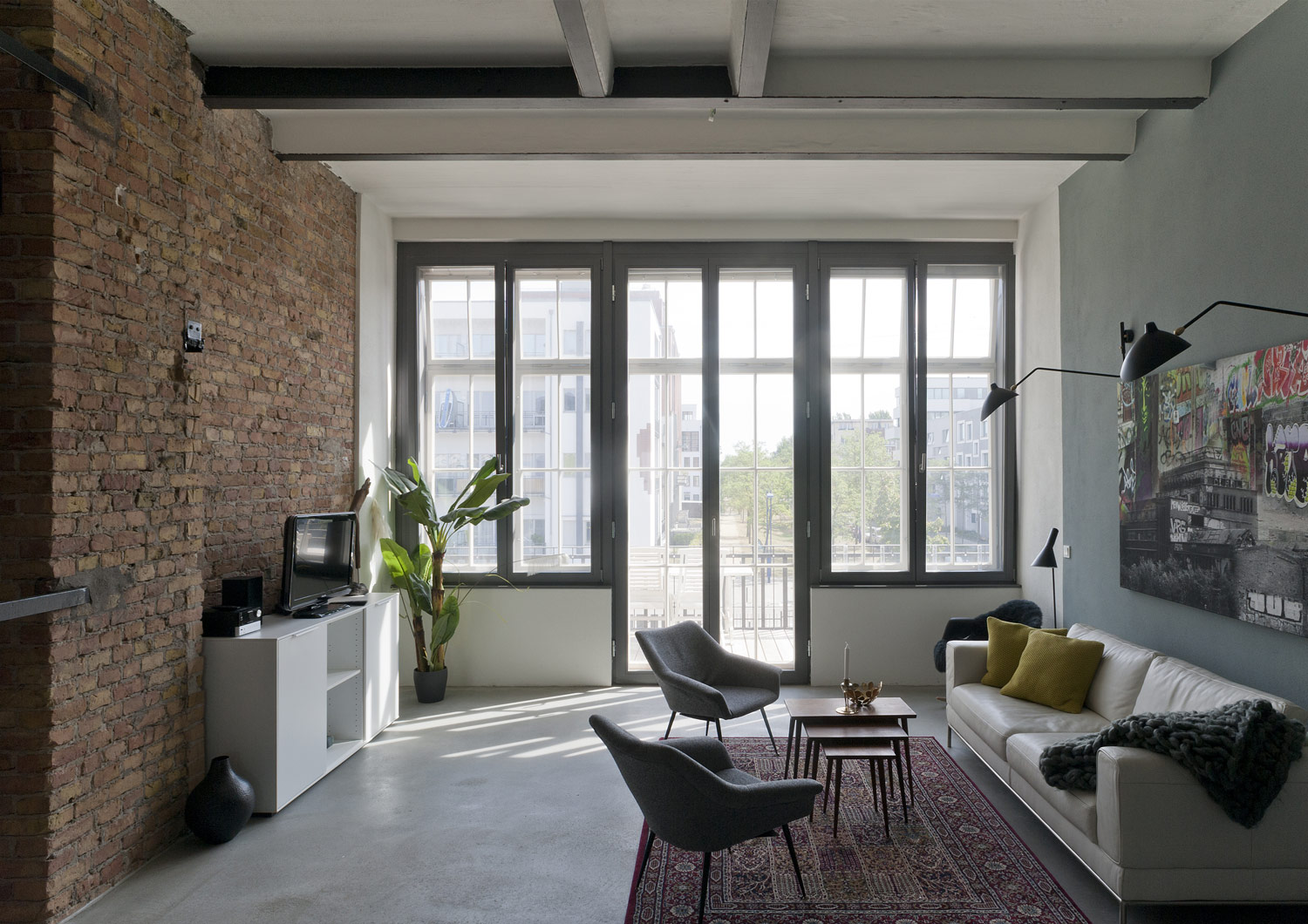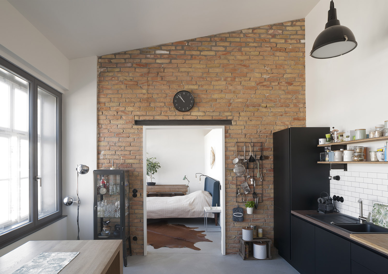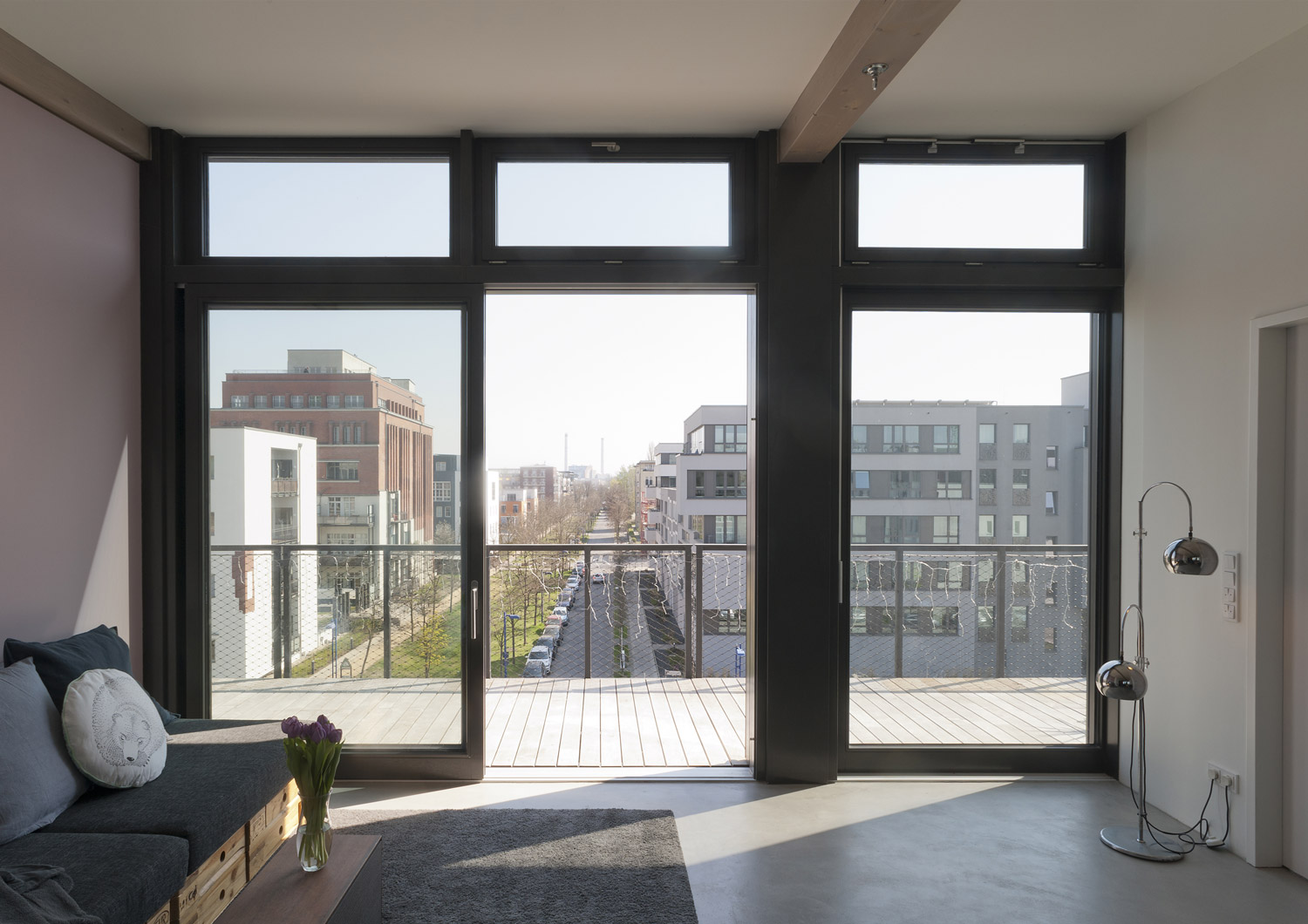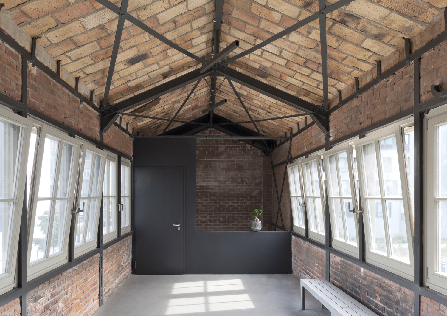 Die charakteristische Stahlskelettstruktur des Bauwerks bleibt auch in den Innenräumen sichtbar: In die hohen, lichtdurchfluteten Etagen wurden niedrige Sanitär- und Serviceboxen eingestellt, die begehbar sind und somit zusätzliche Staufläche bieten. Es entstanden fließende Räume und Blickachsen quer durch das Gebäude, die in den Wohnungen den Loft-Charakter erhalten. Energietechnisch gesehen ist das Gebäude eine Herausforderung. Die bestehende Stahlkonstruktion, deren Skelett sich von der Fassade in das Innere des Gebäudes zieht, ist sozusagen eine einzige Wärmebrücke und eine Außendämmung war für die denkmalgeschütze Glashütte nicht möglich. In weiten Teilen der historischen Längsfassaden lösen eine zweischalige, hinterlüftete Fassade und Kastenfenster das Problem: hinter die dünne, historische Mauerwerksausfachung des Stahlskeletts wurde von innen eine neue, mit Holzfaserplatten gedämmte Brüstung eingestellt. Auf dieser sitzt der innere, wärmedämmende Teil des Kastenfensters, der den Erhalt bzw. die Rekonstruktion der alten, einfach verglasten Industriefenster möglich macht. Zwischen den äußeren und inneren Flügeln der Kastenfenster ist der Sonnenschutz integriert. An den Stirnseiten des Gebäudes dämmen Calciumsilikatplatten von innen das bestehende Mauerwerk. Die Lüftung stellt eine Abluftanlage in Kombination mit Fensterfalzlüftern sicher. Der sehr gute Luft- und Trittschallschutz konnte durch die Wohnungstrennwände aus Mauerwerk und Gewichtserhöhung der Bestandsbetondecken erreicht werden. Trotz des sehr hohen baulichen und denkmalpflegerischen Schwierigkeitsgrades konnten nachhaltige und ökologische Baustoffen verwendet werden – zum Beispiel Holzfasserdämmung auch im Trockenbau, Calciumsilikatplatten, Kalkzementputz mit Silikatfarben. Zur Lösung der dämmtechnischen Probleme wurde eng mit einer Bauphysikerin zusammen gearbeitet.