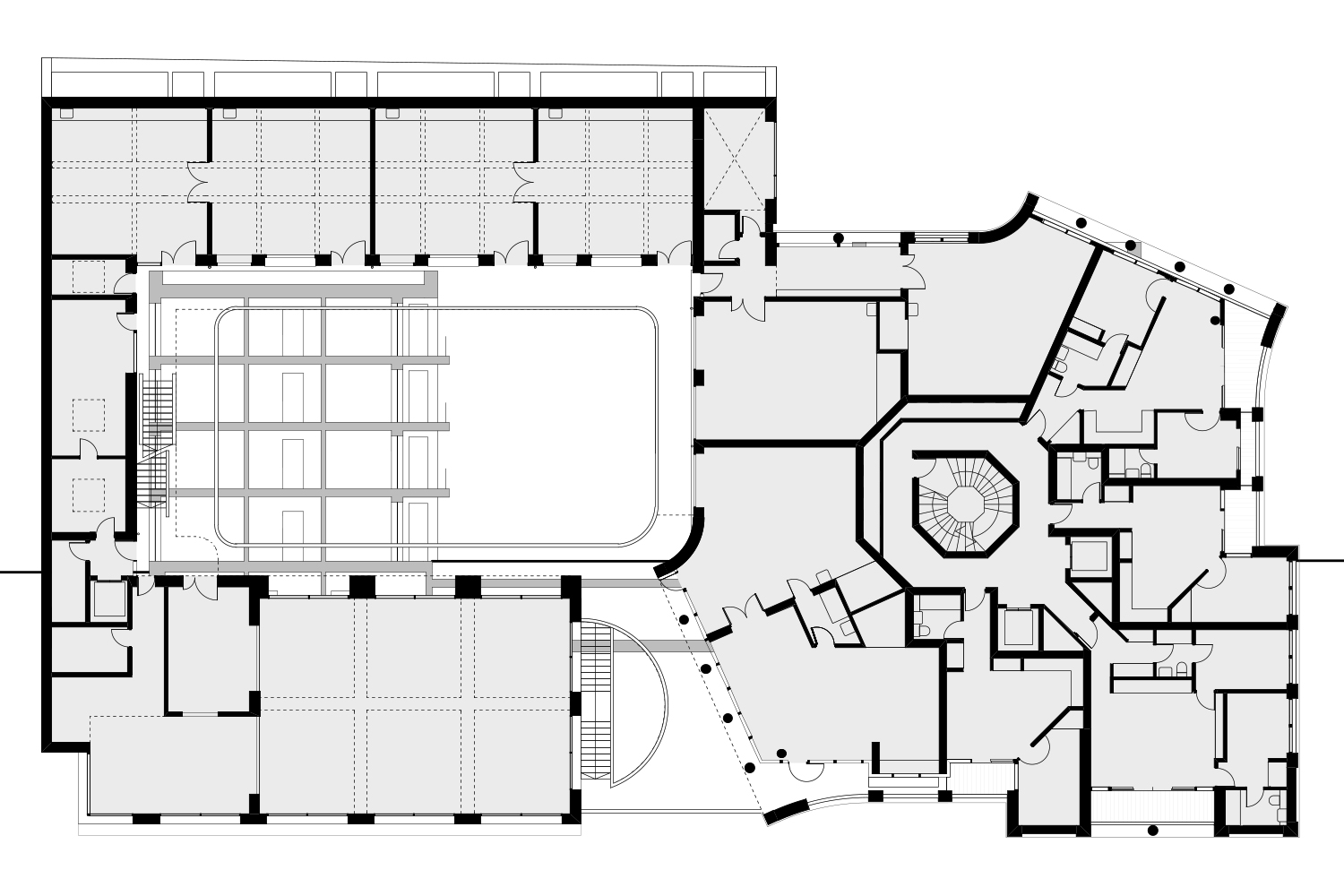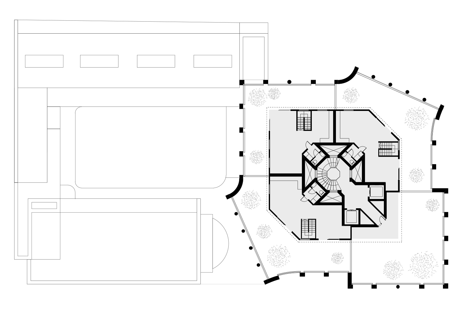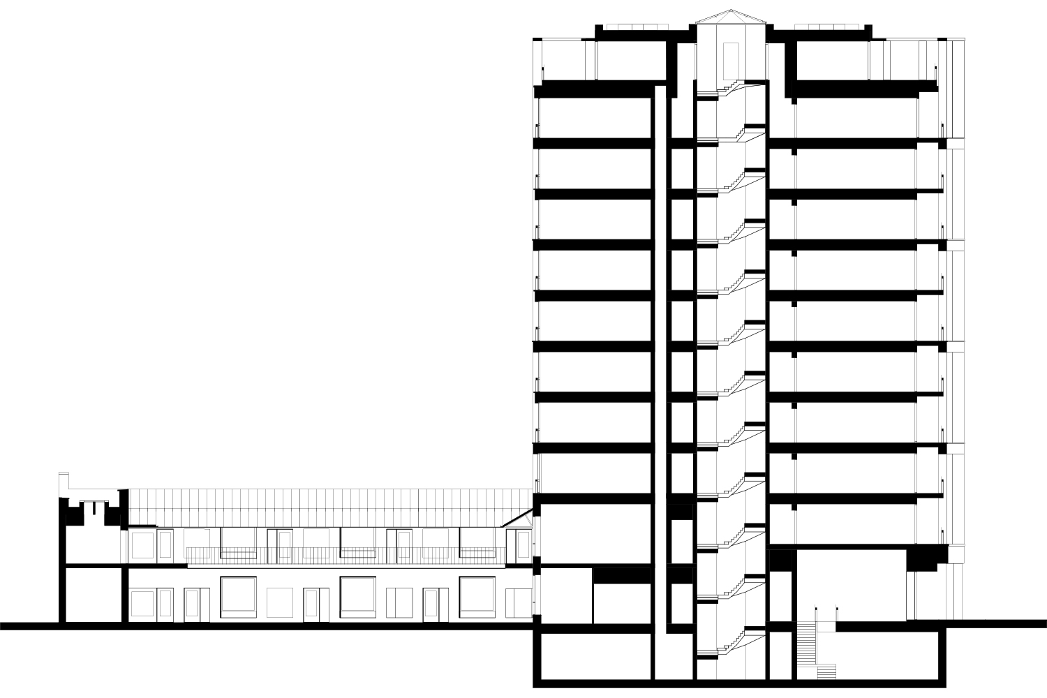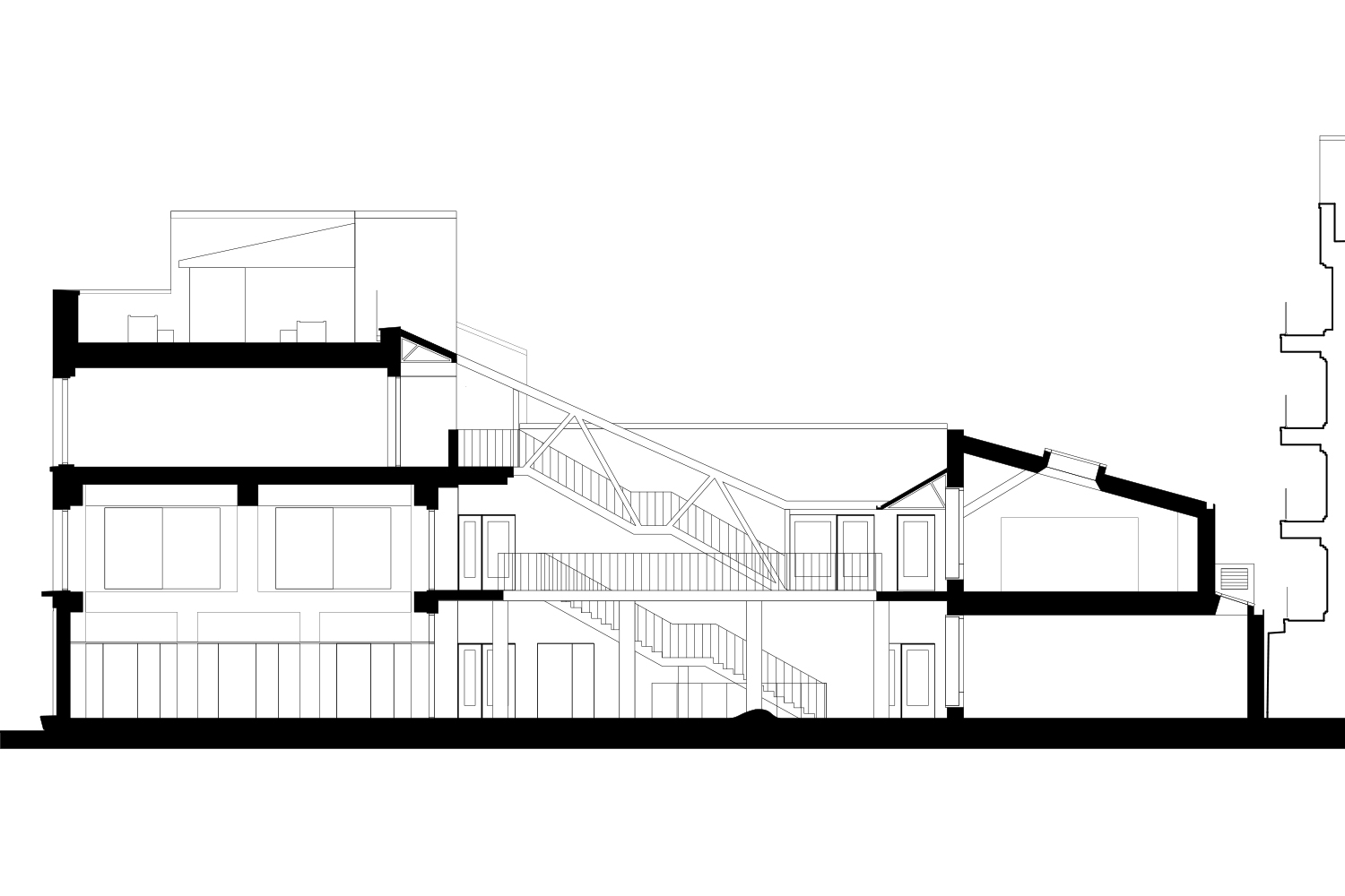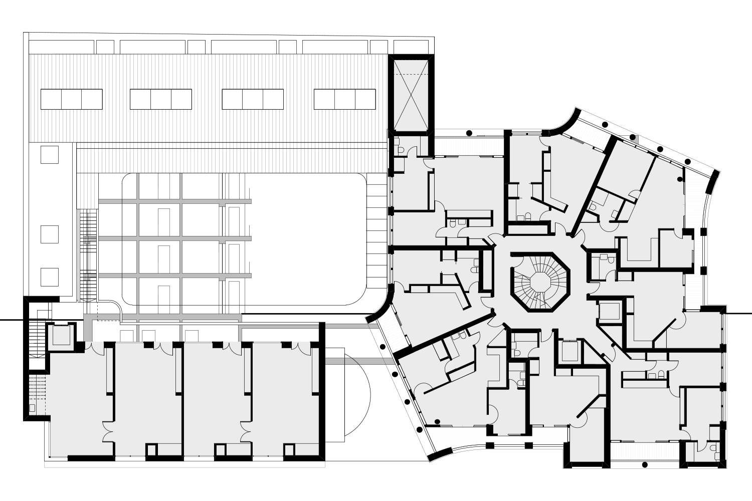 Das Mehrfamilienhaus gruppiert acht Wohnungen pro Stockwerk um eine zentrale achteckige Treppe, mit drei Maisonette-Wohnungen und einem gemeinsamen Dachgarten. Der Grundriss ist symmetrisch um eine diagonale Achse aufgebaut, die zu einer diagonalen Straße führt, die in die De Beauvoir Town Conservation Area führt. Die in die gemauerten Fassaden eingelassenen Loggien erstrecken sich über die gesamte Höhe des Gebäudes. Diese Räume vermitteln zwischen Haus und Stadt und bieten einen großzügigen Außenraum, der weit über die Mindestanforderungen hinausgeht. Die Wechselbeziehung zwischen Fassade und Struktur sowie ihre Tiefe definieren das Gebäude. Die Kombination von gemauerten Wänden und Loggien verleiht dem Gebäude eine würdevolle Robustheit und Schwellen zum Wohnen.