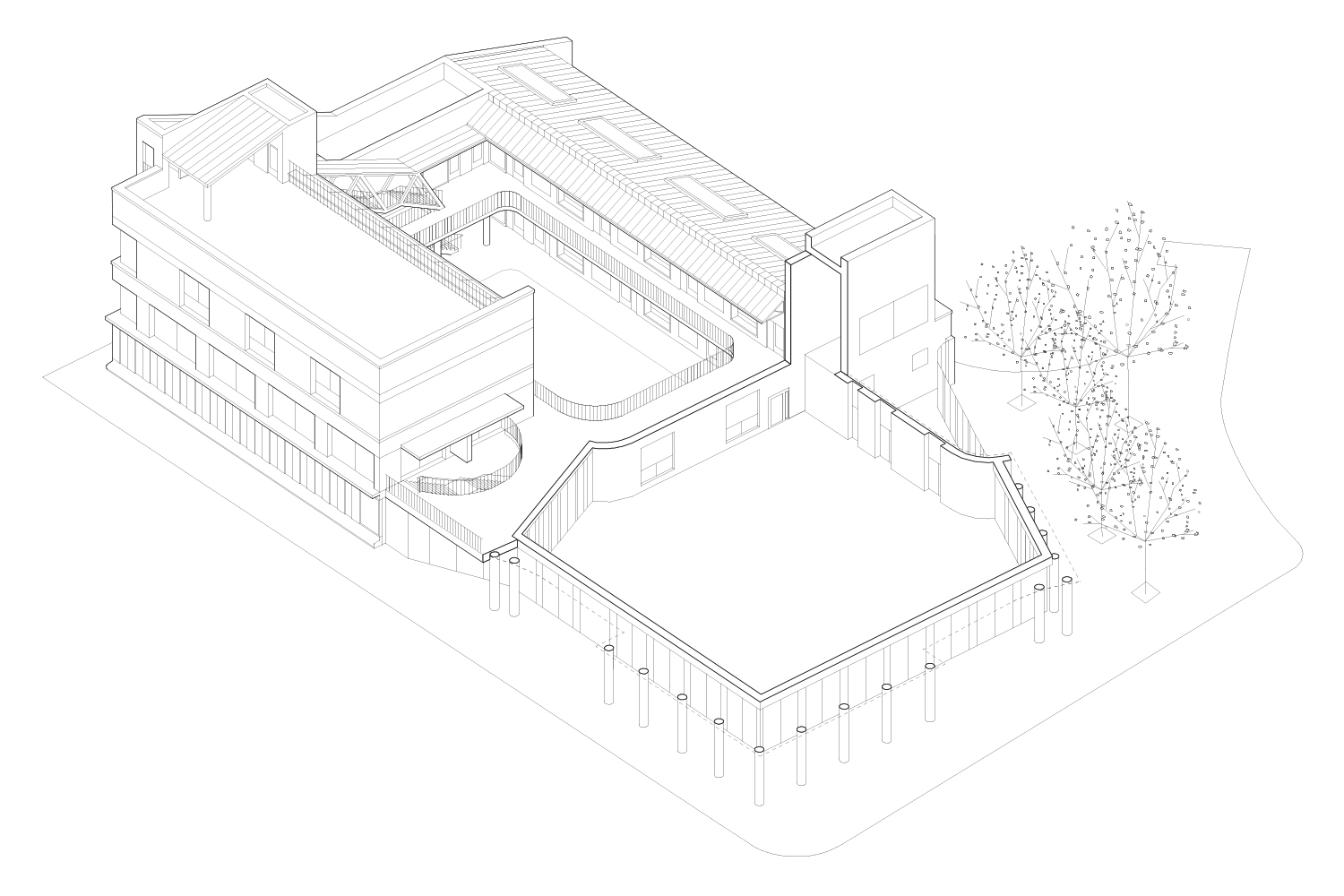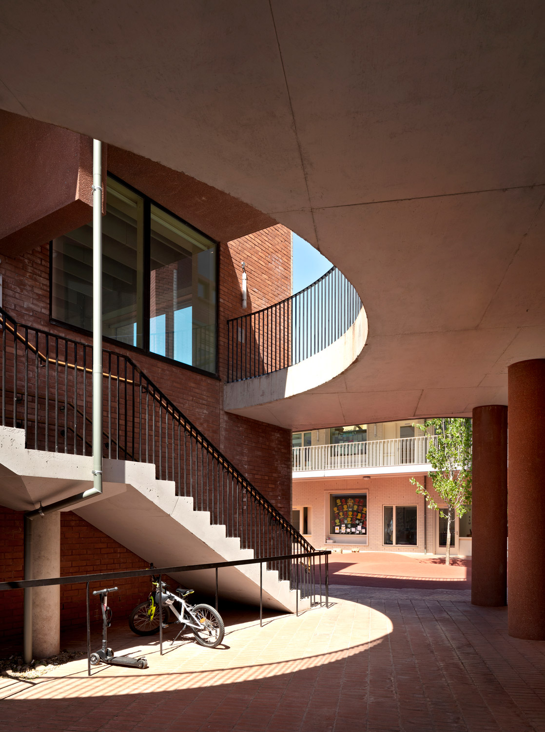 Das Herzstück der Schule ist der Innenhof, der eine Welt in verkleinertem Maßstab für kleinere Menschen darstellt. Die Bebauung ist am Rand des Geländes verteilt, um einen möglichst großen Innenhof zu schaffen, und ersetzt die internen Korridore durch offene Galerien, die sich um den Hof herum erstrecken. Das Ergebnis ist ein effizienter Grundriss mit hohem Netto-Brutto-Verhältnis, eine gesunde Zirkulation und eine direkte Beziehung zwischen Innen- und Außenraum. Jedes Klassenzimmer hat eine Art Schaufensterfront zum Innenhof – was von den jüngsten Schülerinnen und Schülern wörtlich genommen wird. Die Galerien dienen der Orientierung und Organisation der Schule auf allen Ebenen. Die Kinder sowie Lehrerinnen und Lehrer bewegen sich im Außenraum von einer Aktivität zur nächsten, was den Schülern das Verständnis und dem Personal die passive Überwachung erleichtert. Das Hofmodell ist sowohl nachhaltig als auch wirtschaftlich, da es ohne Korridore auskommt, was die Finanzierung zusätzlicher Unterrichtsräume und die Planung eines kleineren Gebäudes ermöglicht. Zwei Klassenzimmer mit zwei Seiten sind mit Doppeltüren verbunden, so dass jede Jahrgangsstufe mit 50 Kindern gemeinsam lernen kann. Die Lernräume sind alle zum Innenhof hin ausgerichtet und überblicken sich gegenseitig. Die Rezeption befindet sich im Erdgeschoss, die Klassen 1 bis 4 im ersten Stock und die Klassen 5 bis 6 im zweiten Stock. Über das Lernen hinaus spielt eine große Rolle, wie der Raum die Interaktion gestaltet, und Momente hervorzaubert, die Assoziationen und Freundschaften fördern. Die Halle neben dem Schuleingang, die einen Puffer zur Straße bildet, wird durch ein Oberlicht erhellt und ihre blinde Erdgeschossfassade wird durch eine nach Süden ausgerichtete Bank zur Straße hin markiert. Hier können die Eltern sitzen und sich unterhalten, während sie auf ihre Kinder warten. Solche in der Bausubstanz verankerten Räume betten soziale Muster in die Architektur ein, die Wand wird zu einer Form der sozialen Infrastruktur.