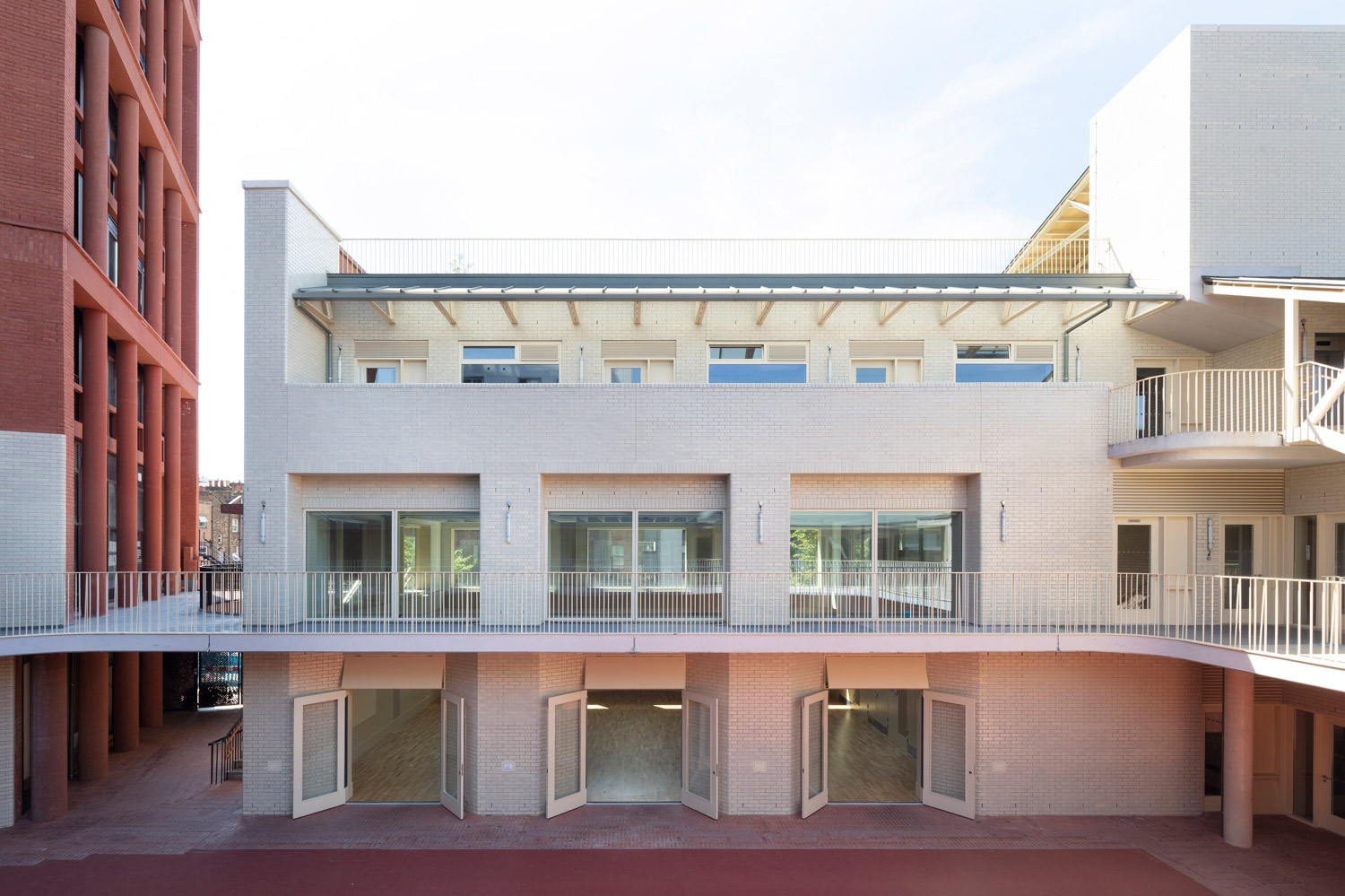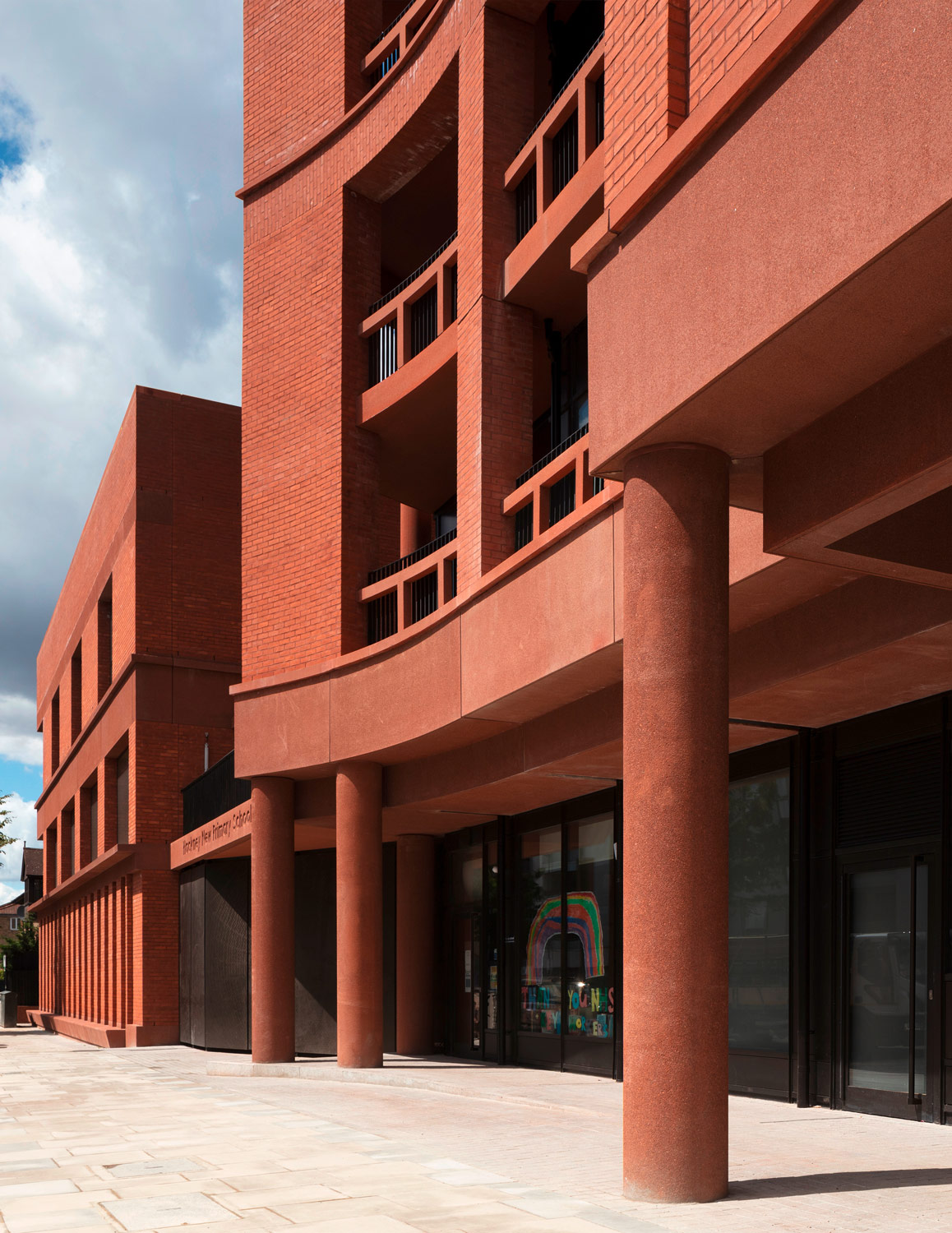 Das Gebäude besteht überwiegend aus rotem Backstein, mit Elementen – Säulen, Balken, Wangen und Brüstungen – aus Betonfertigteilen, deren tiefrote Farbe vom roten Granitzuschlag und roten Sand herrührt. Handverlegtes, spitz zulaufendes Mauerwerk wird mit vorgefertigten Backsteinwangen und freiliegenden Fertigteilen kombiniert, die stark geätzt sind, um die Textur der Zuschlagstoffe sichtbar zu machen. Das Mauerwerk ist im Detail gestuft, facettiert und geschwungen und bietet Platz für einheitliche Öffnungen und Loggien. Der Innenhof ist mit einem hellen, elfenbeinfarbenen glasierten Backstein verblendet, der mit einer variablen lichtdurchlässigen Glasur versehen ist, um den Raum zu beleuchten.