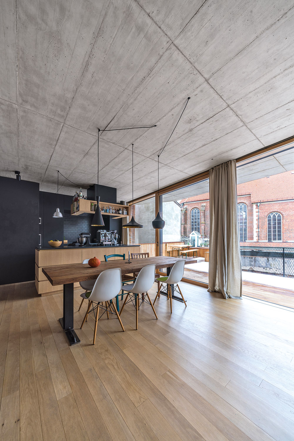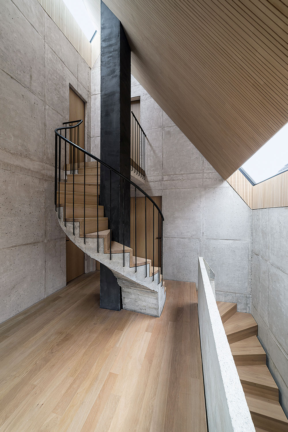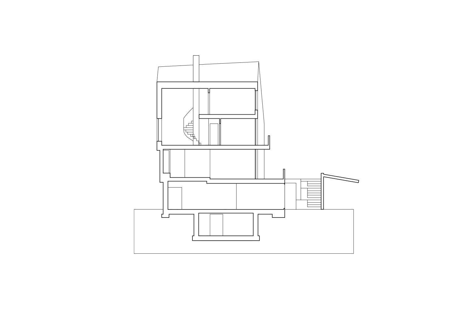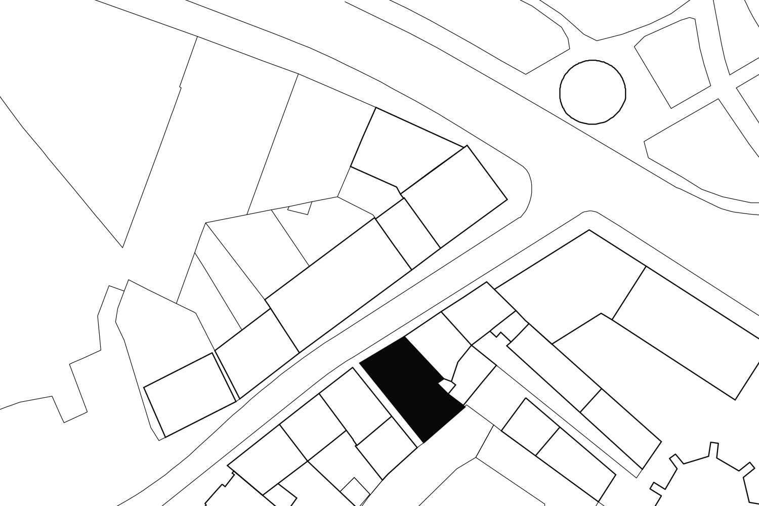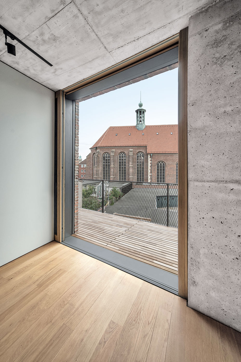 Die Fassade des monolithisch wirkenden Baukörpers leitet sich aus den Fluchten der angrenzenden Häuserzeilen sowie der Bauflucht der eigenen Grundstücksgrenze ab. Nach oben hin fächern sich die Geschosse über die eigentliche Grenze hinaus auf. Das vergrößert nicht nur die Wohnfläche, sondern schlägt eine Brücke zur Moderne: Die Inspiration der Kraggeschosse liegt in Lyonel Feiningers Werk „Die Stadt am Ende der Welt“ der 1920er-Jahre und zeigt eine ähnliche kollektiv verankerte Typologie von städtischer Maßstäblichkeit. Das Haus ist über vier Geschosse organisiert. Im Erdgeschoss befinden sich das Entrée, ein Multifunktionsbereich, der Innenhof und die Garage. Im ersten Obergeschoss folgen der Wohn- und Essbereich, die Küche und eine Dachterrasse mit Blick auf die Observantenkirche. Darüber befinden sich ein weiterer Wohnbereich sowie die Schlaf- und Arbeitszimmer mit Bädern.