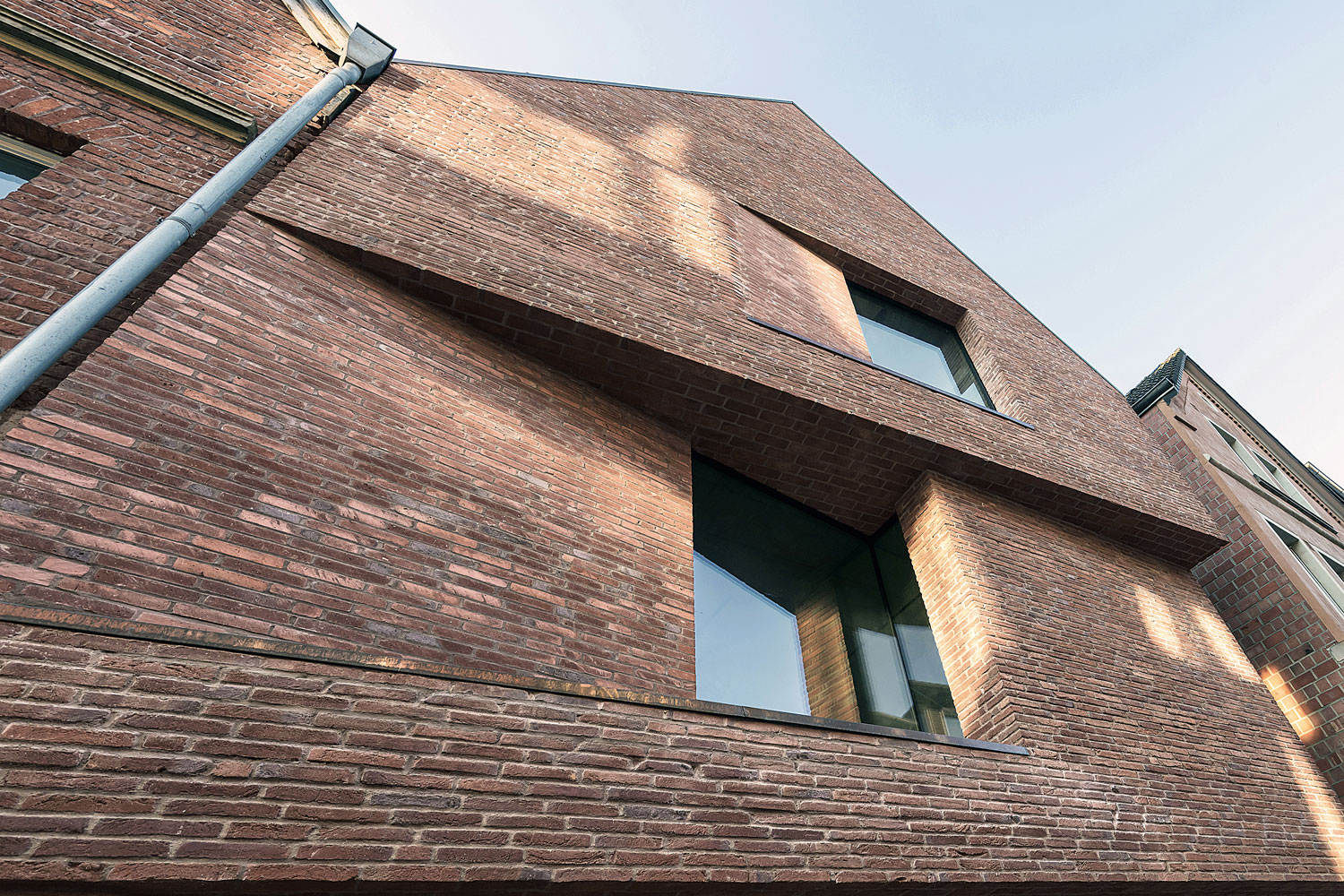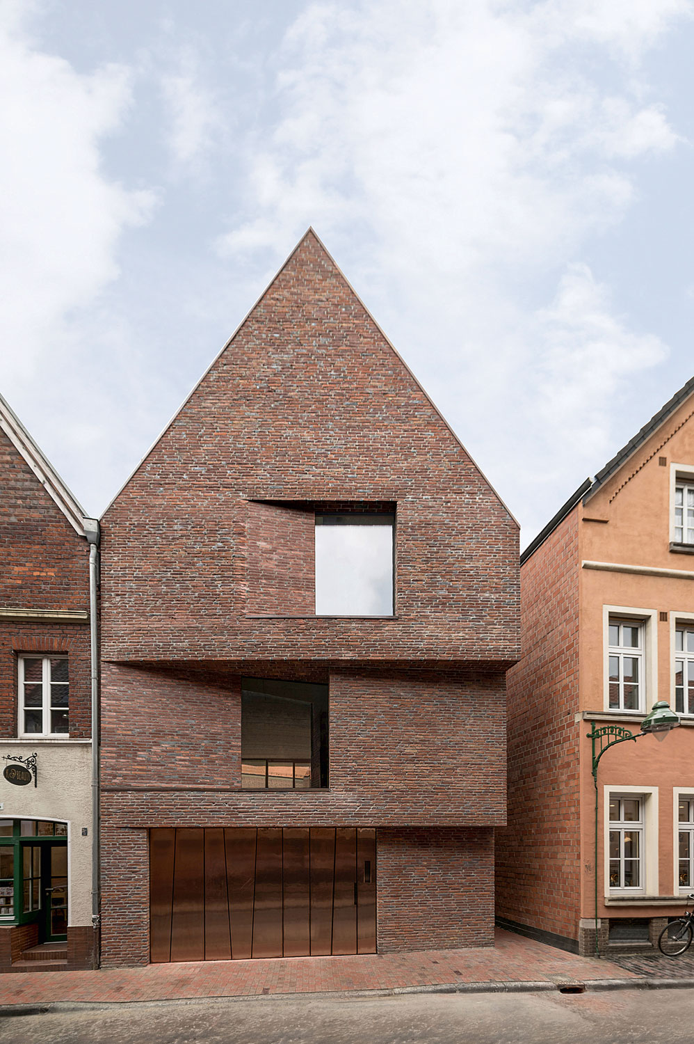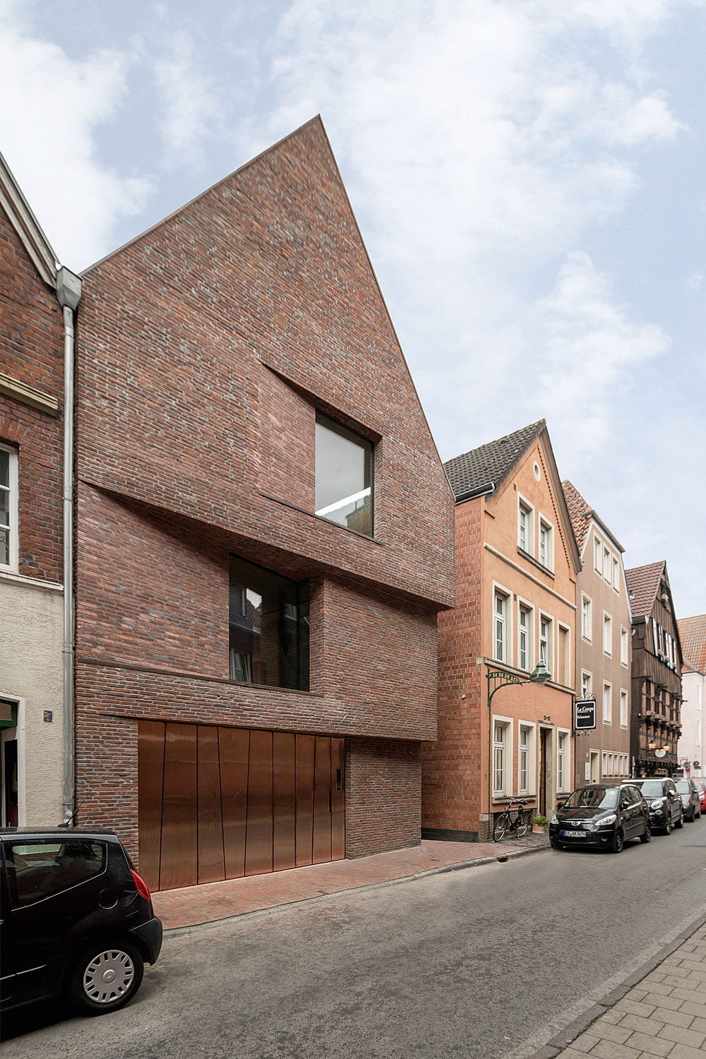 Die Fassadensprünge finden sich in den Öffnungen zur Straße wieder: Im ersten Obergeschoss ist das Fenster ein nach innen gestülpter Erker. Von hier aus haben die Bewohner Sicht auf den Buddenturm. Auch im zweiten Obergeschoss ermöglicht eine großzügige Fensteröffnung Ausblicke. Weitere Brüche schaffen die Architekten in der Fassadengestaltung durch die puristische Gestaltung der Öffnungen. Im Erdgeschoss verkleiden Kupferpaneele Garagentor und Hauseingang. Sie verwehren Einblicke ins Innere des Hauses, spiegeln aber die Umgebung wider. Beim Fassadenmaterial griffen die Architekten auf den für die Münsteraner Altstadt typischen Ziegel zurück. Bei den kohlegebrannten Handformziegeln aus dem Ringofen gab es keinen Verschlag, um die Ursprünglichkeit des Materials zur Geltung zu bringen. Nach dem Vermörteln wurde die Fassade lediglich mit dem Besen gereinigt; so blieben die Spuren des Handwerks erhalten. Der Innenraum ist geprägt von Sichtbeton an Wänden und Decken, sowie von geölten Eichendielen am Boden. Fest engagiert in diesem spannungsreichen Ensemble ist das Licht: Im Bereich des Treppenraumes fächert sich das Haus geschossweise zunehmend zum Tageslicht auf, das durch Dachverglasungen an den Traufwänden und im First in das Haus gelangt. Indirektes Licht moduliert je nach Tages- und Jahreszeit die Raumstimmungen.