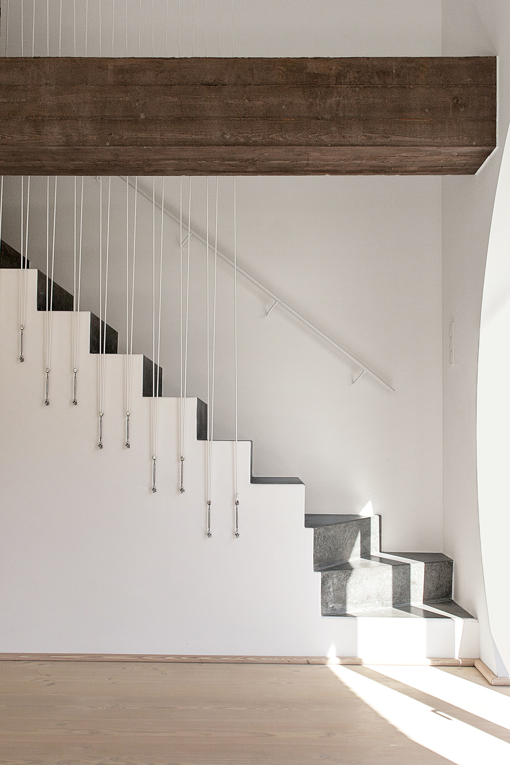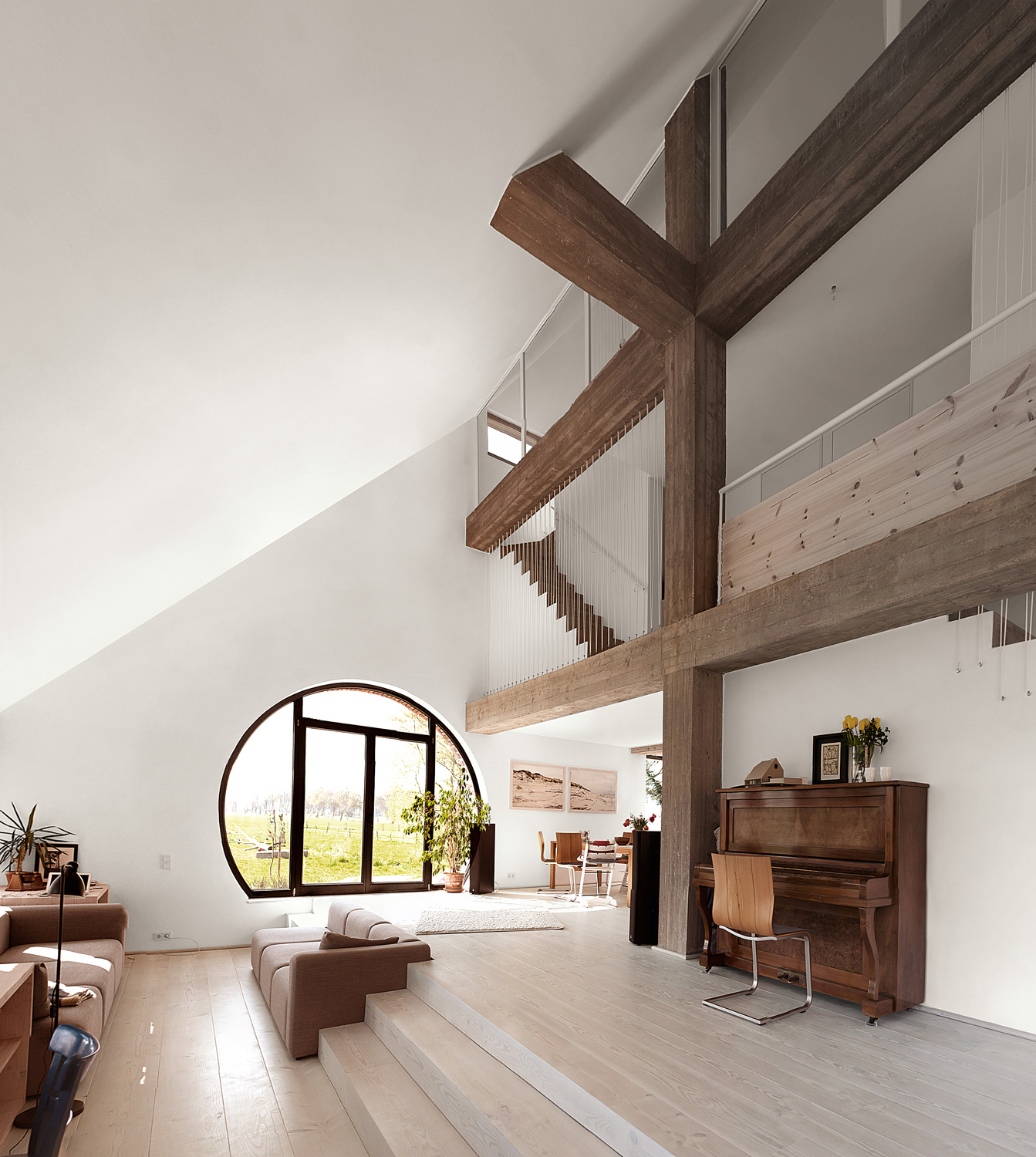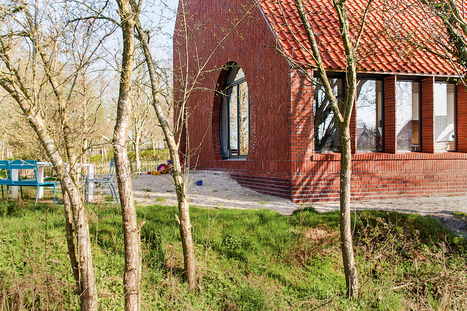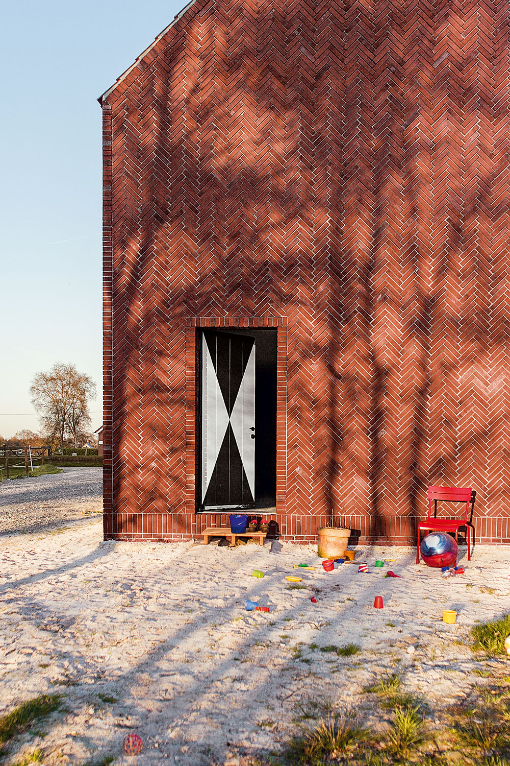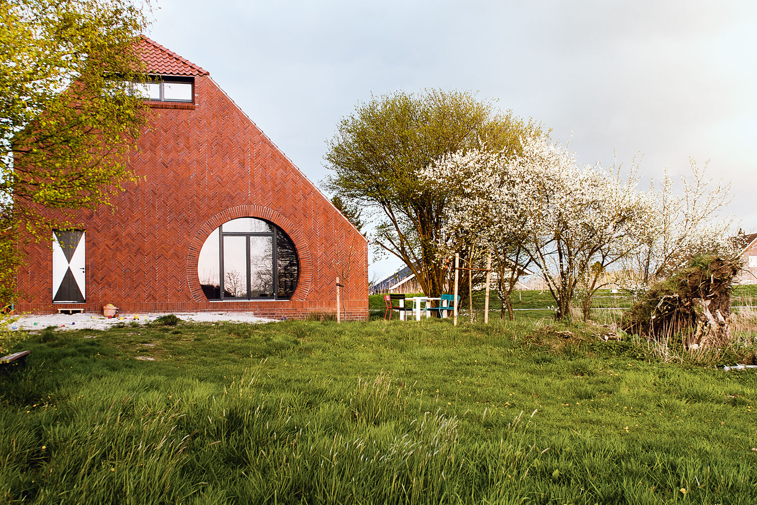 Das tiefe Dach, die Backstein-Fassade, die runden Fenster und die heraldisch dekorierte Tür greifen den Lokalstil der Region auf, der bis ins Mittelalter zurückgeht. Thomas Kröger hat diese Motive in ein modernes Haus auf dem Land überführt.