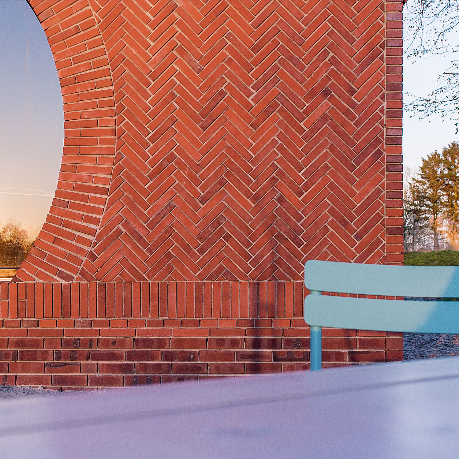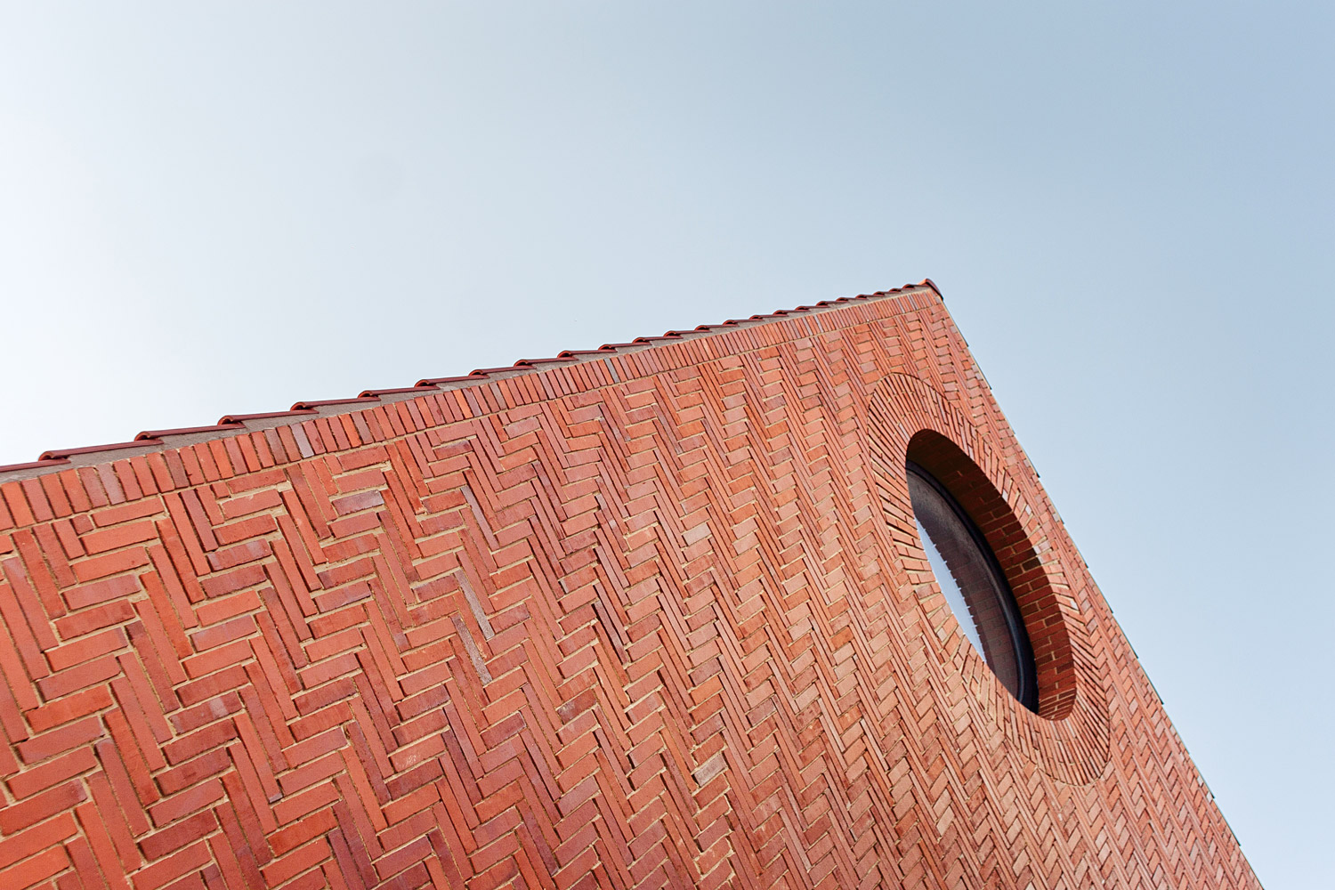 Die regional in der Dachpfannenfarbe gebrannten Fassadenziegel erzeugen ein monolithisches Bild des Baukörpers. Die Giebelfassaden mit den großen runden Toren zum Wohnraum sind in einem filigranen Fischgrätverband gemauert, welcher das um 45 Grad geneigte Dach in den Mauerwerksverband weiterträgt.