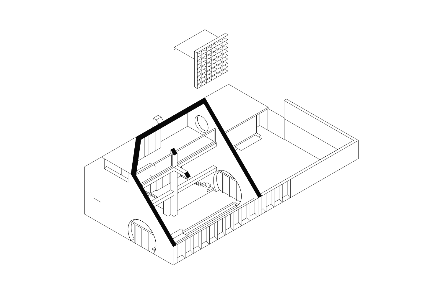 Die Gestalt des Hauses ist an die regionale Bauweise der Gulfhäuser angelehnt. Das Gulfhaus ist eine Bauernhausform, die im 17. Jahrhundert aufkam und als Holzgerüstbau in Ständerbauweise ausgeführt wurde. Der Gulf, als Einheit zwischen vier Holzpfeilern, bildet das Zentrum des Scheunentraktes und bietet Fläche für das Erntegut. Thomas Kröger hat die tief hinuntergezogene Dachform und das Konstruktionsprinzip an die Holzbauweise angelehnt, diese aber in Stahlbeton übersetzt. Rau geschalt und überdimensioniert wirkt sie raumbildend und skulptural.