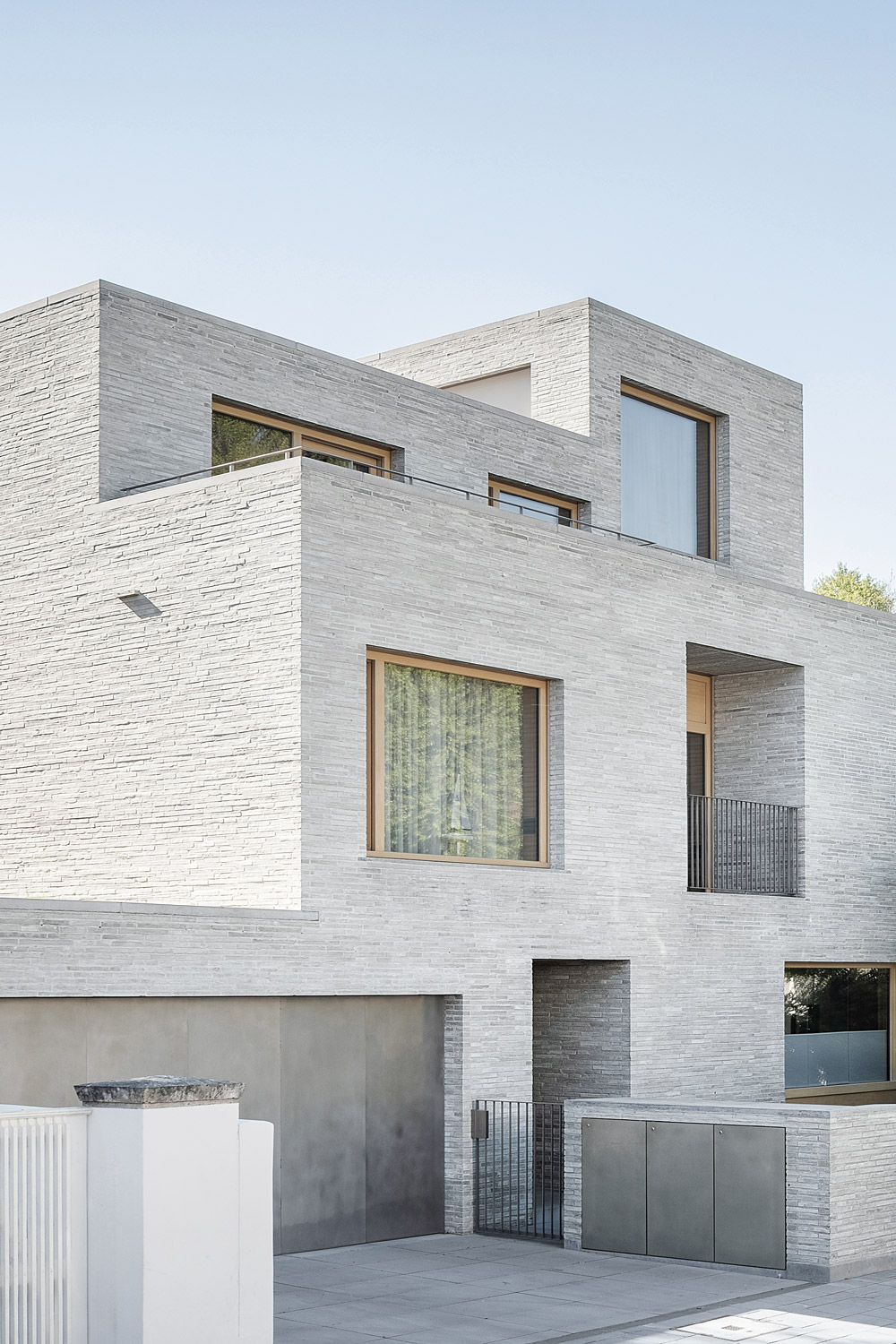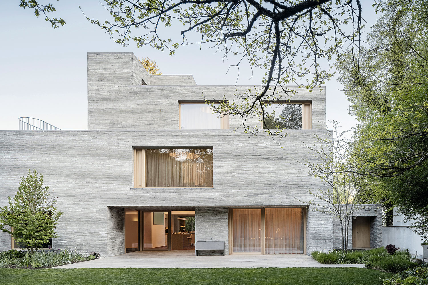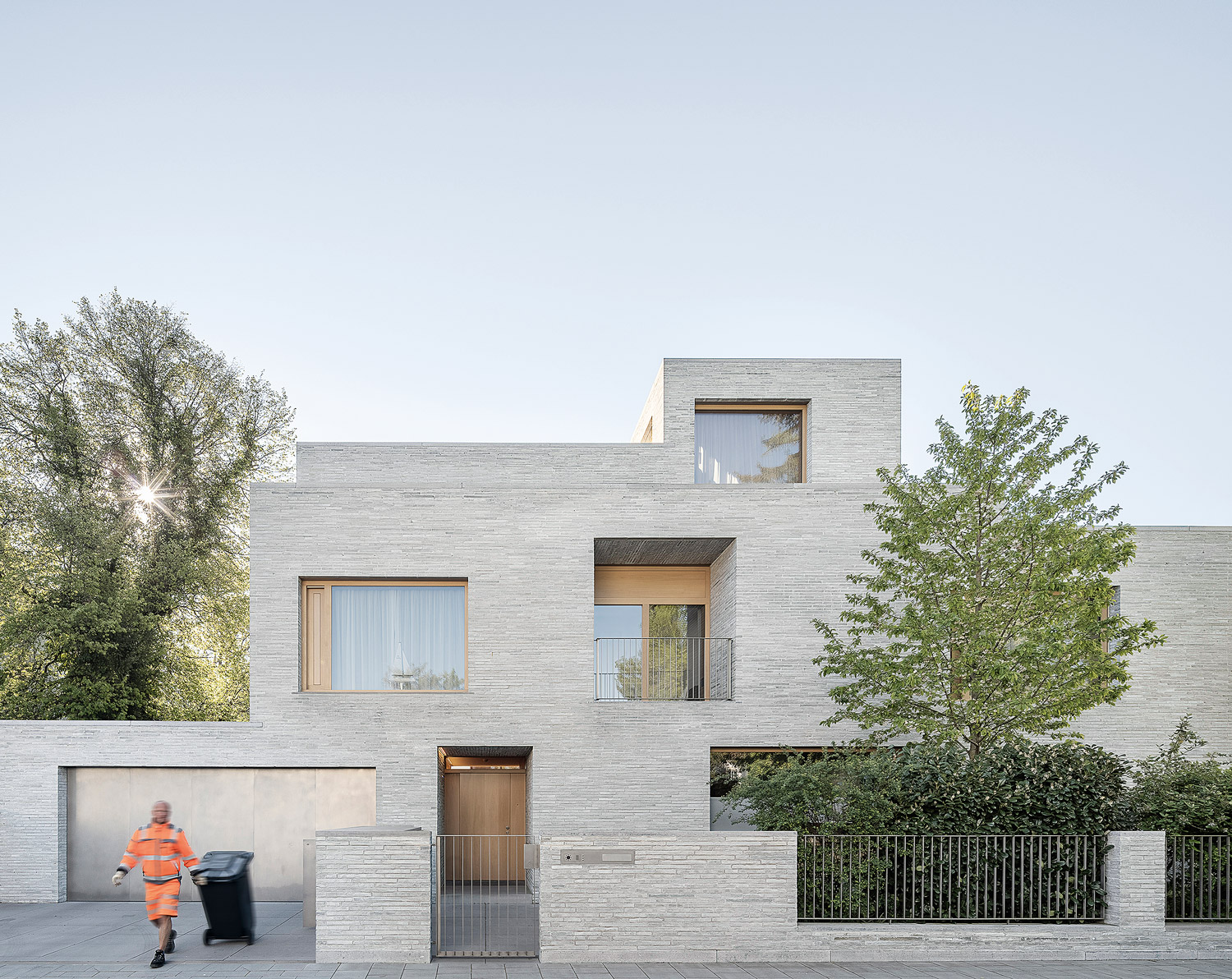 Der Entwurf orientiert sich an den Bedürfnissen der bewohnenden Familie und ordnet das gemeinschaftliche Lebenszentrum in der Mitte des Hauses an. Um diese Mitte herum liegt eine privatere Raumschicht, deren Nutzung sich über mehrere Geschosse hinweg sowohl zur Mitte hin als auch nach außen in den Garten und zum Straßenraum hin orientiert. Handgefertigter dänischer Backstein und große Fenster aus massivem Eichenholz verleihen den scharf geschnittenen Formen und Fassadenflächen durch ihre nuancierten Licht- und Schattenverläufe sowohl Maßstäblichkeit wie auch eine besonders sinnliche, haptische und handwerkliche Präsenz. Gleichwohl bekleidet und schützt der langformatige Stein die mehrschichtige, moderne Wandkonstruktion und kontrastiert mit den warmen Tönen und Oberflächen im Innern des Gebäudes. Außen also: solide, wehrhaft, ausladend, muskulös. Innen: bergend, labyrinthisch, verspielt und weich. Komplementäre Dispositionen, deren vermeintliche Gegensätze Spannung erzeugen und die verwendeten Teile zu einem kohärenten Ganzen zusammenfließen lassen. Die Architektur bildet hierbei lediglich eine Art Folie – ein Passepartout für das Alltägliche.