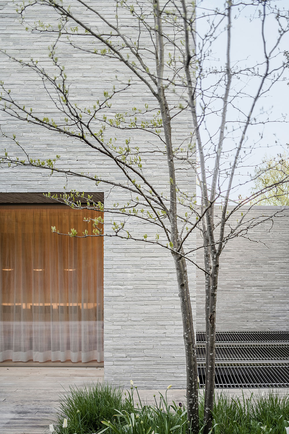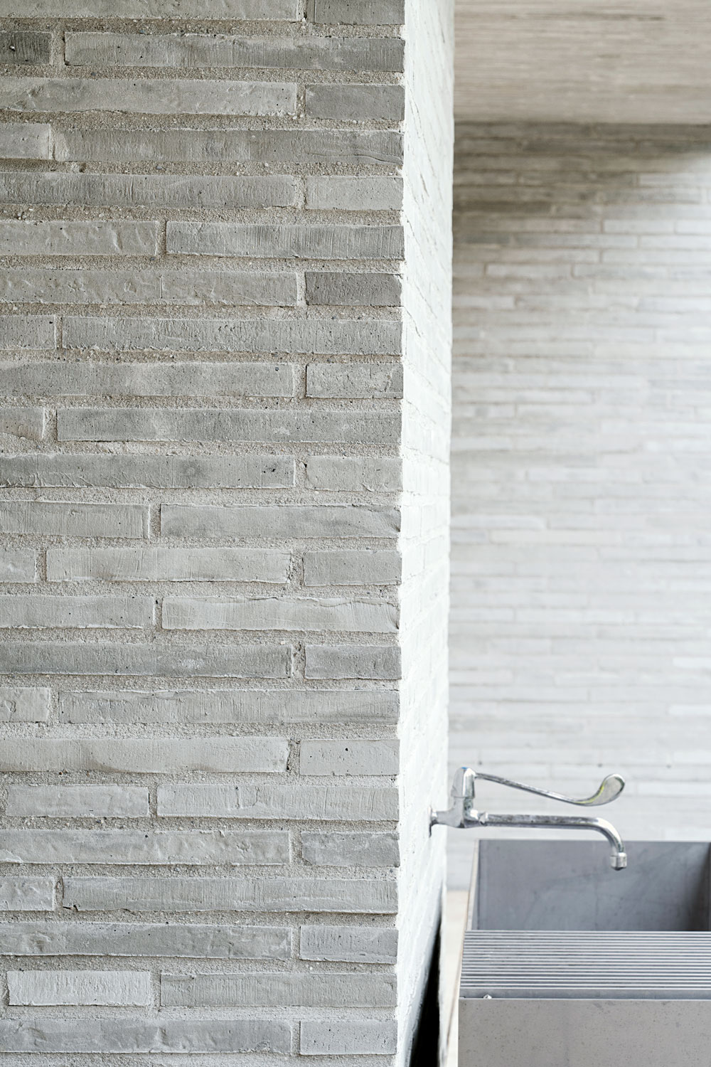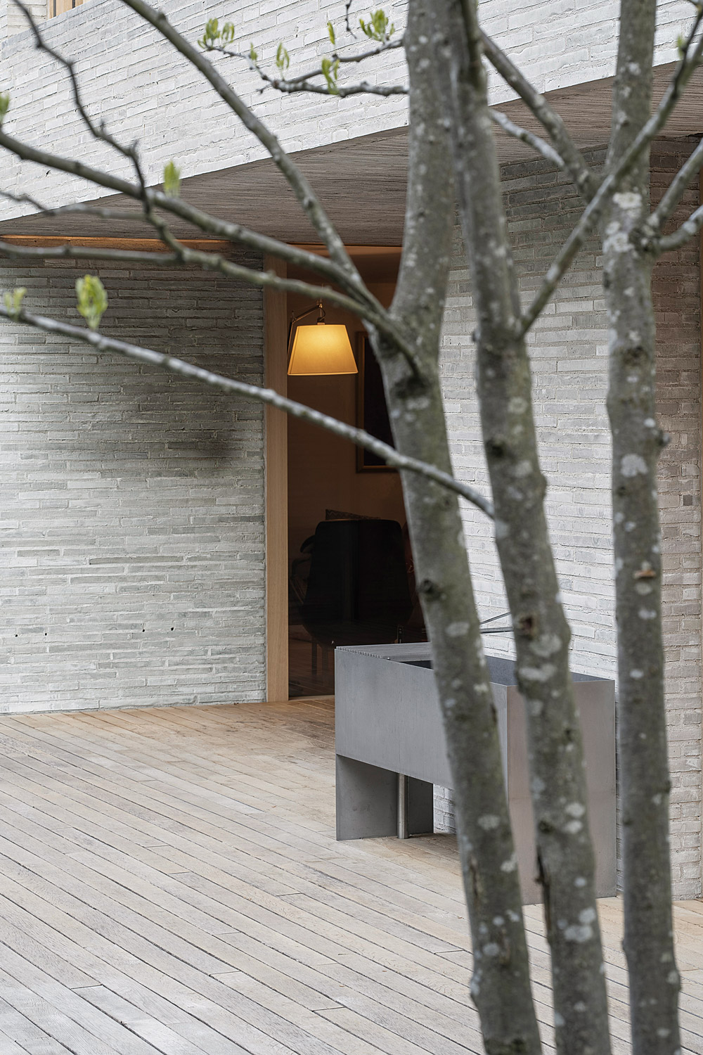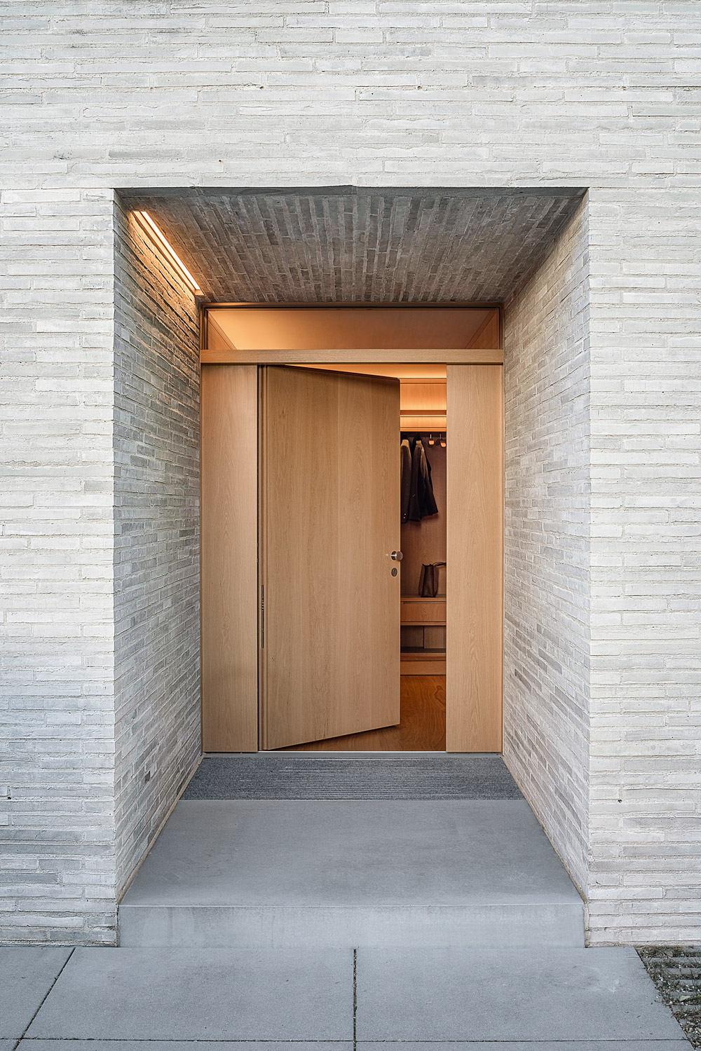 Der Entwurf orientiert sich an den Bedürfnissen der bewohnenden Familie und ordnet das gemeinschaftliche Lebenszentrum in der Mitte des Hauses an. Um diese Mitte herum liegt eine privatere Raumschicht, deren Nutzung sich über mehrere Geschosse hinweg sowohl zur Mitte hin als auch nach außen in den Garten und zum Straßenraum hin orientiert. Handgefertigter dänischer Backstein und große Fenster aus massivem Eichenholz verleihen den scharf geschnittenen Formen und Fassadenflächen durch ihre nuancierten Licht- und Schattenverläufe sowohl Maßstäblichkeit wie auch eine besonders sinnliche, haptische und handwerkliche Präsenz. Gleichwohl bekleidet und schützt der langformatige Stein die mehrschichtige, moderne Wandkonstruktion und kontrastiert mit den warmen Tönen und Oberflächen im Innern des Gebäudes. Außen also: solide, wehrhaft, ausladend, muskulös. Innen: bergend, labyrinthisch, verspielt und weich. Komplementäre Dispositionen, deren vermeintliche Gegensätze Spannung erzeugen und die verwendeten Teile zu einem kohärenten Ganzen zusammenfließen lassen. Die Architektur bildet hierbei lediglich eine Art Folie – ein Passepartout für das Alltägliche.
