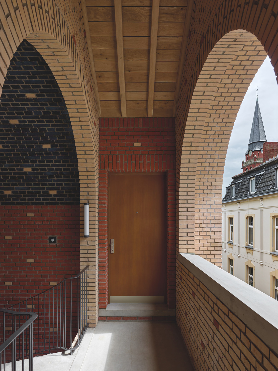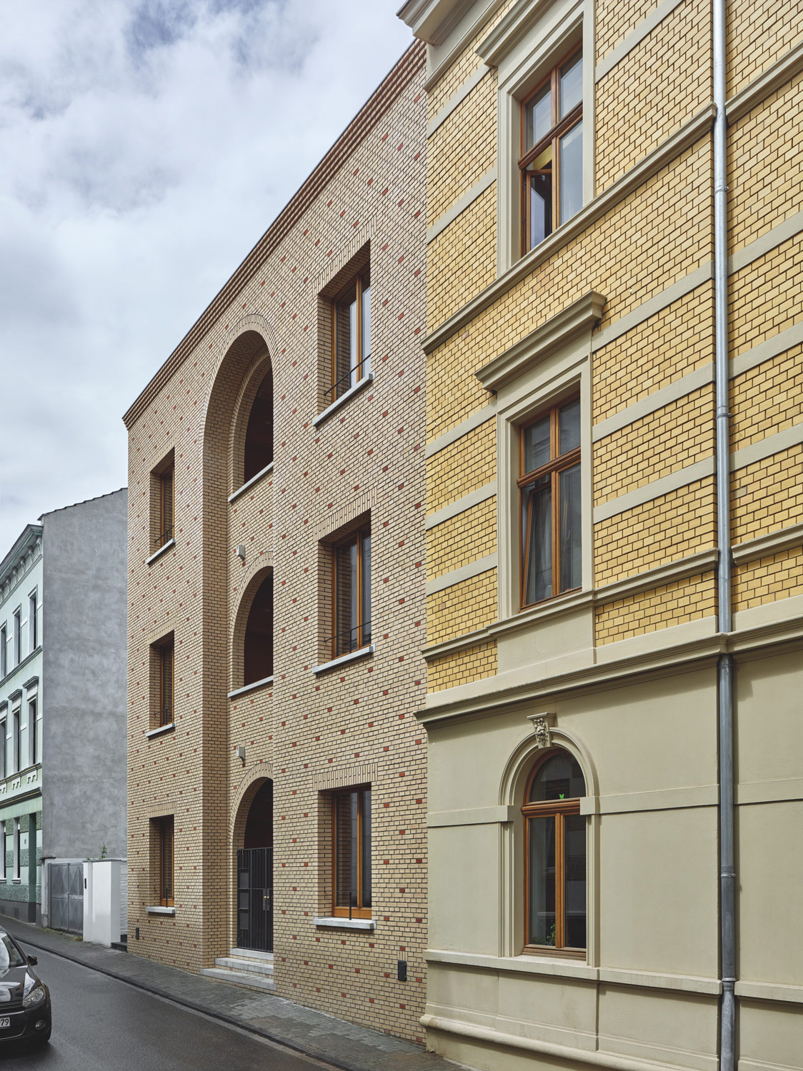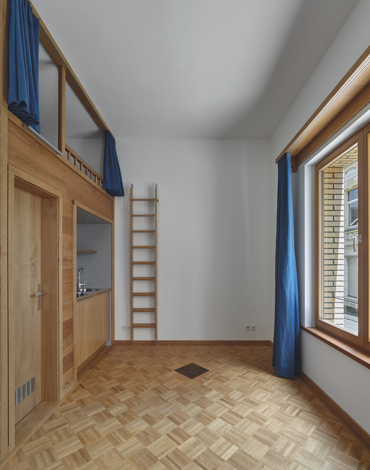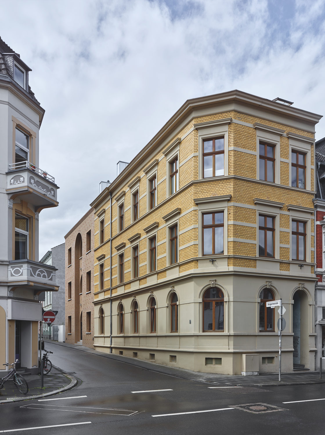 Materialität und Farbigkeit des Ziegels binden das Haus nicht nur in die direkte Nachbarschaft zurück. Zugleich verweisen Sie auf die alten Institutsgebäude der Universität Bonn, wie zum Beispiel die Neue Anatomie (1868–1872, August Dieckhoff, Jacob Neumann) oder das Physiologische Institut (1875–1878, Jacob Neumann). Eine der Vorstellung vorbehaltene Korrespondenz der Orte also, welche auf der Verwandtschaft von Widmung, Materialität, und Farbigkeit gründet. Im Inneren verfügen die sechs Appartements jeweils nur über einen Raum, in welchen ein Funktionskörper aus Bad, Küche und darüberlegender Schlafempore eingestellt ist. Auch das Mosaikparkett rekurriert in symbolischer Weise auf die Vorstellung einer ursprünglich textilen Raumbildung.