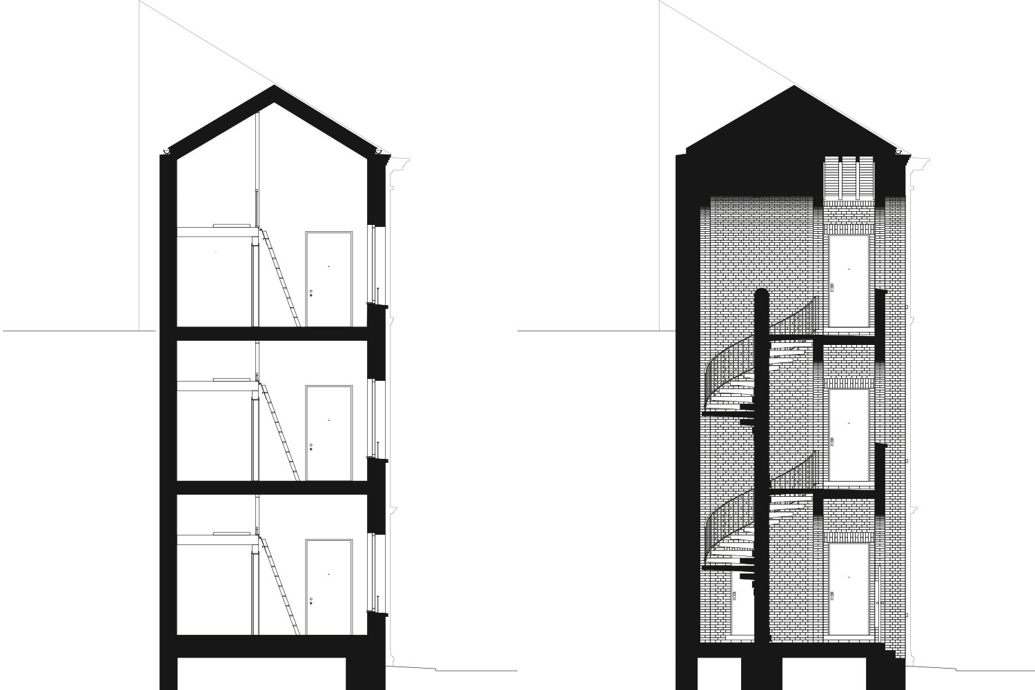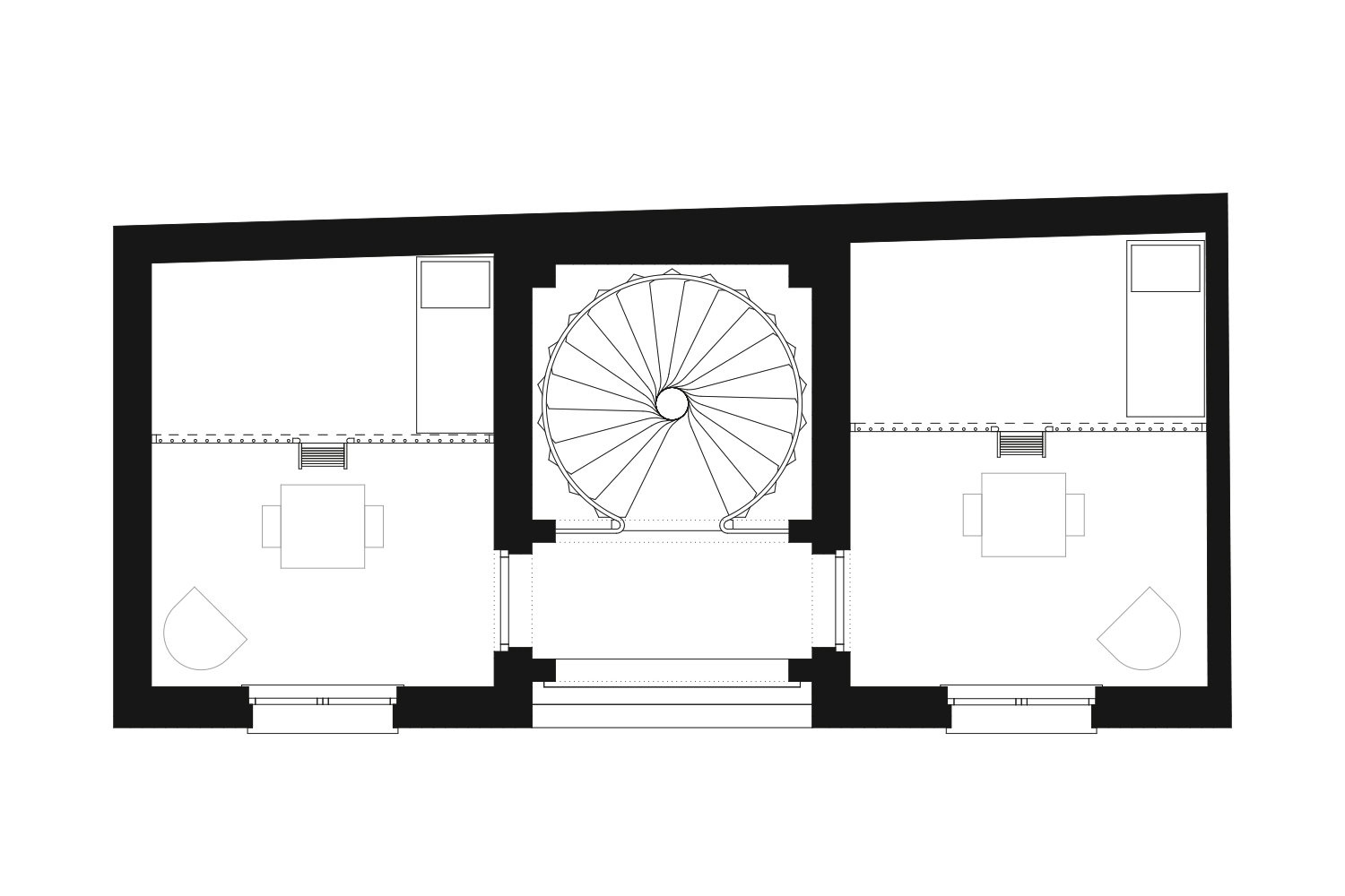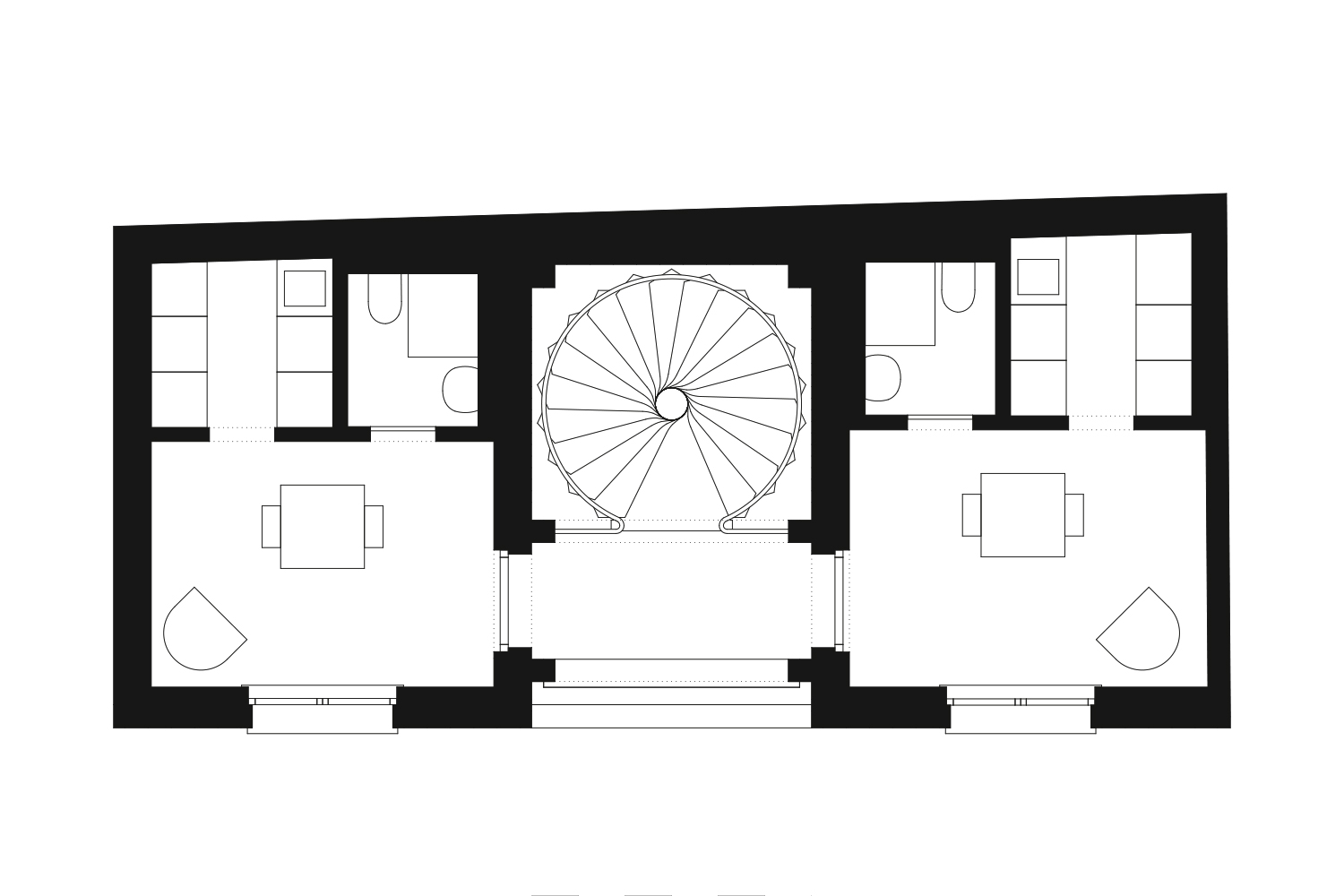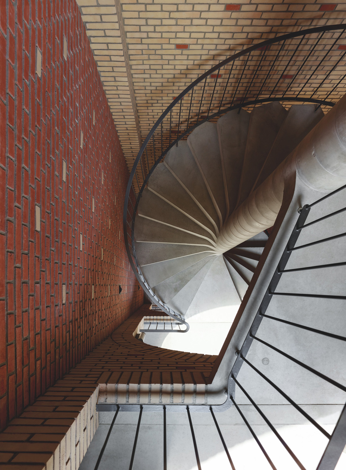Materialität und Farbigkeit des Ziegels binden das Haus nicht nur in die direkte Nachbarschaft zurück. Zugleich verweisen Sie auf die alten Institutsgebäude der Universität Bonn, wie zum Beispiel die Neue Anatomie (1868–1872, August Dieckhoff, Jacob Neumann) oder das Physiologische Institut (1875–1878, Jacob Neumann). Eine der Vorstellung vorbehaltene Korrespondenz der Orte also, welche auf der Verwandtschaft von Widmung, Materialität, und Farbigkeit gründet. Im Inneren verfügen die sechs Appartements jeweils nur über einen Raum, in welchen ein Funktionskörper aus Bad, Küche und darüberlegender Schlafempore eingestellt ist. Auch das Mosaikparkett rekurriert in symbolischer Weise auf die Vorstellung einer ursprünglich textilen Raumbildung.