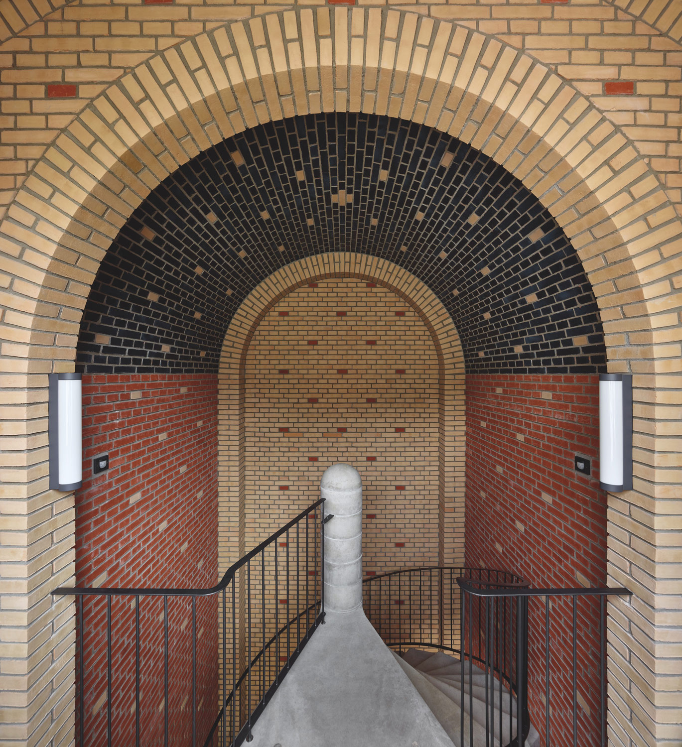 Das Haus im Burggarten führt nicht nur die im Eckhaus untergebrachte Nutzung von studentischem Wohnen fort. Es greift in variierter Form auch das Motiv des Eingangsgewölbes auf und führt das Thema auf Grund der geringen Grundstücksgröße in die Vertikale. Durch die Konstruktion, die Farbigkeit des glasierten Materials, aber auch durch die dekorierend eingemauerten gelben Klinker spannt die Tonne hier zeichenhaft ein imaginäres Himmelszelt über den zentralen Raum des Hauses. Die zweifarbig kontrastierende Betonung des Mauerwerkverbandes rekurriert dabei im weiteren Zusammenhang auch auf die Vorstellung einer ursprünglichen, textilen Raumbildung (vgl. Gottfried Semper).