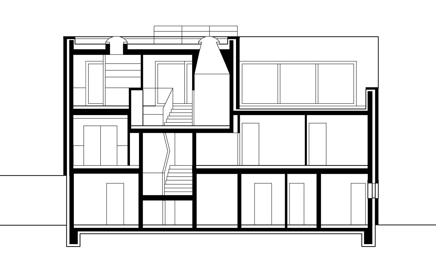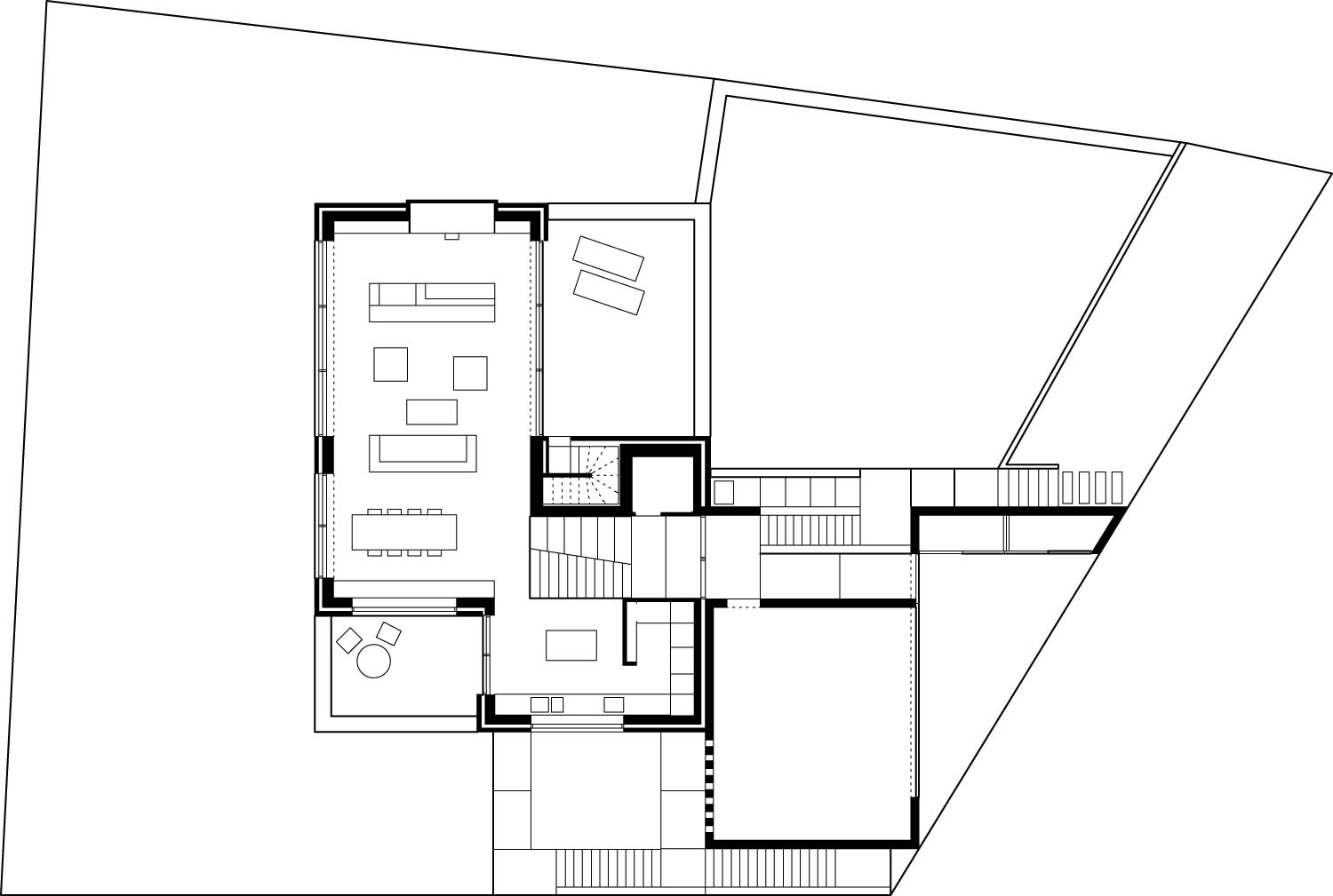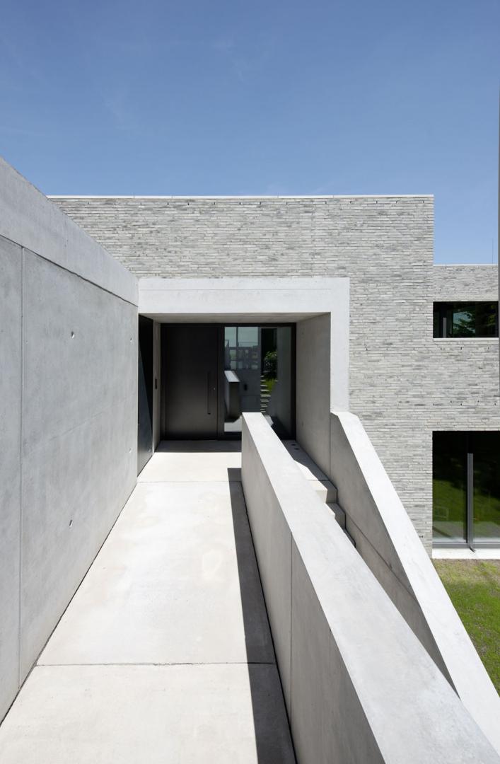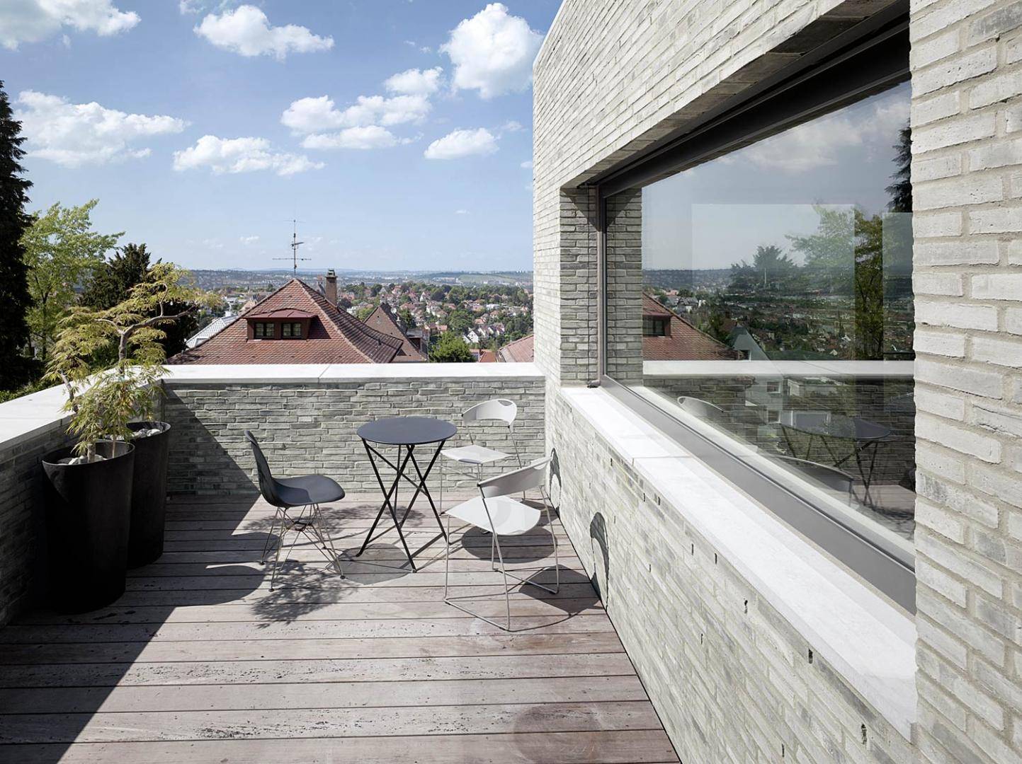 An einer der zahlreichen innerstädtischen Hanglagen von Stuttgart, mit Blick auf das Neckartal, positioniert sich das Haus K als oberstes Haus am Ende einer Sackgasse in direkter Nachbarschaft zum Waldrand. Das dreigeschossige Gebäudevolumen mit seinen eingeschnittenen Terrassen reagiert vielfältig auf die Topographie des Ortes und fügt sich mit seinem Sichtmauerwerk aus dünnformatigen, grauen, wassergestrichenen und kohlegebrannten Ziegeln als scharfkantige, monolithische Skulptur in seine Umgebung ein. Das Mauerwerk mit seinen individuell gebrannten Steinen und deren changierenden Grautönen erzeugt ein hohes Maß an Stofflichkeit und Wärme und verleiht dem Baukörper seine natürliche Lebendigkeit im Kontrast zur klaren und kubischen Architektursprache.