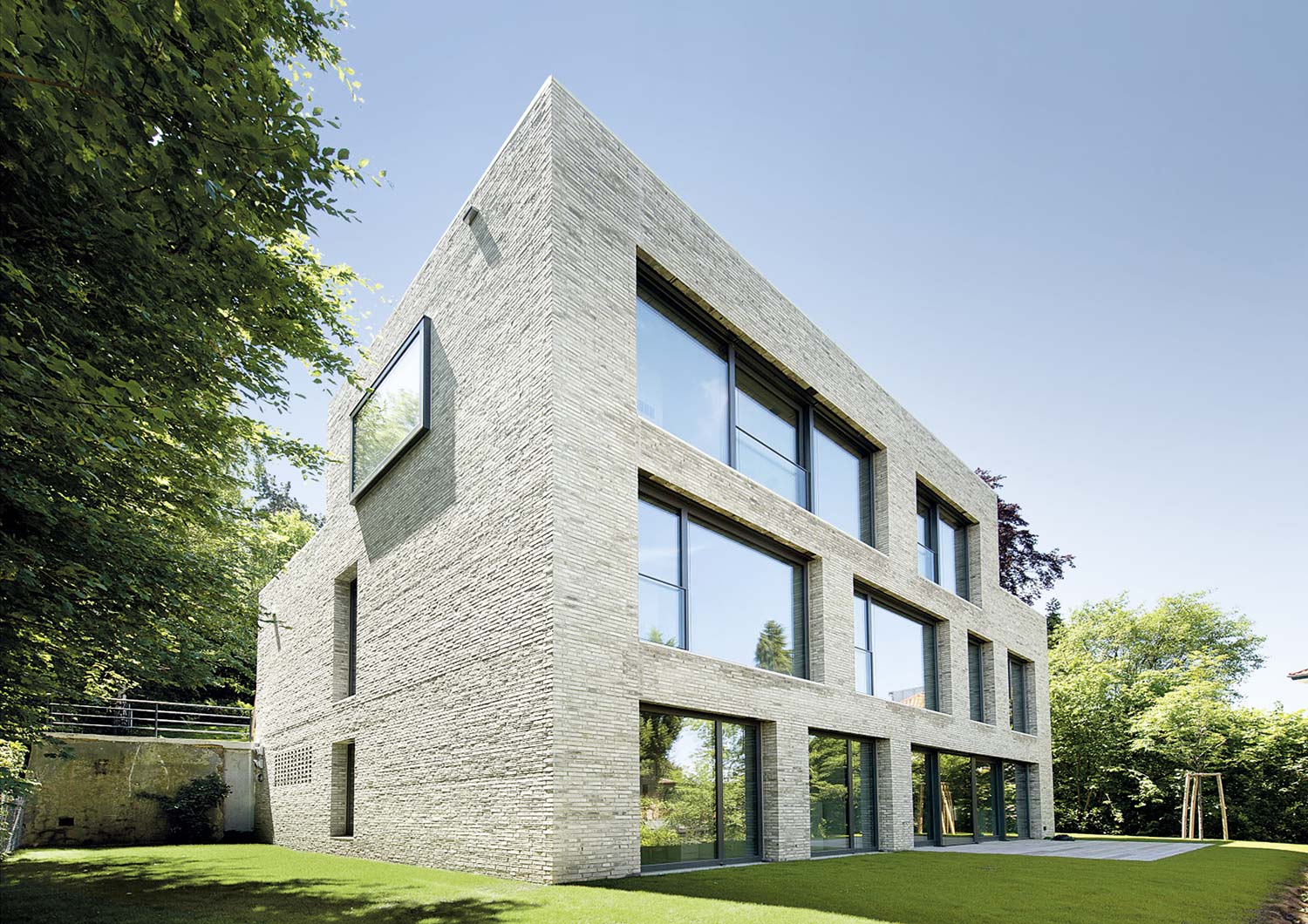 Das Wohnhaus in bester innerstädtischer Hanglage passt sich mit seinem grau changierenden Backsteinmauerwerk harmonisch an seine Umgebung an.